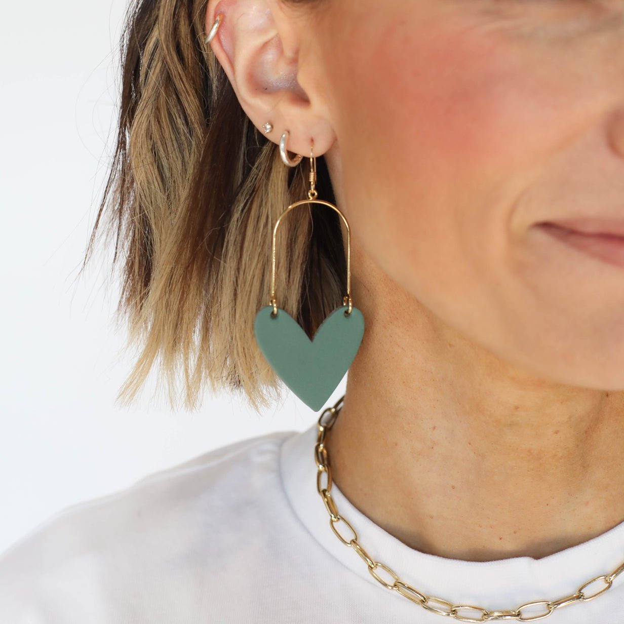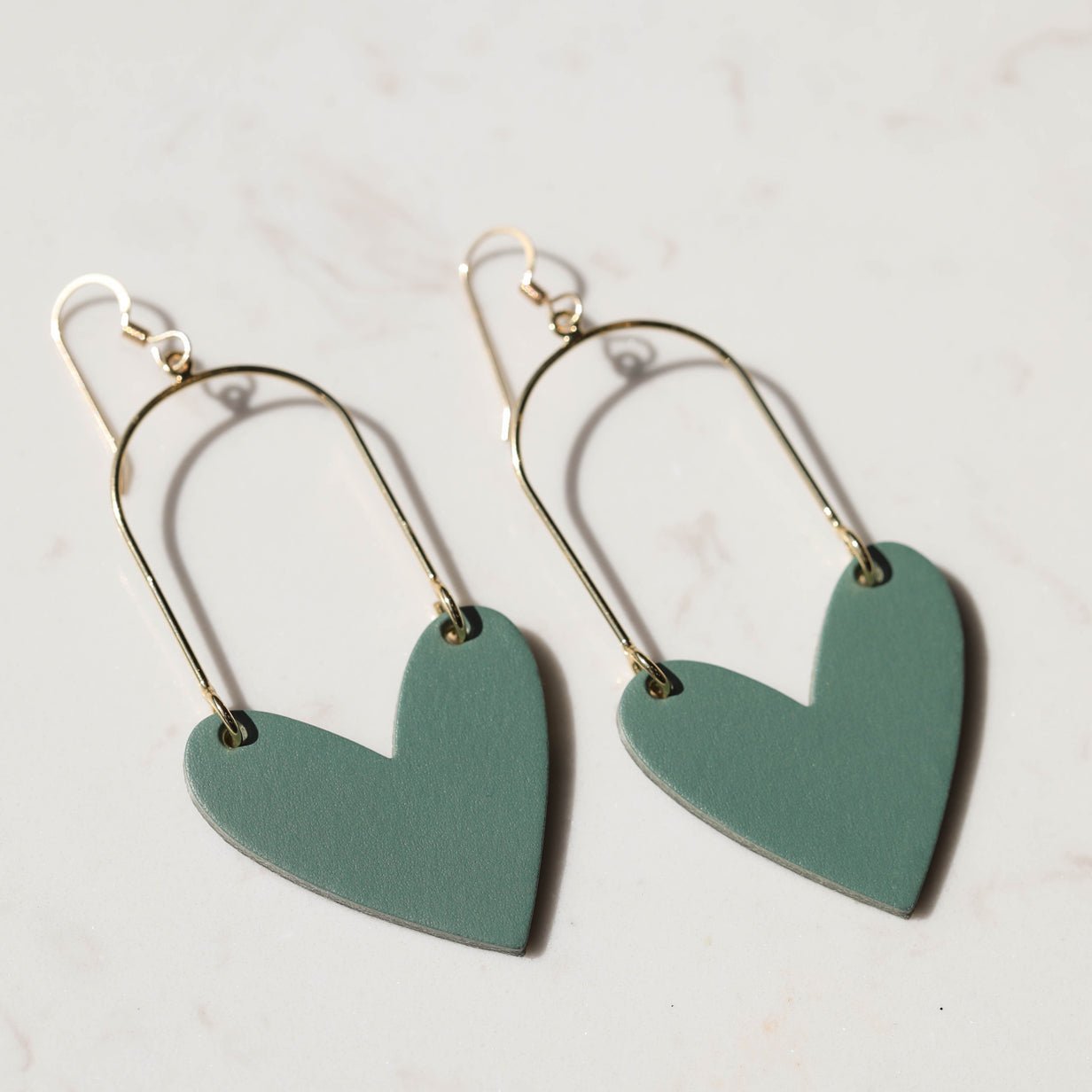 Agave Sweethearts feature a smooth green leather. These lightweight statement earrings feature our patented leather heart shape with the option of gold or silver hoop hardware.