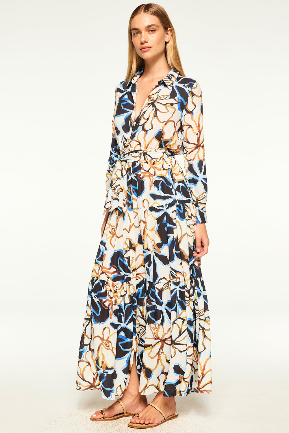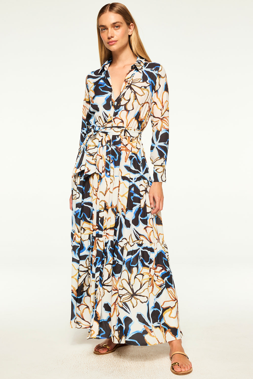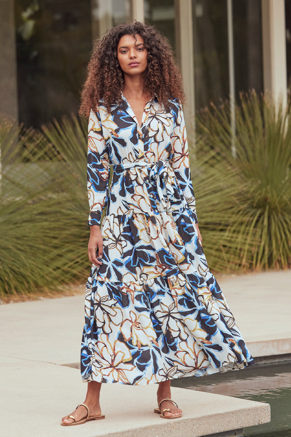 Alberta is an effortless daytime maxi shirt dress in our Bold Blooms printed crepe. Full button-placket front with a wide ruffle hem and elasticated waist with an optional self-tie belt. A foldover collar and long sleeves with button cuffs. Side slit pockets. This is an easy dress you'll turn to for seasons to come.
