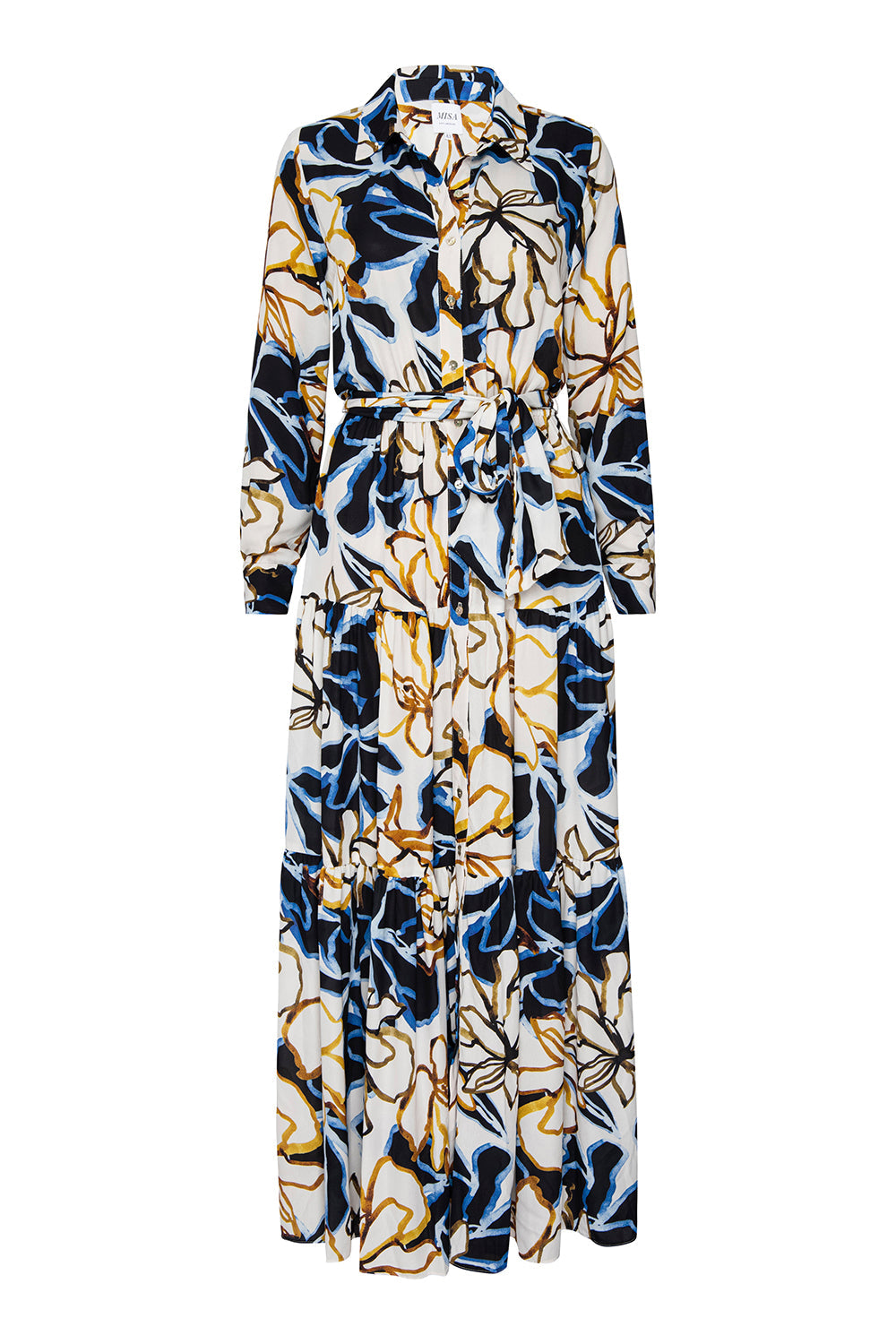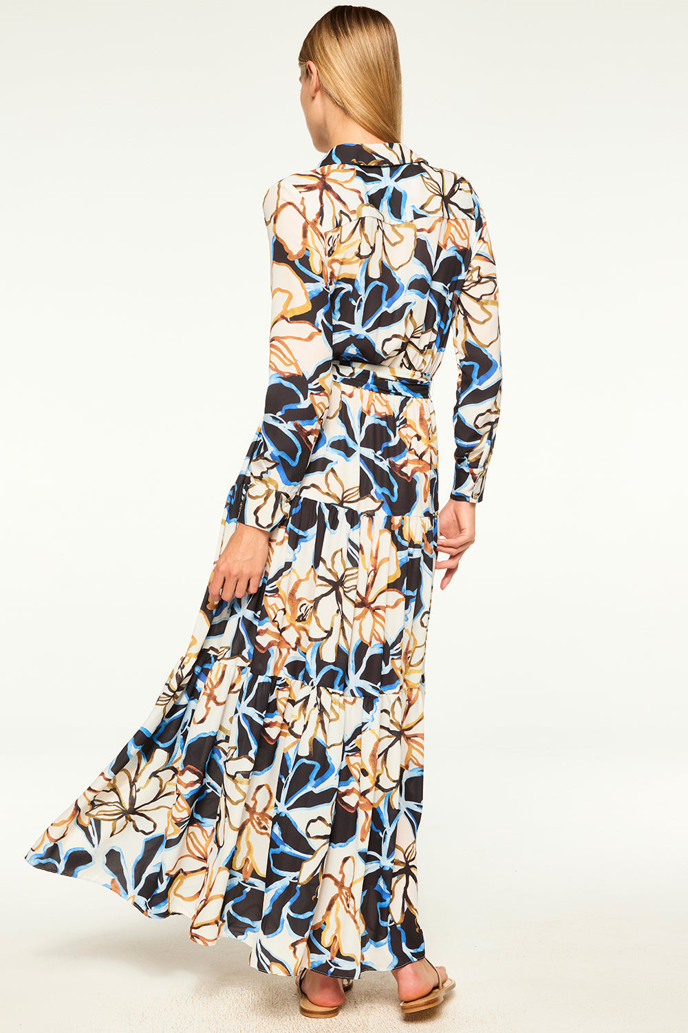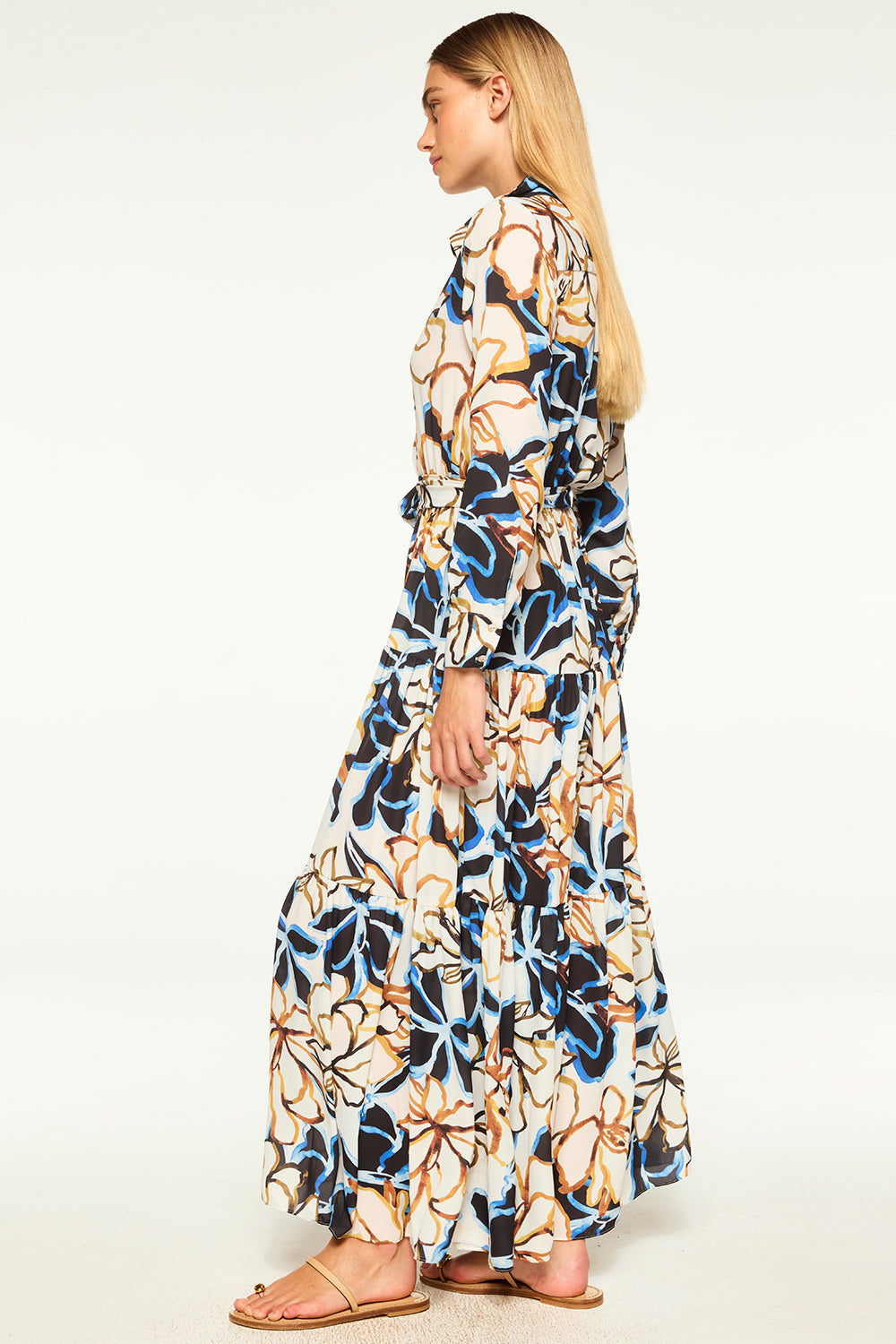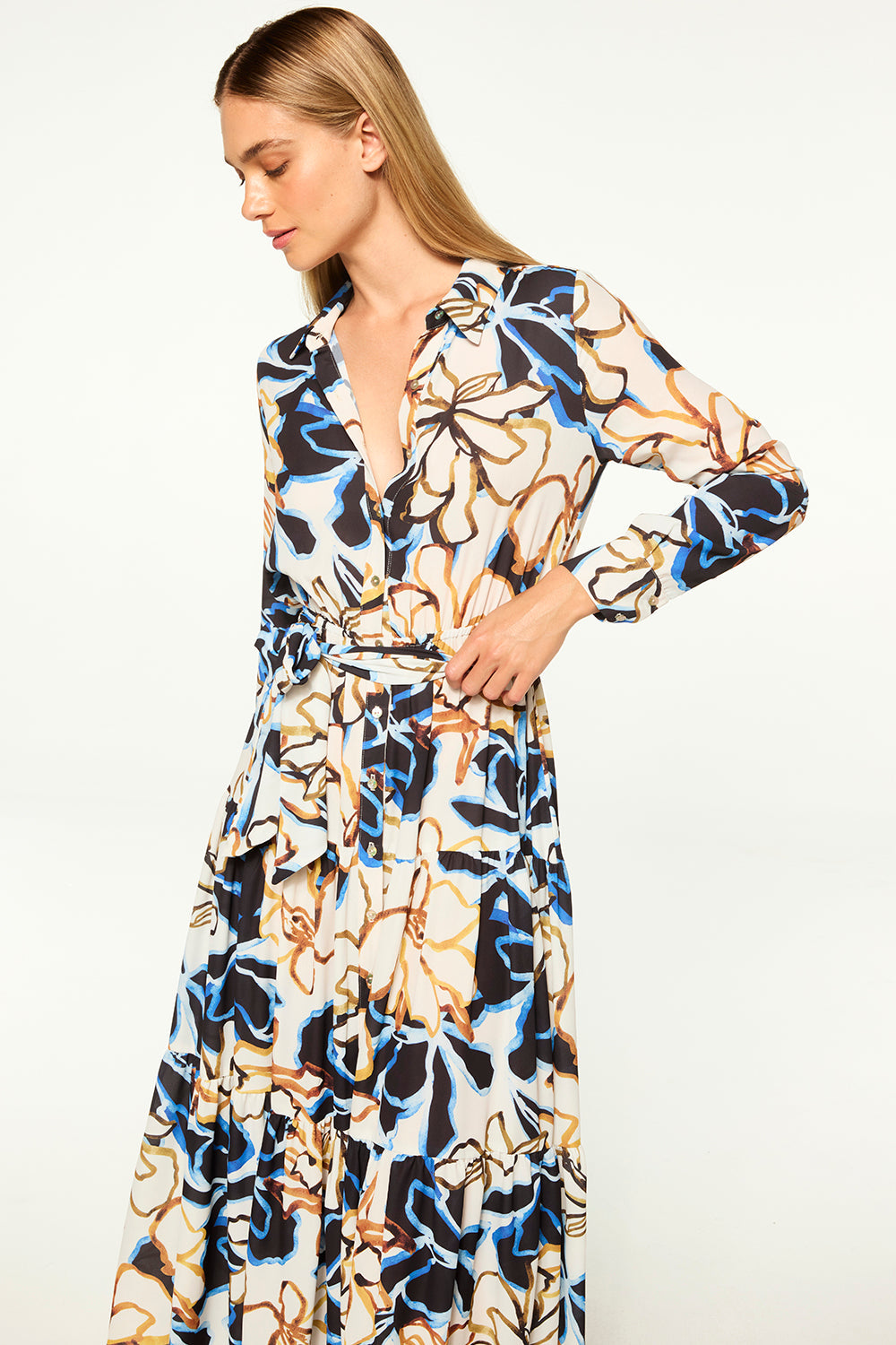 Alberta is an effortless daytime maxi shirt dress in our Bold Blooms printed crepe. Full button-placket front with a wide ruffle hem and elasticated waist with an optional self-tie belt. A foldover collar and long sleeves with button cuffs. Side slit pockets. This is an easy dress you'll turn to for seasons to come.