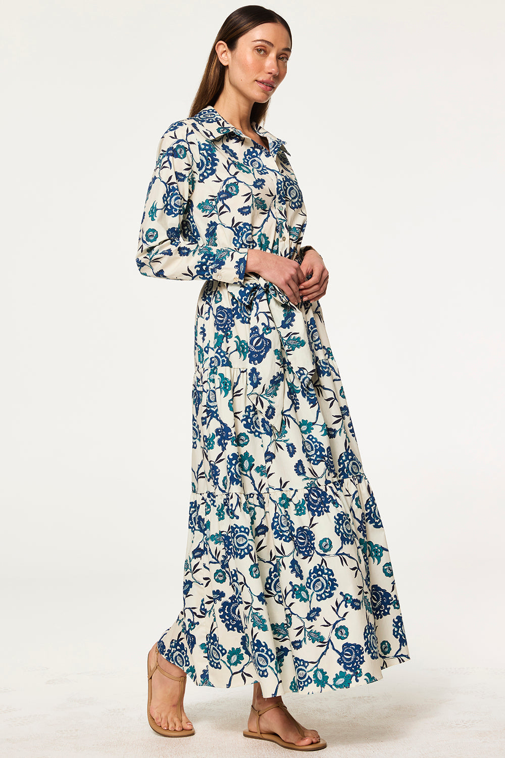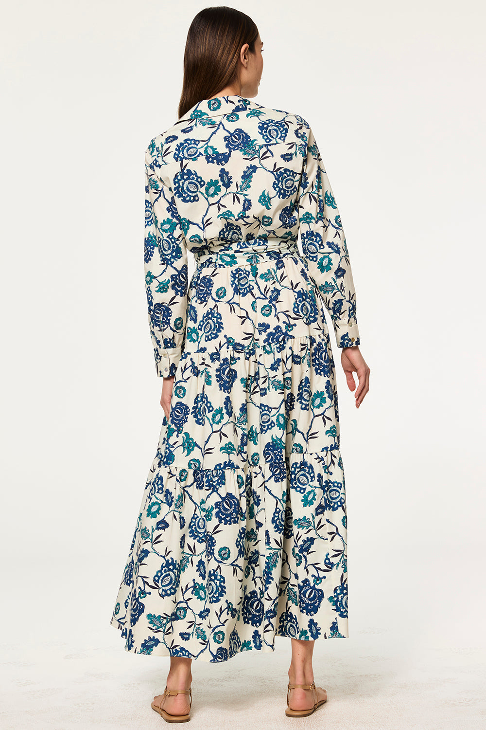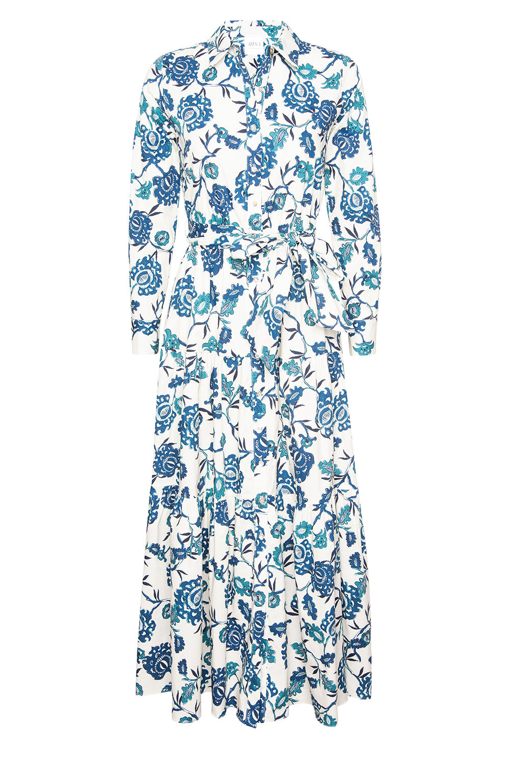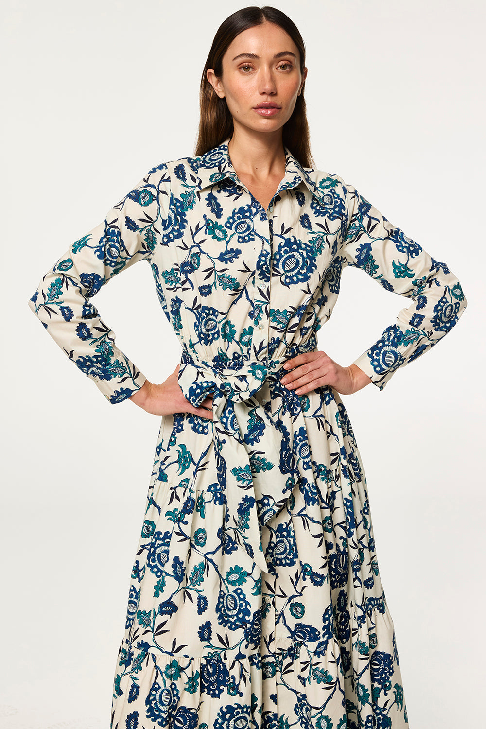 Alberta is an effortless daytime maxi shirt dress cut from cotton poplin in our Indigo Blooms print. Designed with a fold-over collar, full button front, and long sleeves with button cuffs, it features an elasticated waist with an optional self-tie belt for a flattering cinch. A wide ruffle hem and side slit pockets complete the look. This easy, versatile style is one you’ll reach for season after season.