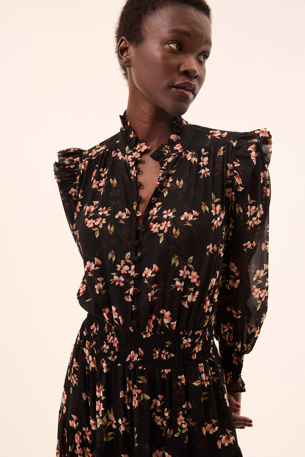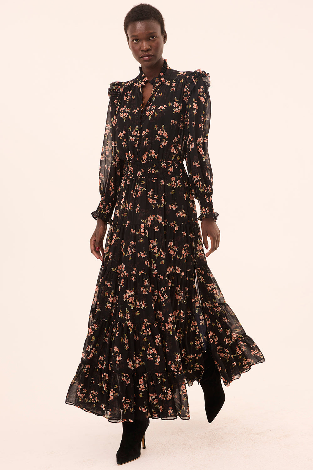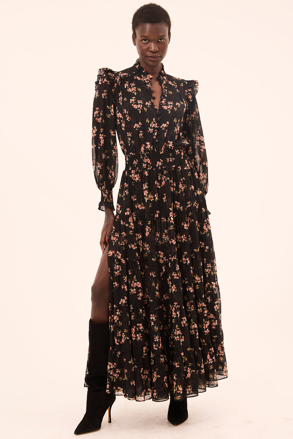 The Alisia is the perfect fall maxi, cut from our classic Autumn Cluster printed chiffon. Designed in an elegant shirt-dress silhouette, it features a stand ruffled collar, long sheer blouson sleeves with smocked ruffle cuffs, and delicate shoulder ruffles. A covered hook-and-loop button placket runs to a wide smocked waistband, creating a flattering shape. The tiered ruffle skirt is double-lined with double side slits for added movement. A versatile transitional piece, it pairs effortlessly with everything from boots to flats.