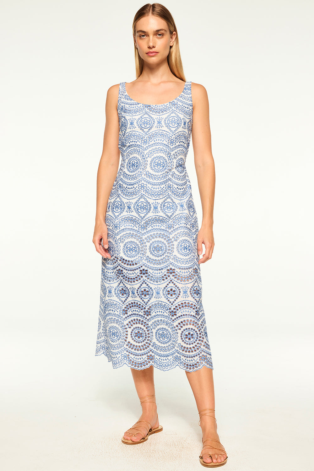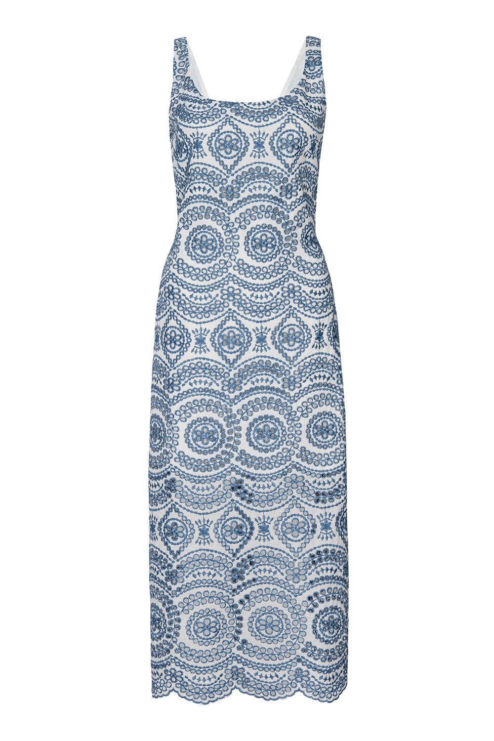Our new Alondra dress is a feminine midi silhouette cut from a lovely blue and white embroidered eyelet. This sleeveless style features a scoop neckline and scooped back cutout with smocking at the band. Lined to the mini length with a scallop detail hemline. Hidden side zip closure.