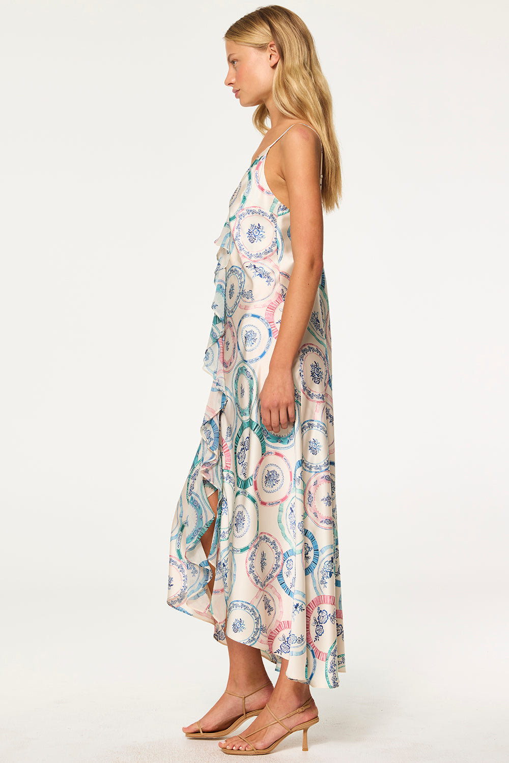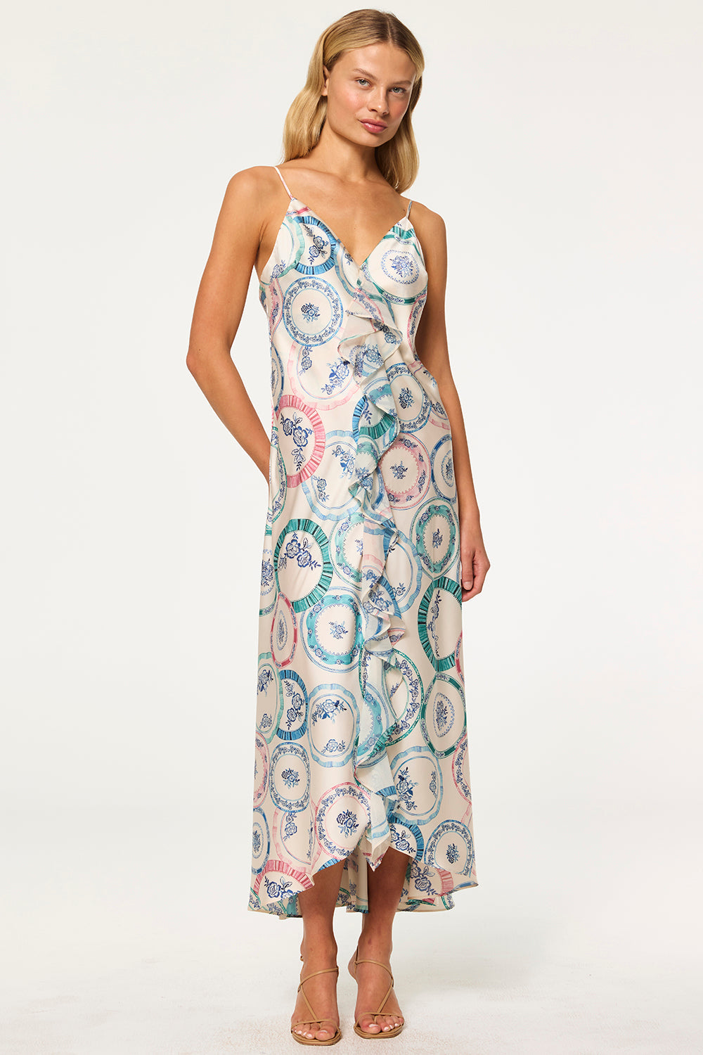 Angela is an ankle-grazing maxi slip cut from our silky Prismatic Plates–printed satin. Featuring a V-neckline and adjustable spaghetti straps, this fluid silhouette is finished with an asymmetrical hem, front slit, and delicate, contrast chiffon ruffle detailing along the front. Effortlessly elegant, it’s perfect for day-to-night dressing or your next special occasion.