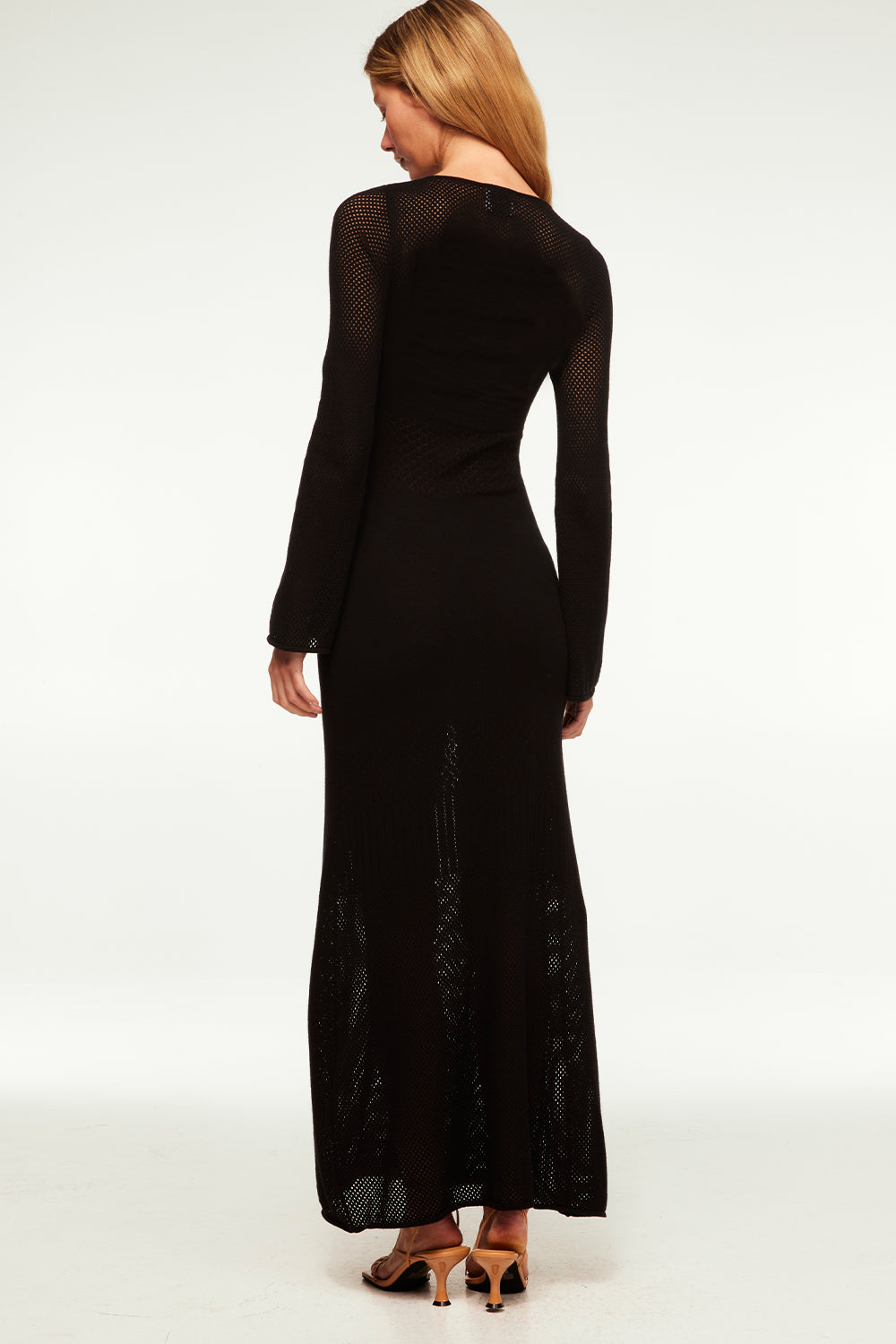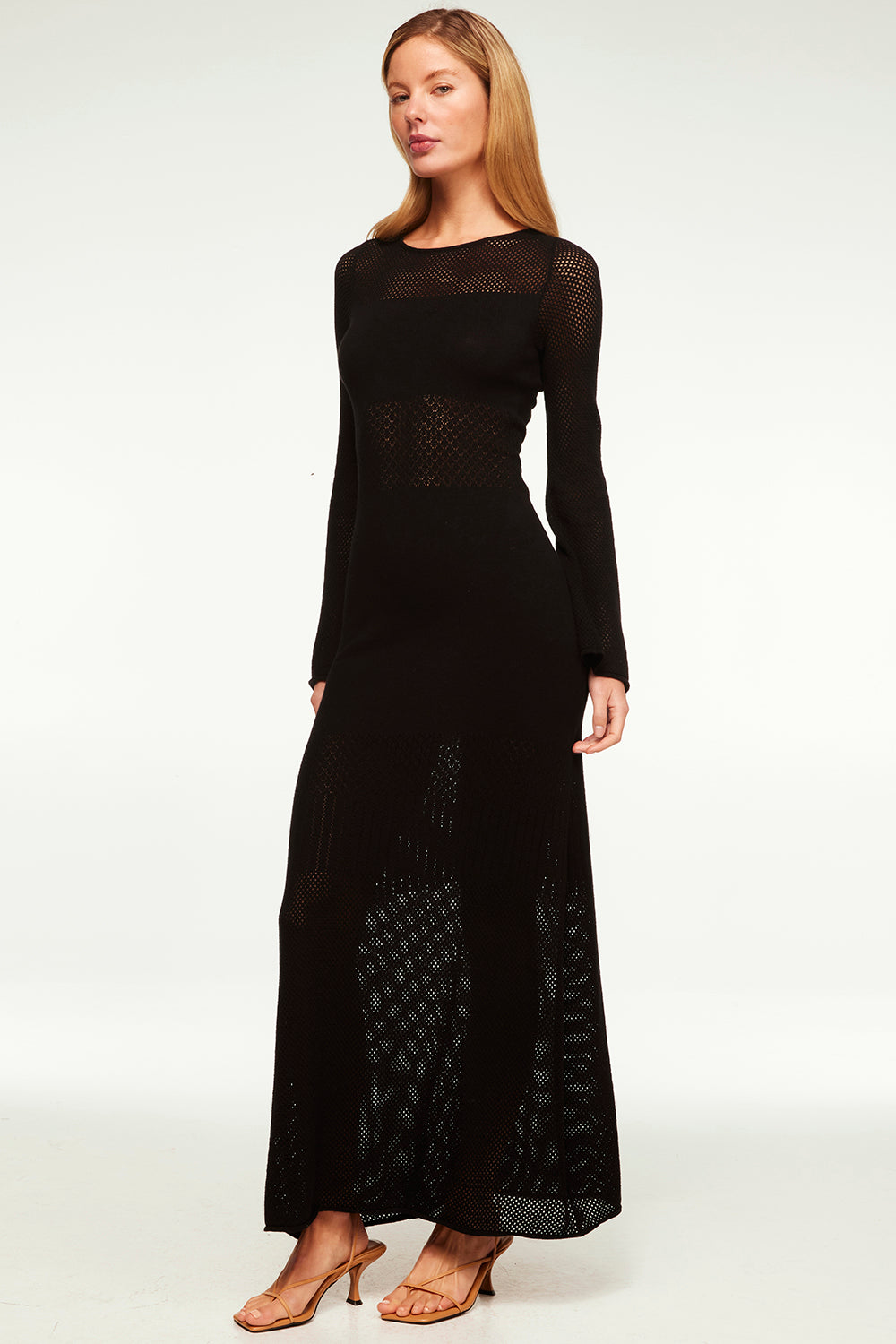 The Anu maxi knit dress is woven from the softest black cotton cashmere blend. This figure-hugging long sleeve silhouette features a high neckline with openwork crochet that leads into a solid body followed by the same bands of openwork crochet with a rolled hem. A variation of our popular Irene silhouette without the open back.
