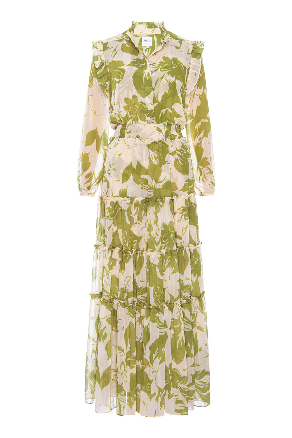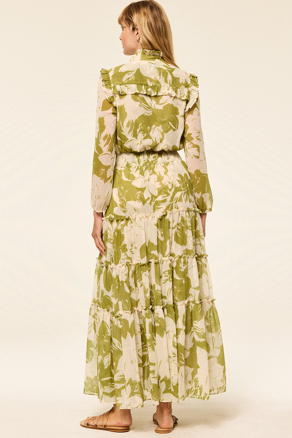 Arhea is our new soon to be favorite shirt dress in a gorgeous Green Goddess chiffon. Featuring a hidden button front placket and stand collar with ruffle trim detail. Shoulders feature the same ruffle detail and lead into sheer blouson sleeves with an elastic cuff. A smocked elastic waist leads into a lined maxi skirt with wide ruffle hem.