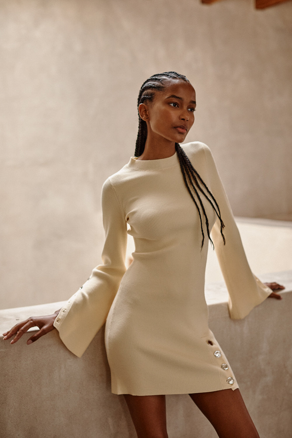 Arila is a figure-hugging, fine rib-knit mini dress in this season's must-have butter yellow. Long bell sleeves are accented with large silver buttons along the forearm that can be unbuttoned for a a chic look. A high crew neckline and side slit with the same silver buttons can also be opened to reveal more leg.