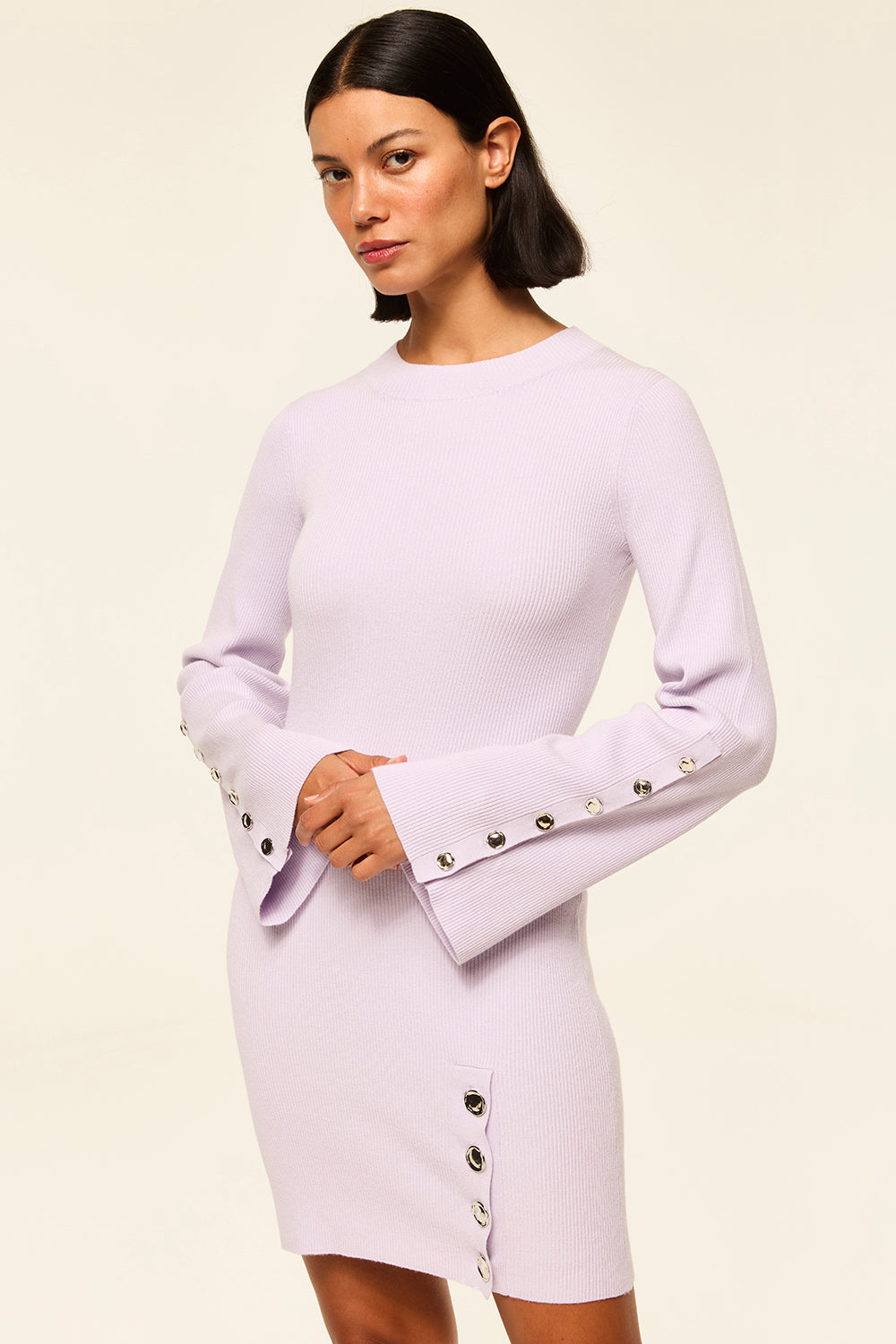 Arila is a figure-hugging, fine rib-knit mini dress in the prettiest shade of lilac. Long bell sleeves are accented with large silver buttons along the forearm that can be unbuttoned for a a chic look. A high crew neckline and side slit with the same silver buttons can also be opened to reveal more leg.