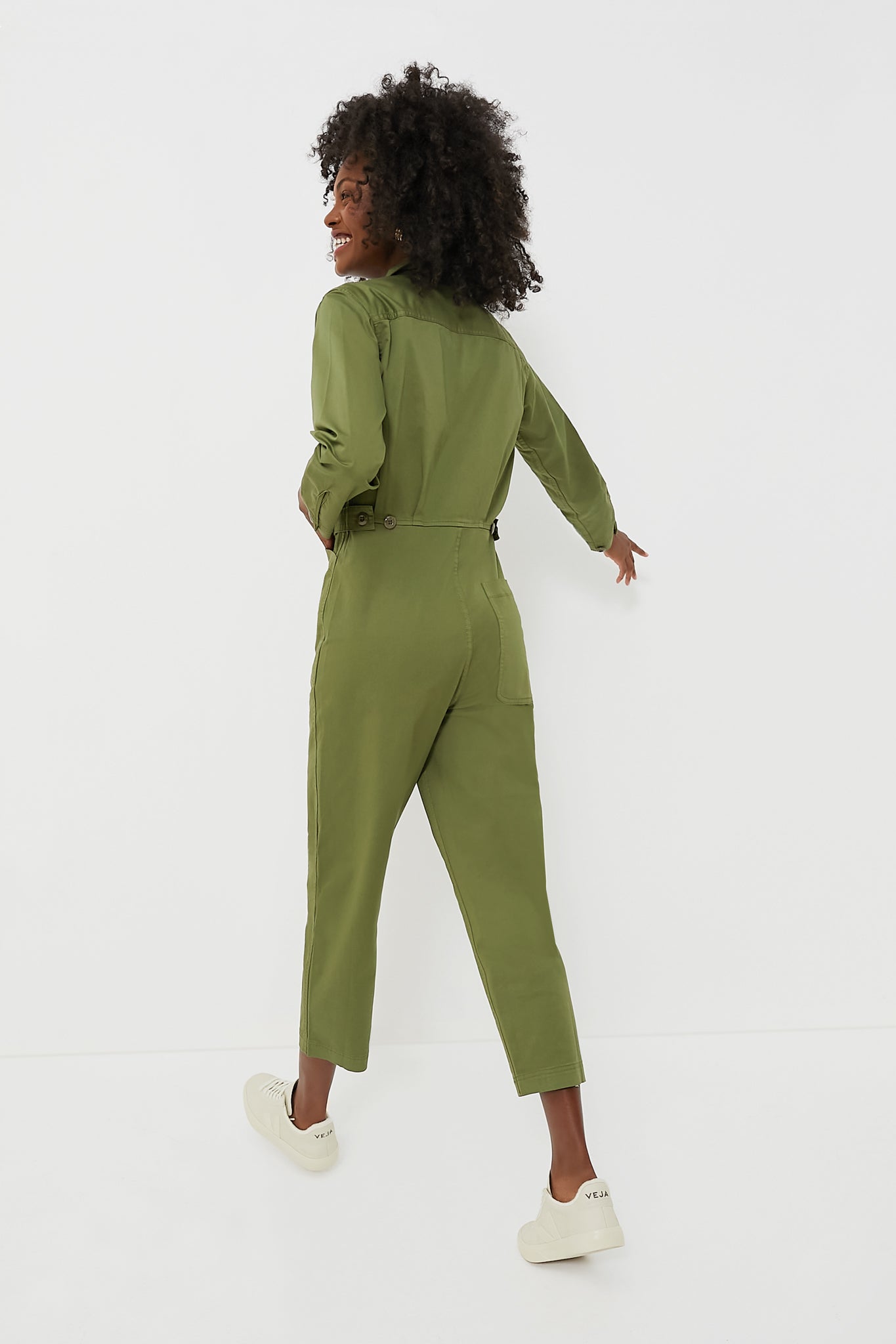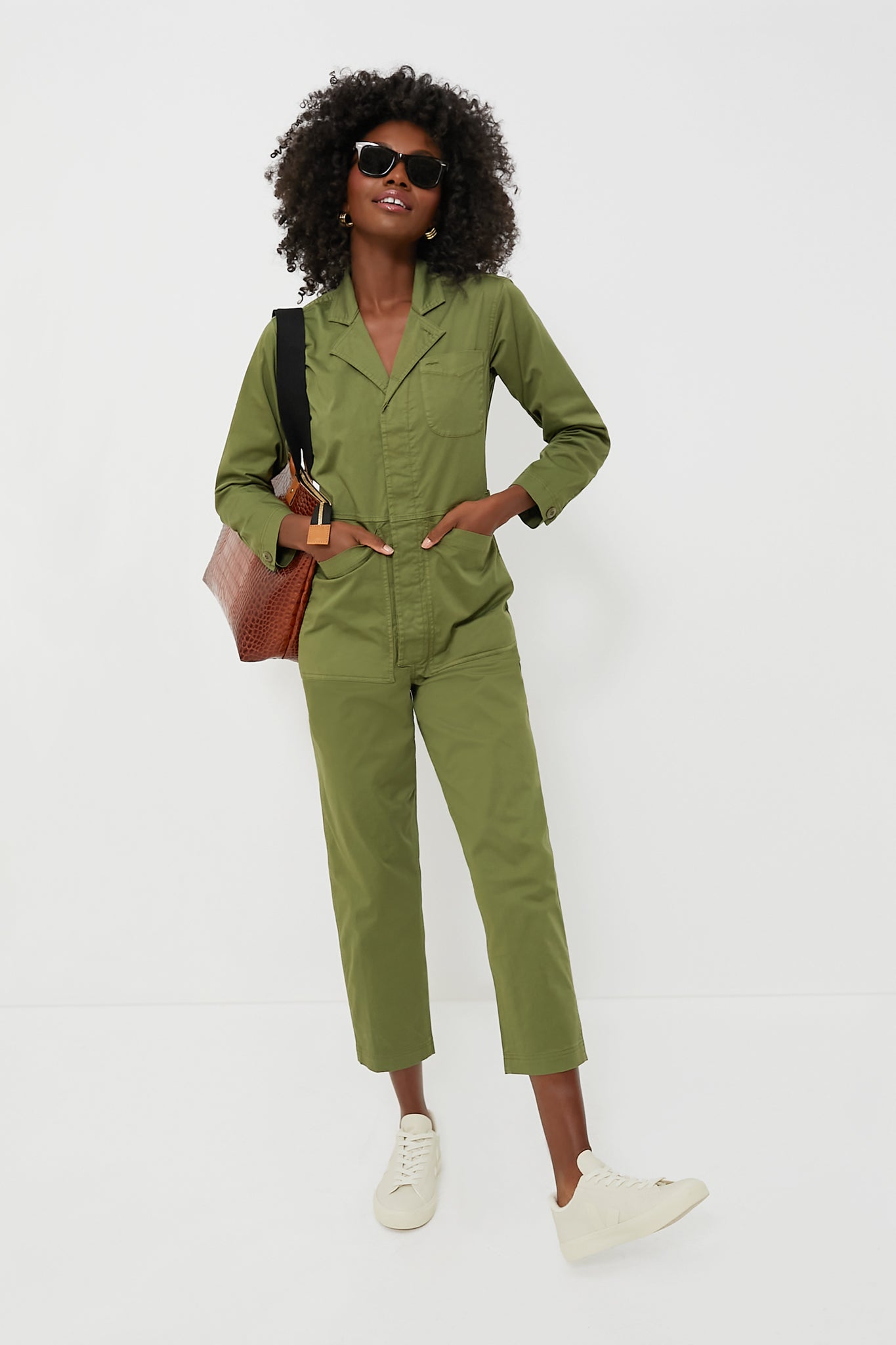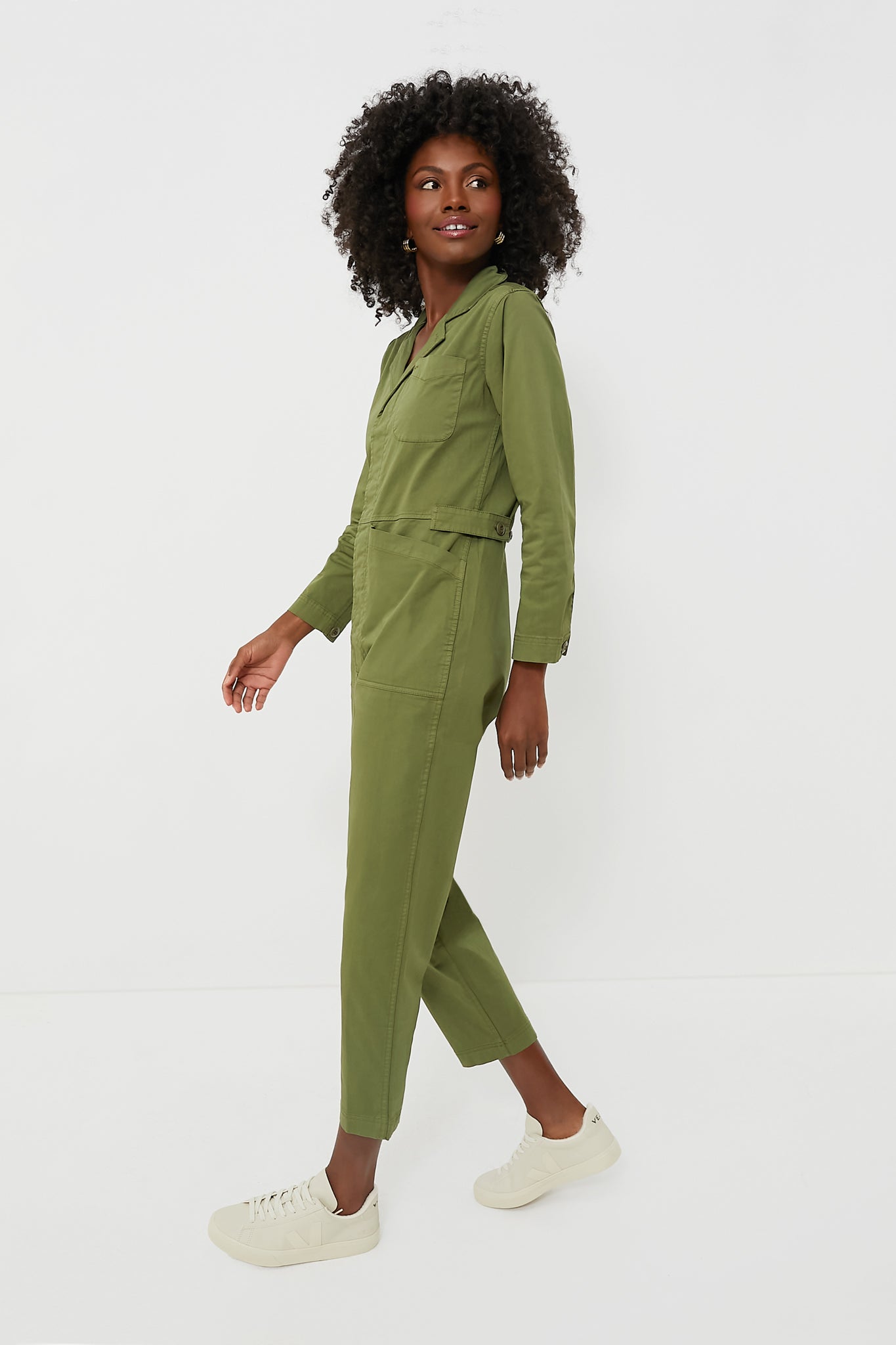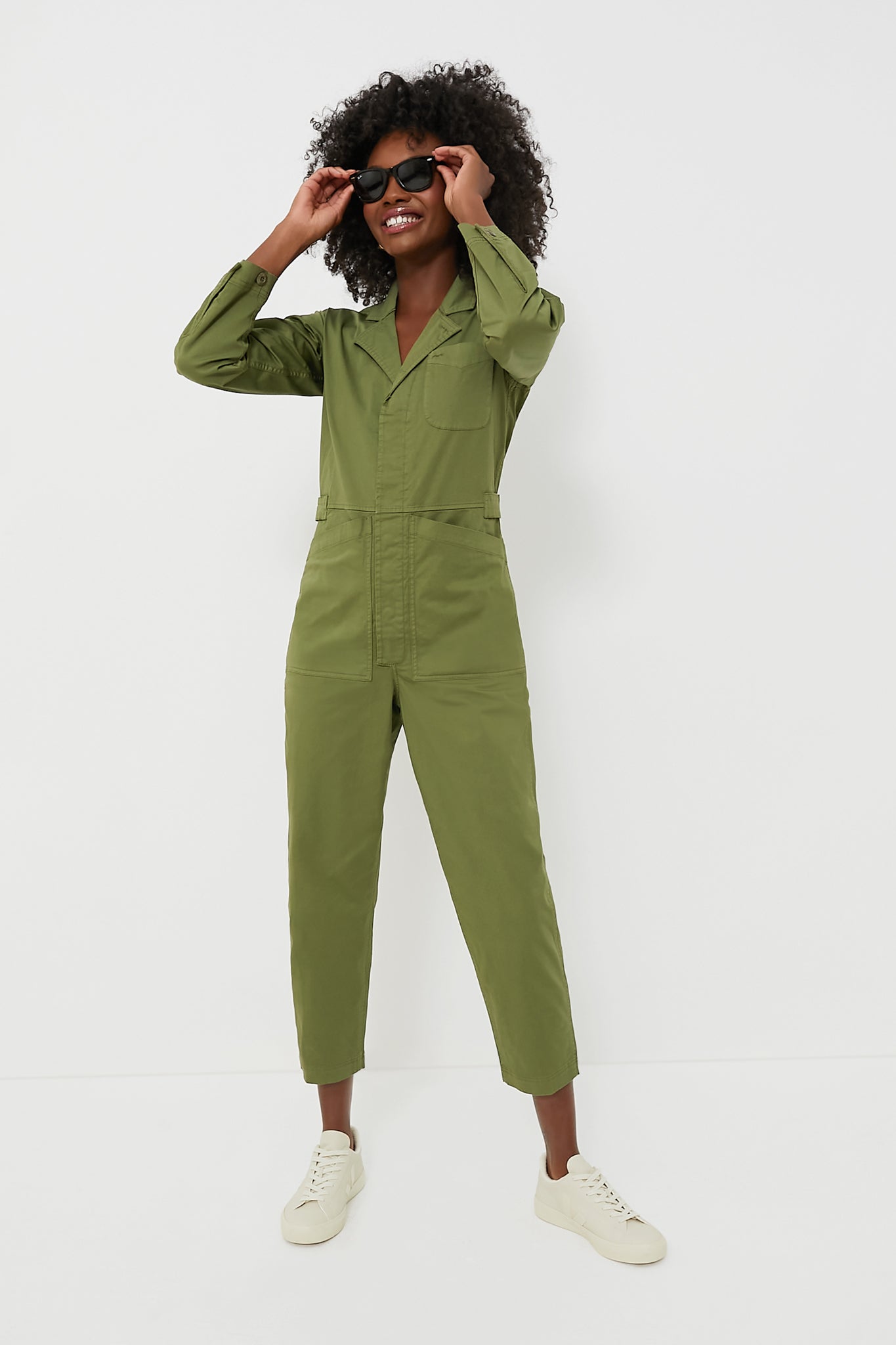 The incredible Army Green Standard Jumpsuit by Alex Mill is an ultimate girl-boss look. This vintage-inspired one piece creates an ultra-flattering shape with its cropped leg and adjustable waist tabs. Wear with a tee and sneakers for a casual-cool outfit, or with a belt and neck-tie for a chic street-style look!