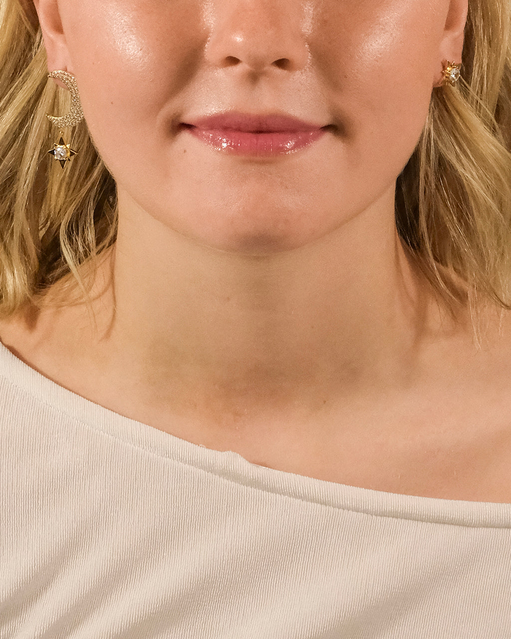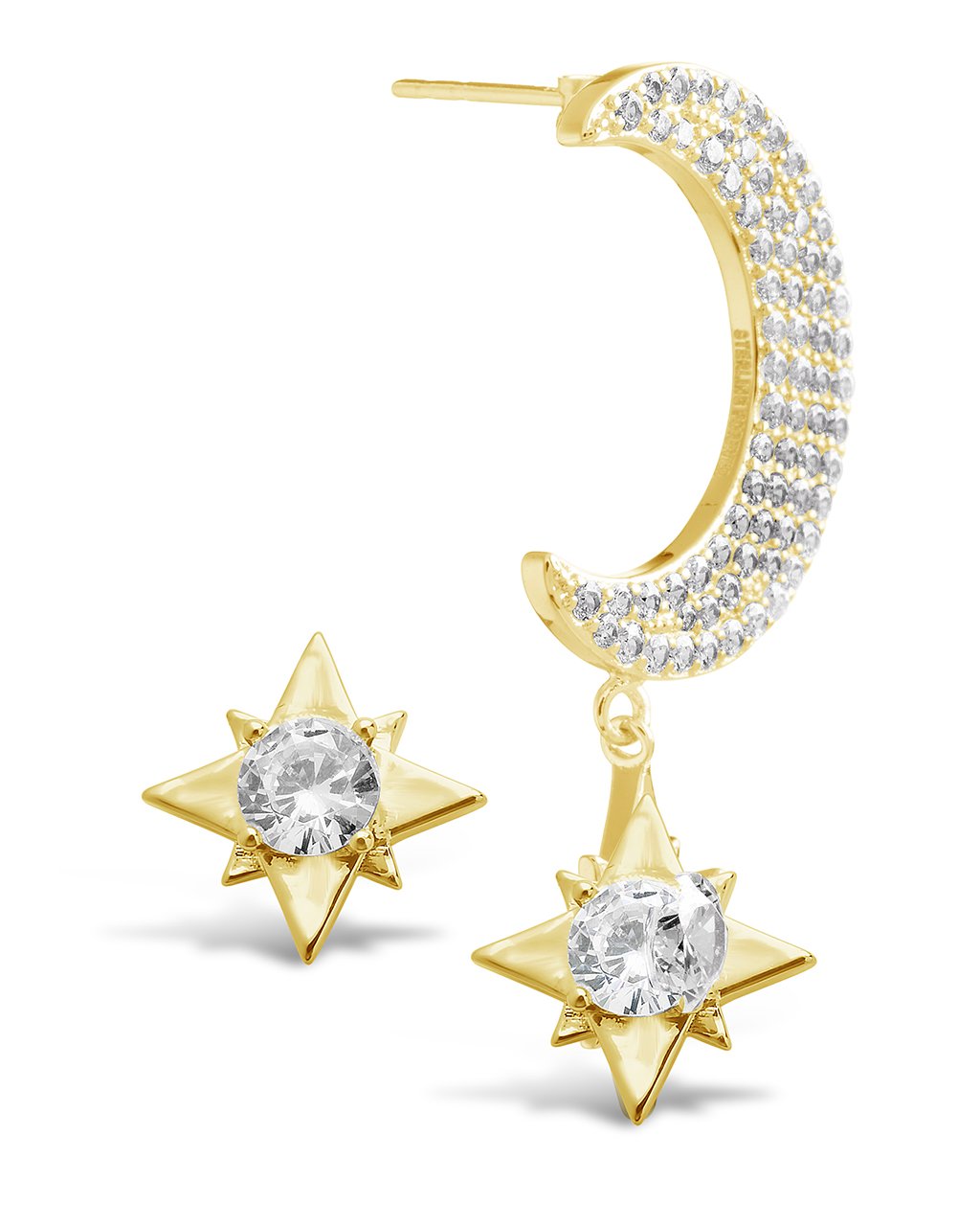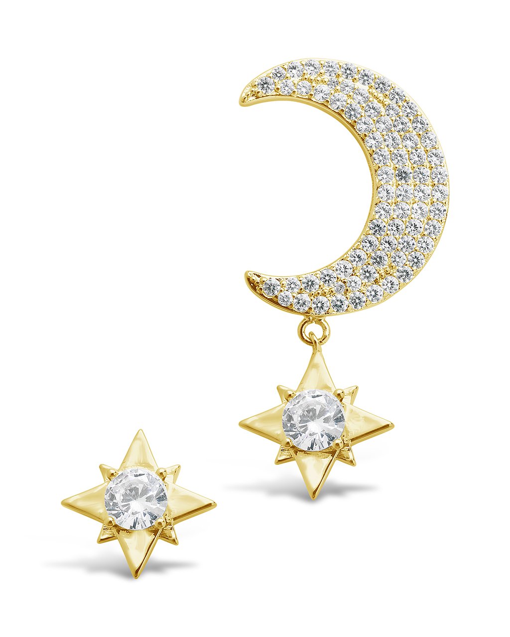 This celestial duo is perfect for a night out! The set features one starburst stud and one dazzling moon stud with a dangling star charm. Available in gold and silver tones.