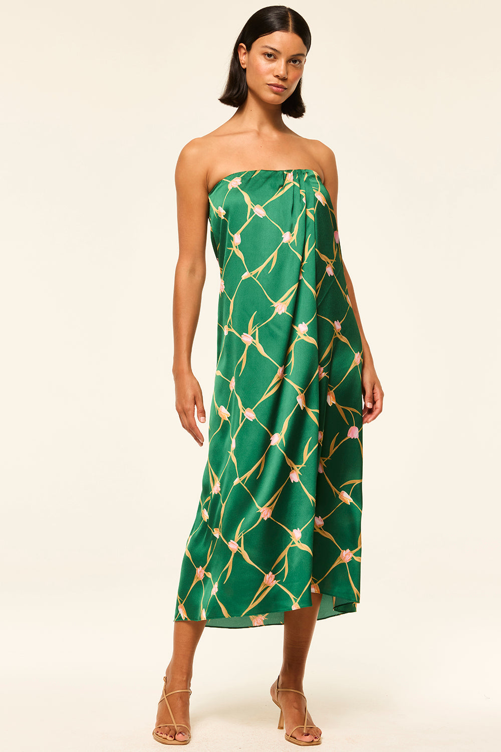 Aurelia is a modern strapless midi dress cut from a Tulip Lattice printed satin in a gorgeous shade of green. A flattering off-center pleat at the bust line gives a wrap dress appearance. An elasticated back with hidden side zip closure. Slightly asymmetric hem. Dress up with heels or pair with flat sandals for the perfect spring style.