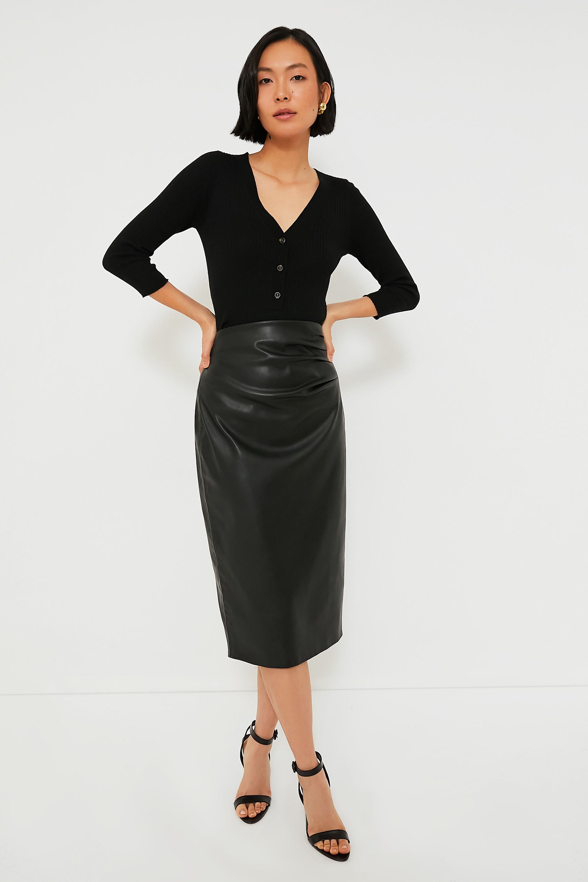 A sleek silhouette that is fitted through the waist and falls straight down from the low hip, the Black Leather Monica Skirt is exactly what your closet has been needing. With finishing touches like ruching that flatters the figure, a back zip closure for easy styling, and a daring back slit at the hem, this midi is the life of the party. Pair it with a tailored blazer and loafers for the office, with a bodysuit and heels for date night, and with fabulous accessories any time!