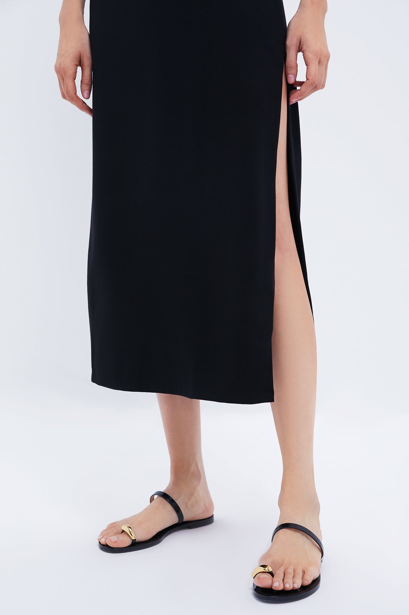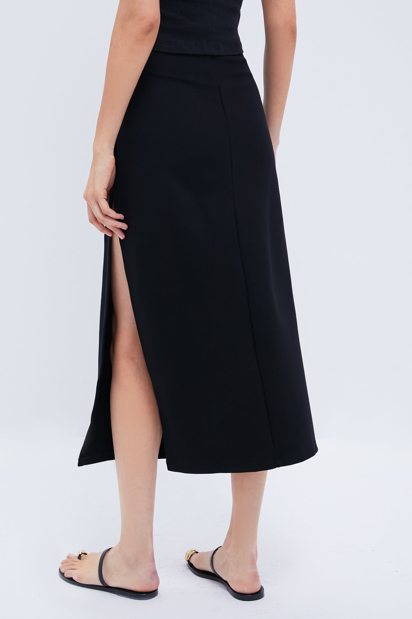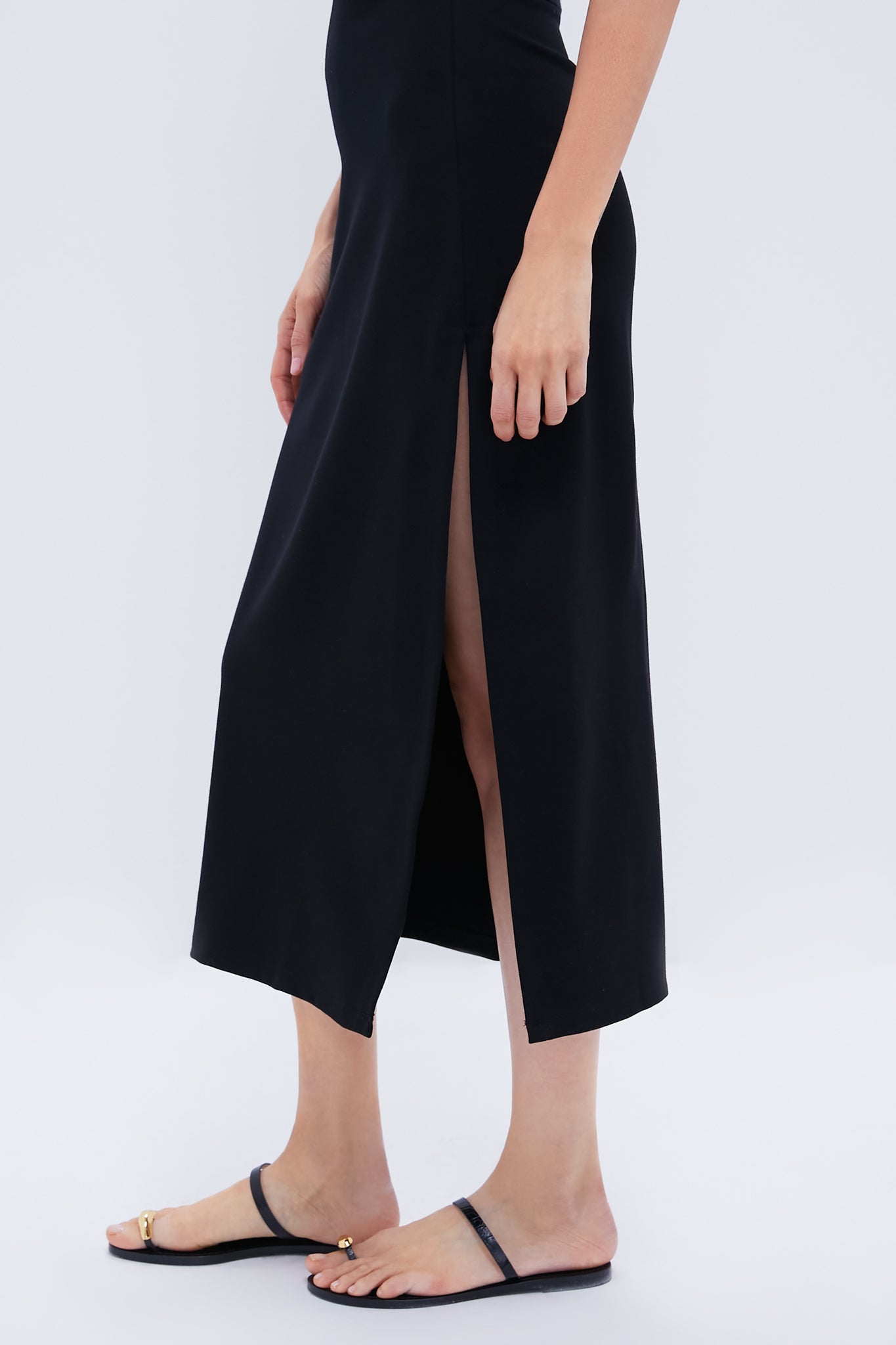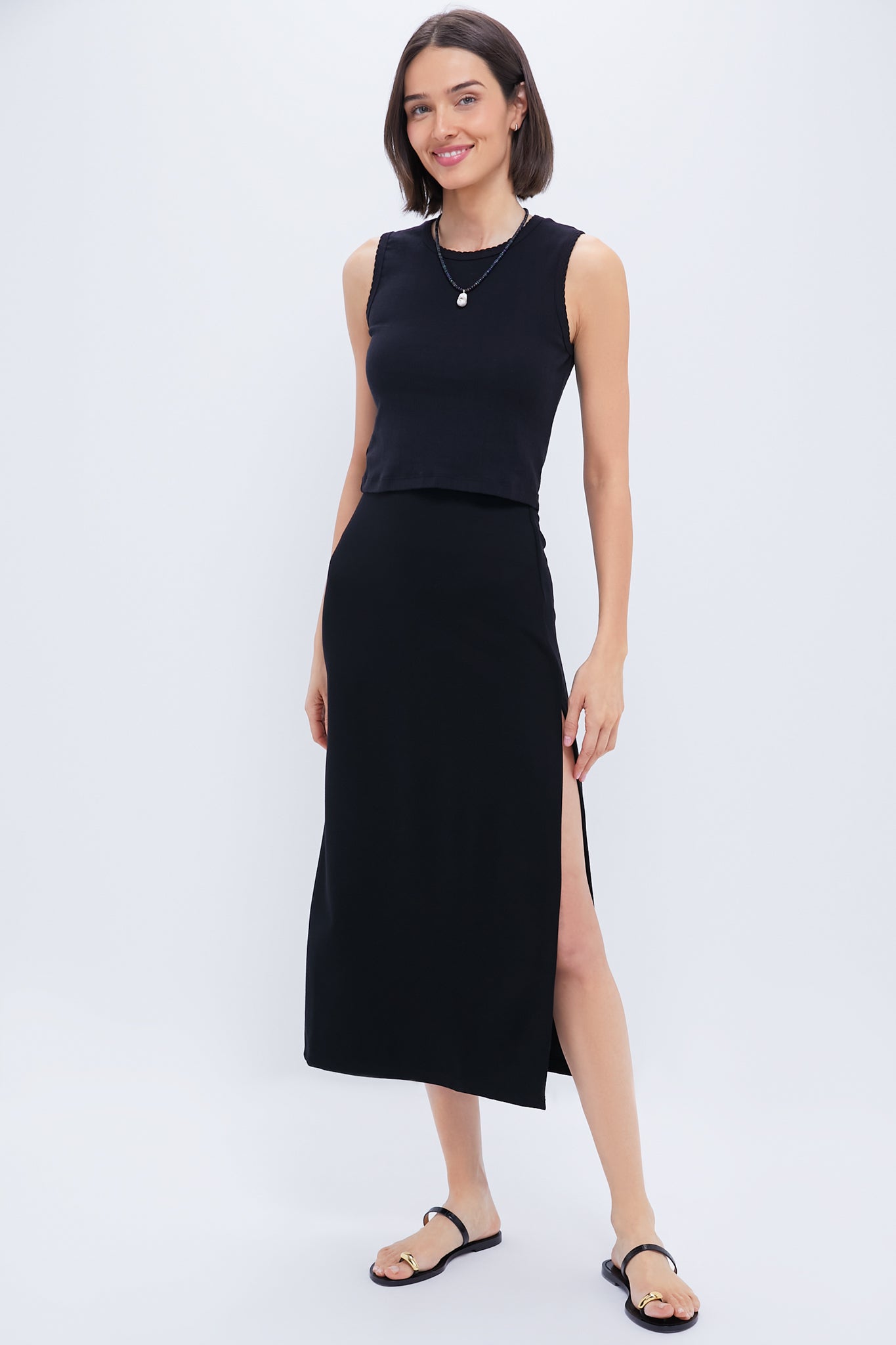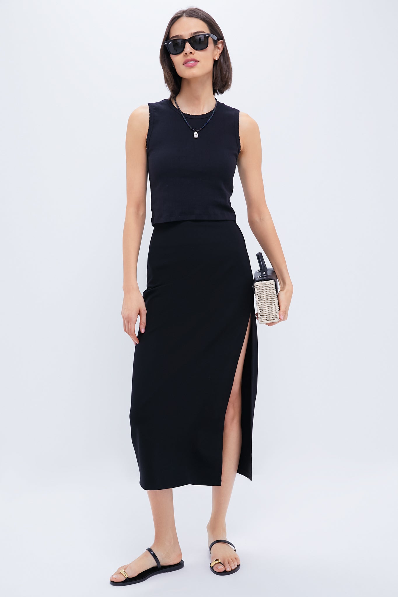 Cut in the brand's figure-cinching Ponte fabric, the Black Rio Side Slit Skirt is a pull-on style maxi that features a high waist and a mid-height side slit. We're wearing this with just about everything — from the matching Black Pointelle Sleeveless Crew to your fav tee, or even a swimsuit.