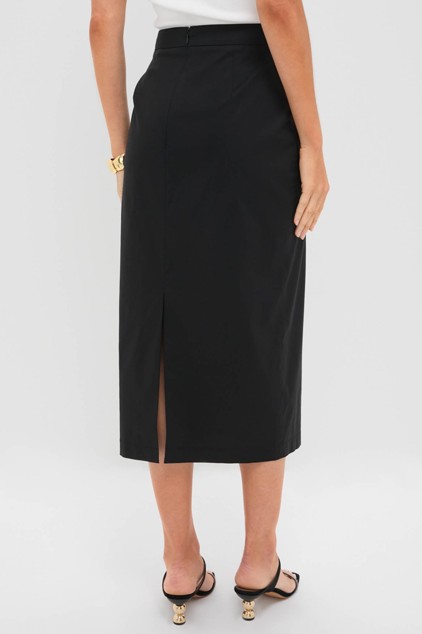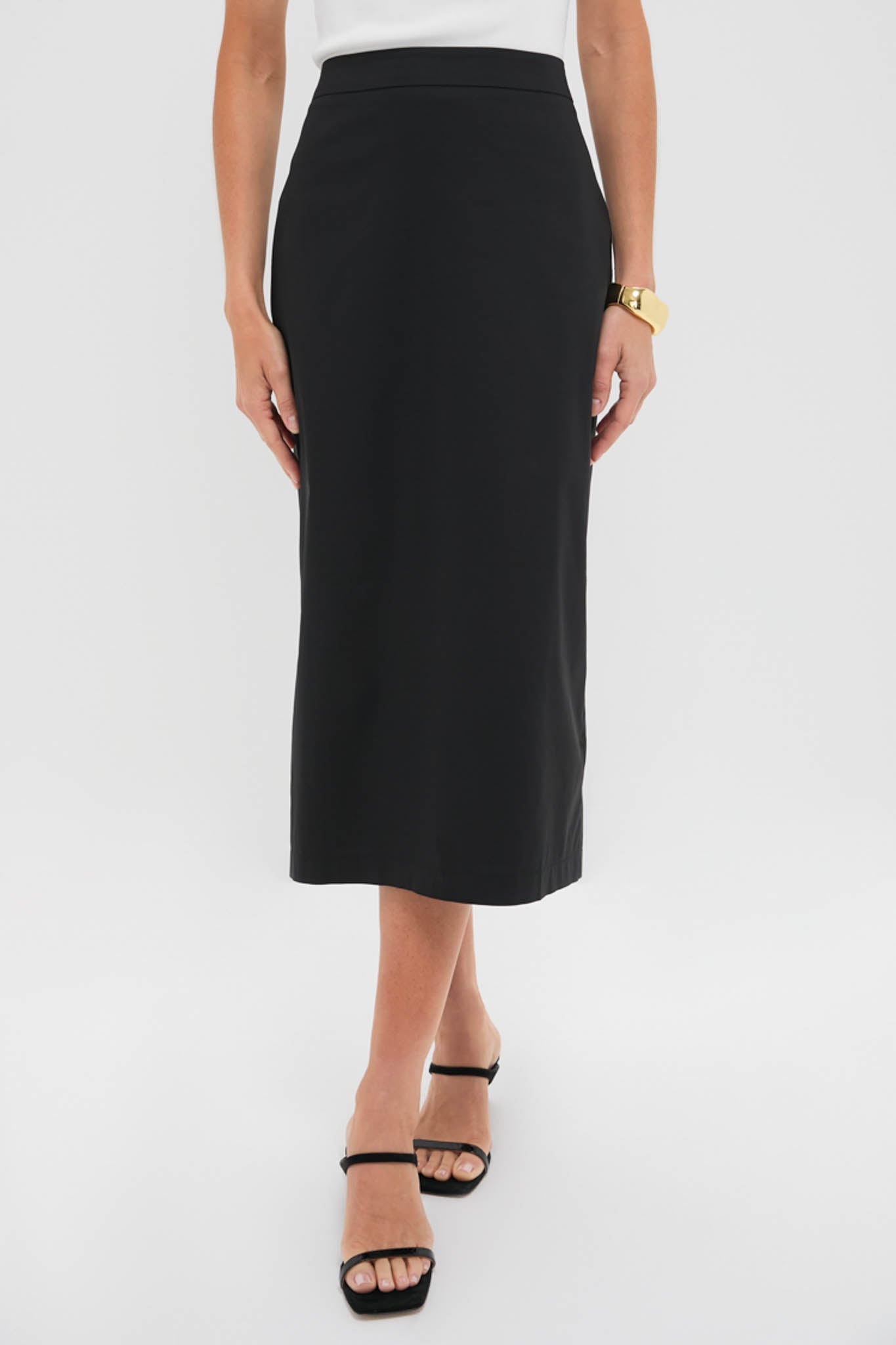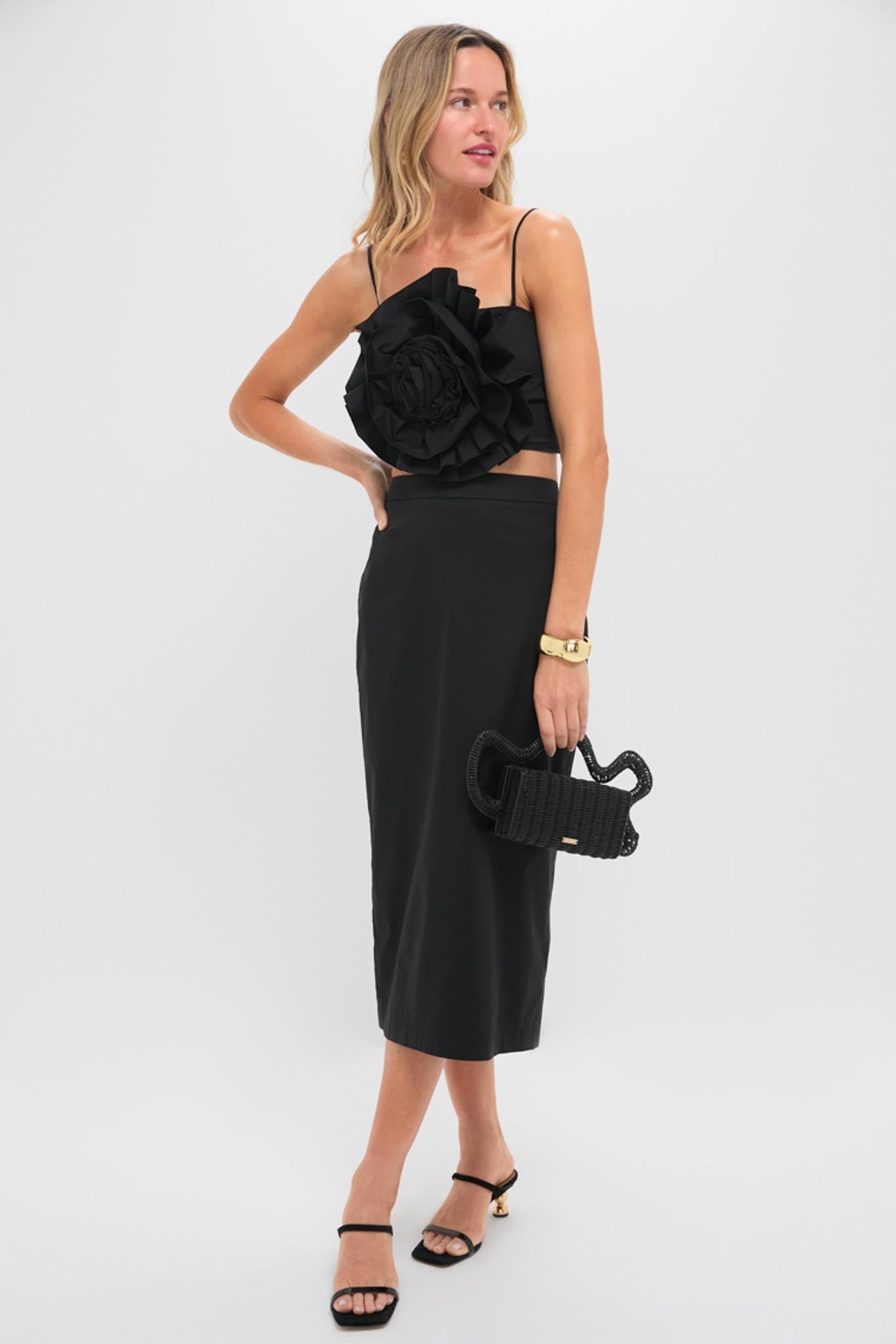 The Black Rosie Midi Skirt is a figure flattering midi skirt with a high-rise, column silhouette, and center back zipper. Style is with the Black Rosie Strapless Top, heels, and a clutch for a fun and coordinated look, or mix and match with a blouse, flats, and tote for everyday wear!