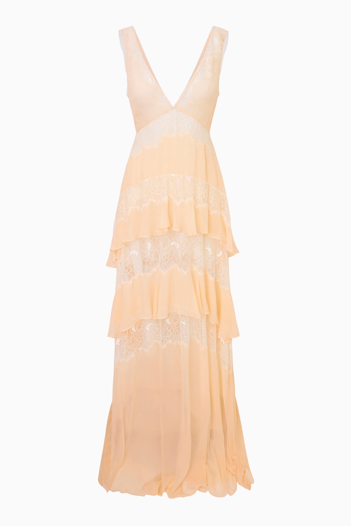 Feminine and ethereal in the Callista Dress. This Bohemian-inspired, effortless diaphanous chiffon stuns with multiple tiers at the skirt, beautiful ruffle layers and details with arrangements of vintage-inspired lace linings. With a sheer and sophisticated look, this piece comes lined with lining stopping at the thigh.