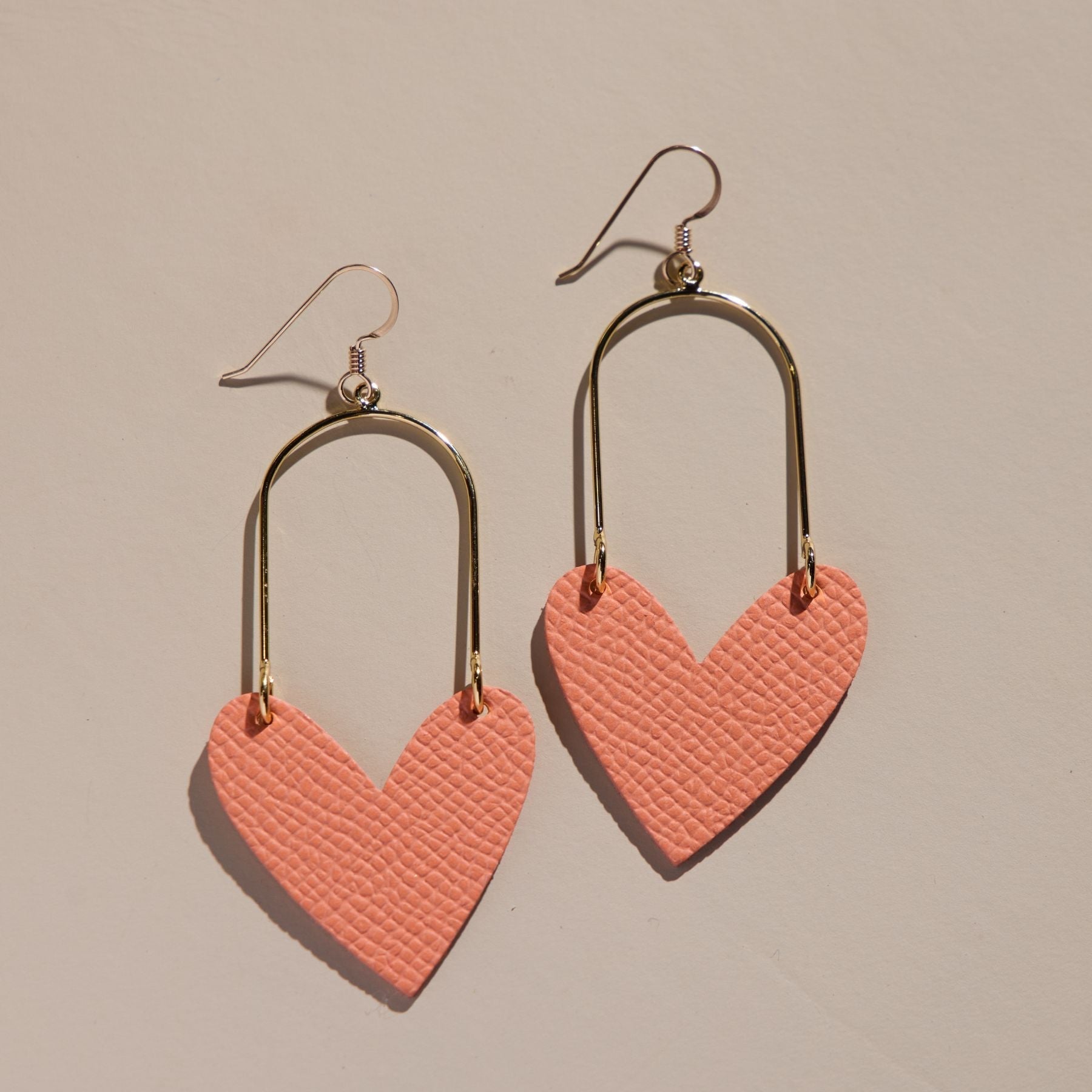 Cantaloupe is a pale soft orange leather with a pebbled texture front. These lightweight statement earrings are available in four sizes of our signature Sweethearts design.