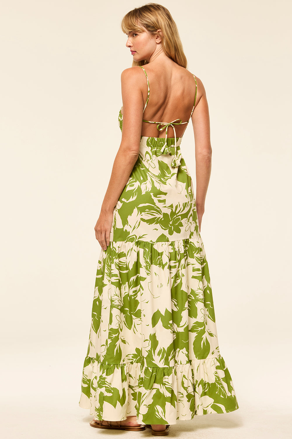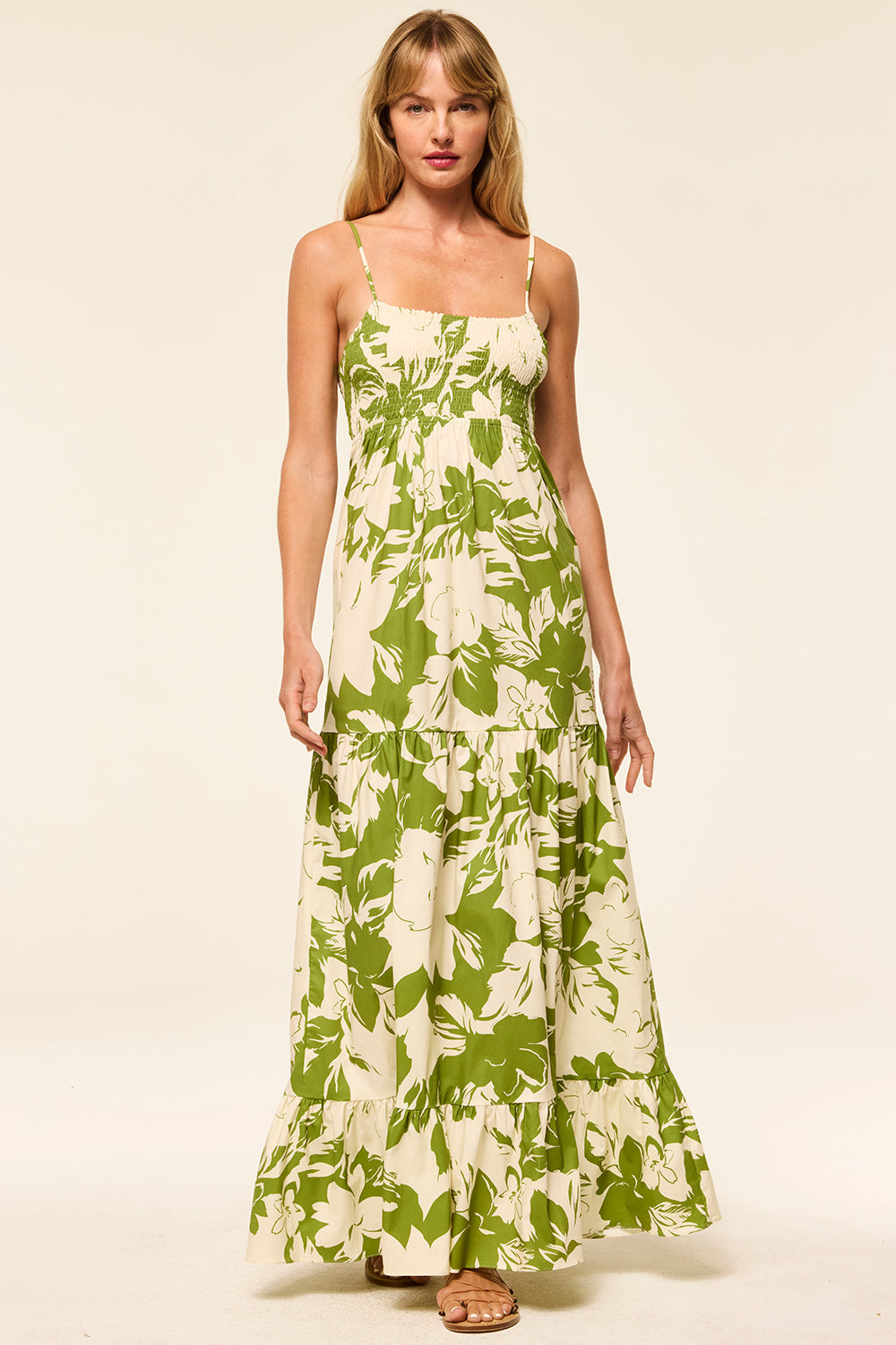 Carmela is a fresh spring maxi dress cut from a breezy Green Goddess cotton poplin. Featuring a flattering smocked bodice and adjustable spaghetti straps with an open-back tie detail. A tiered, ankle-grazing skirt with wide ruffle hem.