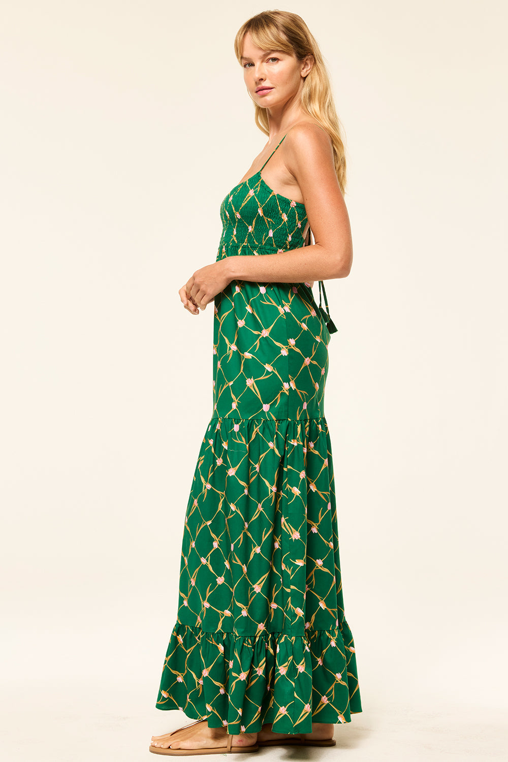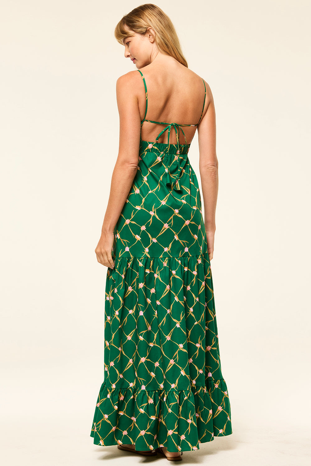 Carmela is a fresh spring maxi dress cut from a Tulip Lattice print cotton poplin in a fresh shade of green. Featuring a flattering smocked bodice and adjustable spaghetti straps with an open-back tie detail. A tiered, ankle-grazing skirt with wide ruffle hem.