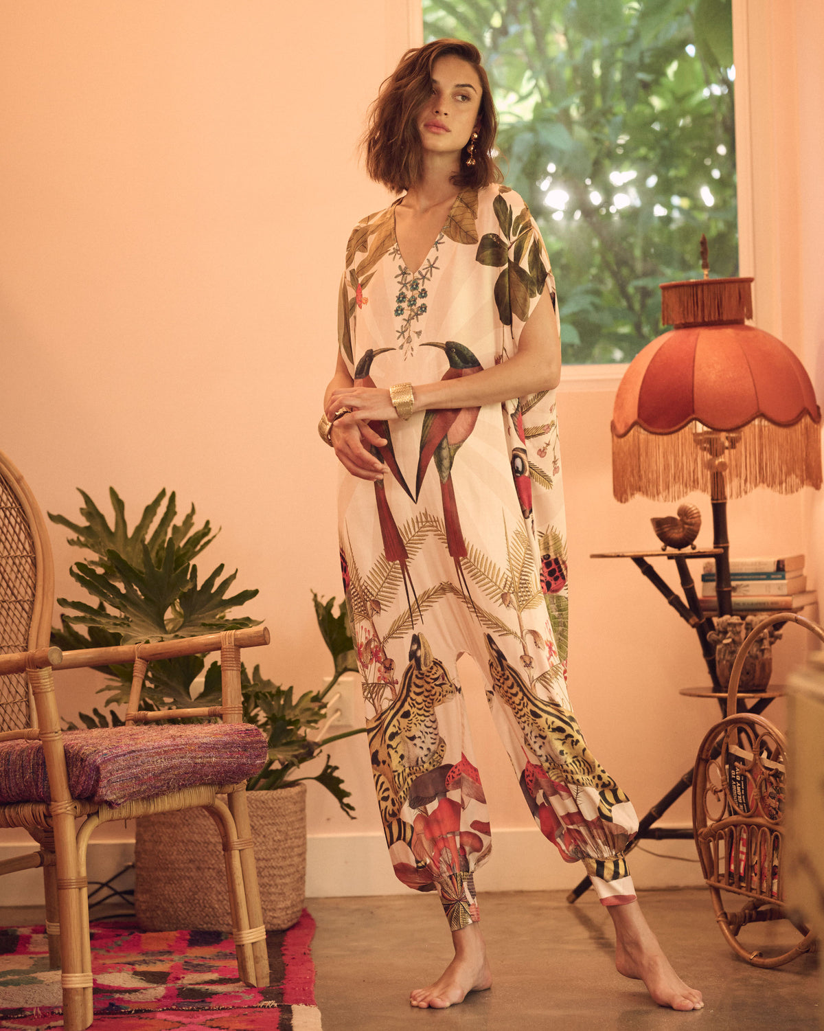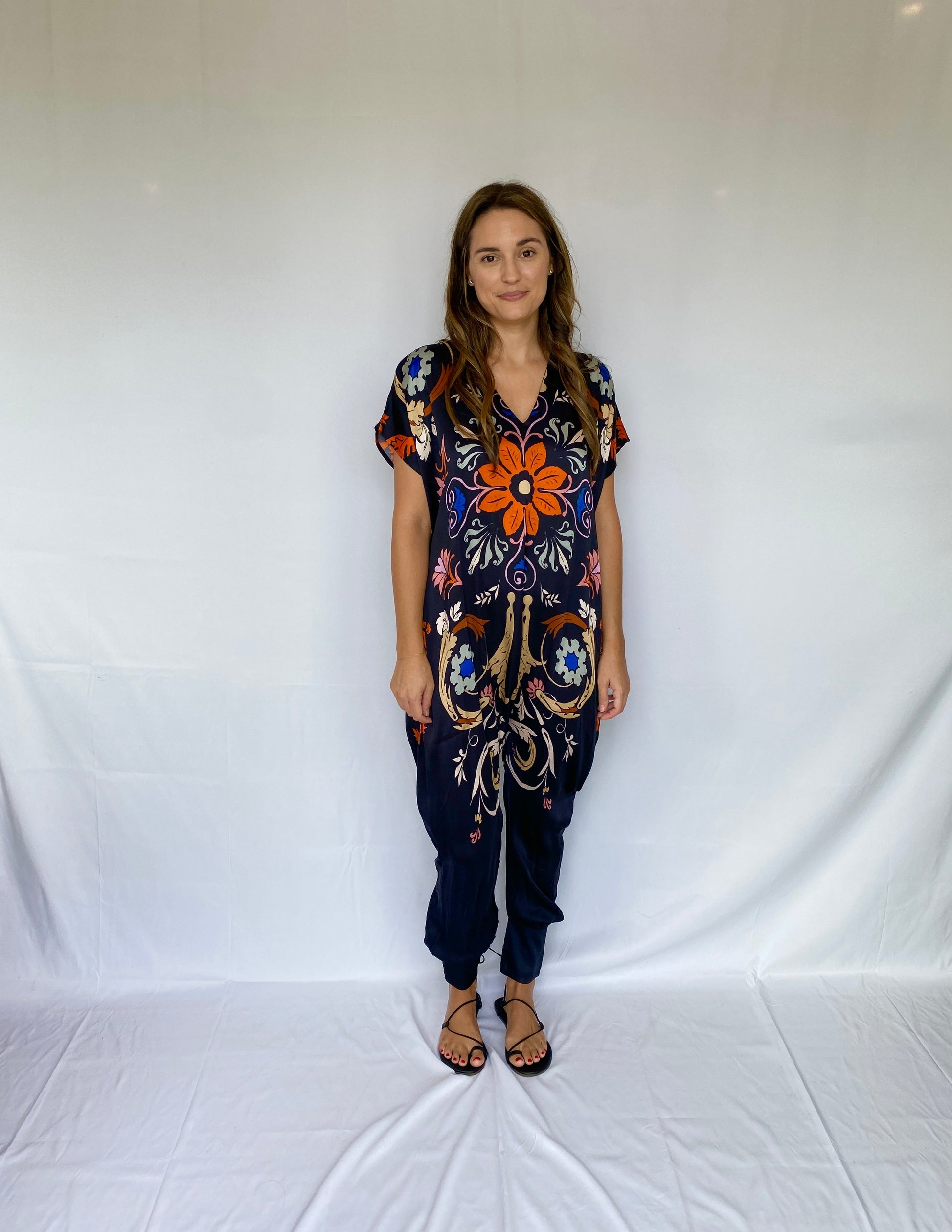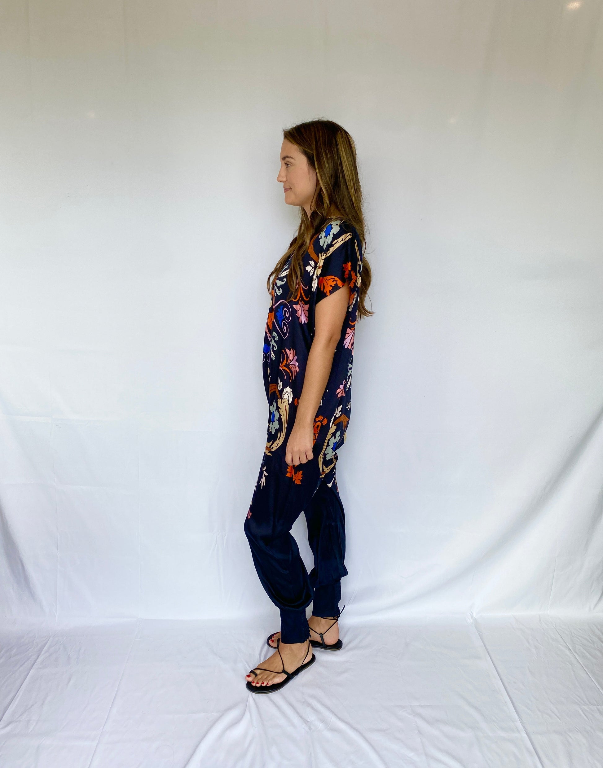 This jumpsuit features a V-neckline, short sleeves, and an oversized bodice. The silhouette has a drop-crotch and cuffed hem, and is unlined for comfort. Made of 100% silk satin, it is machine washable in gentle cycle with like colors, and should be hung to dry. Pair with a wrap sandal for a stylish look.