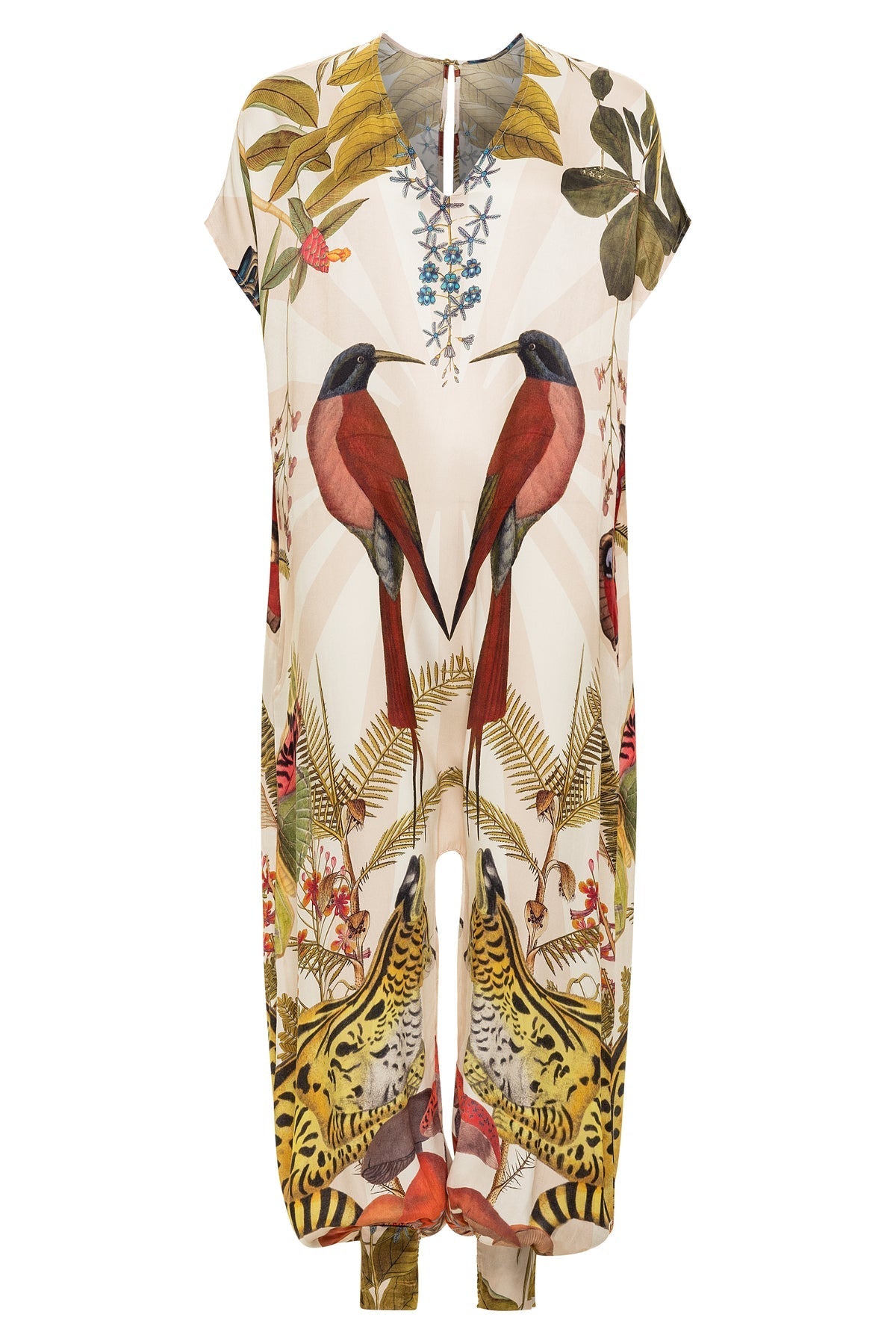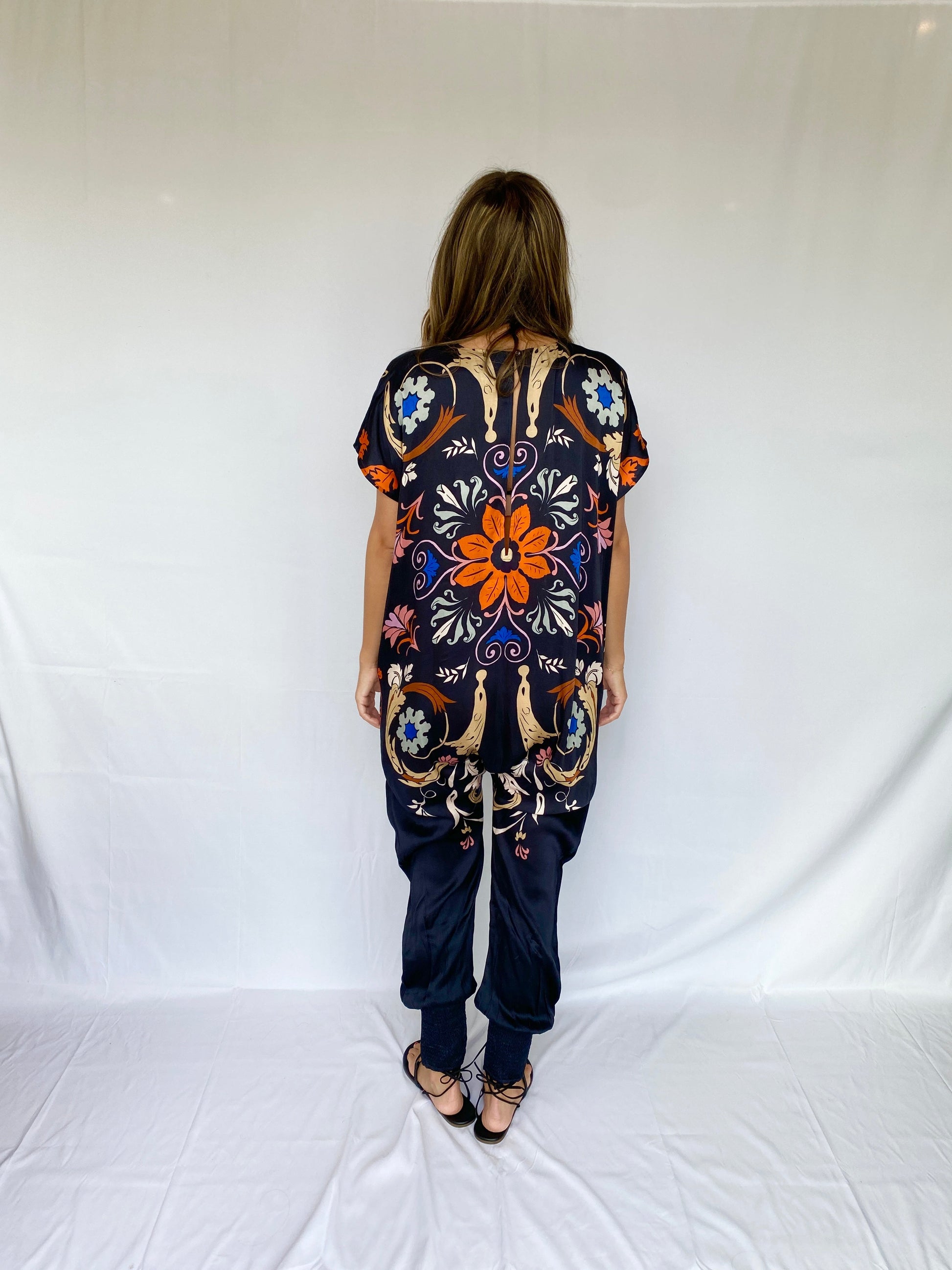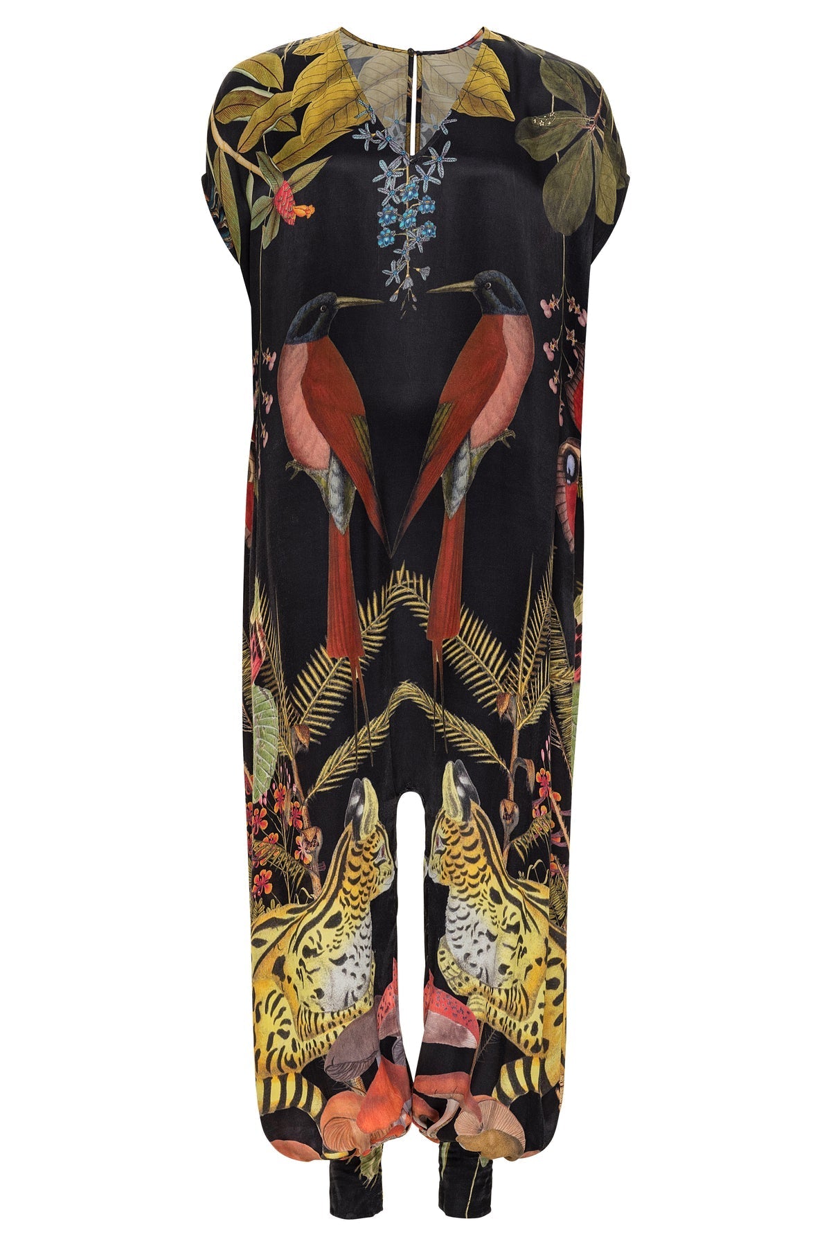 This jumpsuit features a V-neckline, short sleeves, and an oversized bodice. The silhouette has a drop-crotch and cuffed hem, and is unlined for comfort. Made of 100% silk satin, it is machine washable in gentle cycle with like colors, and should be hung to dry. Pair with a wrap sandal for a stylish look.