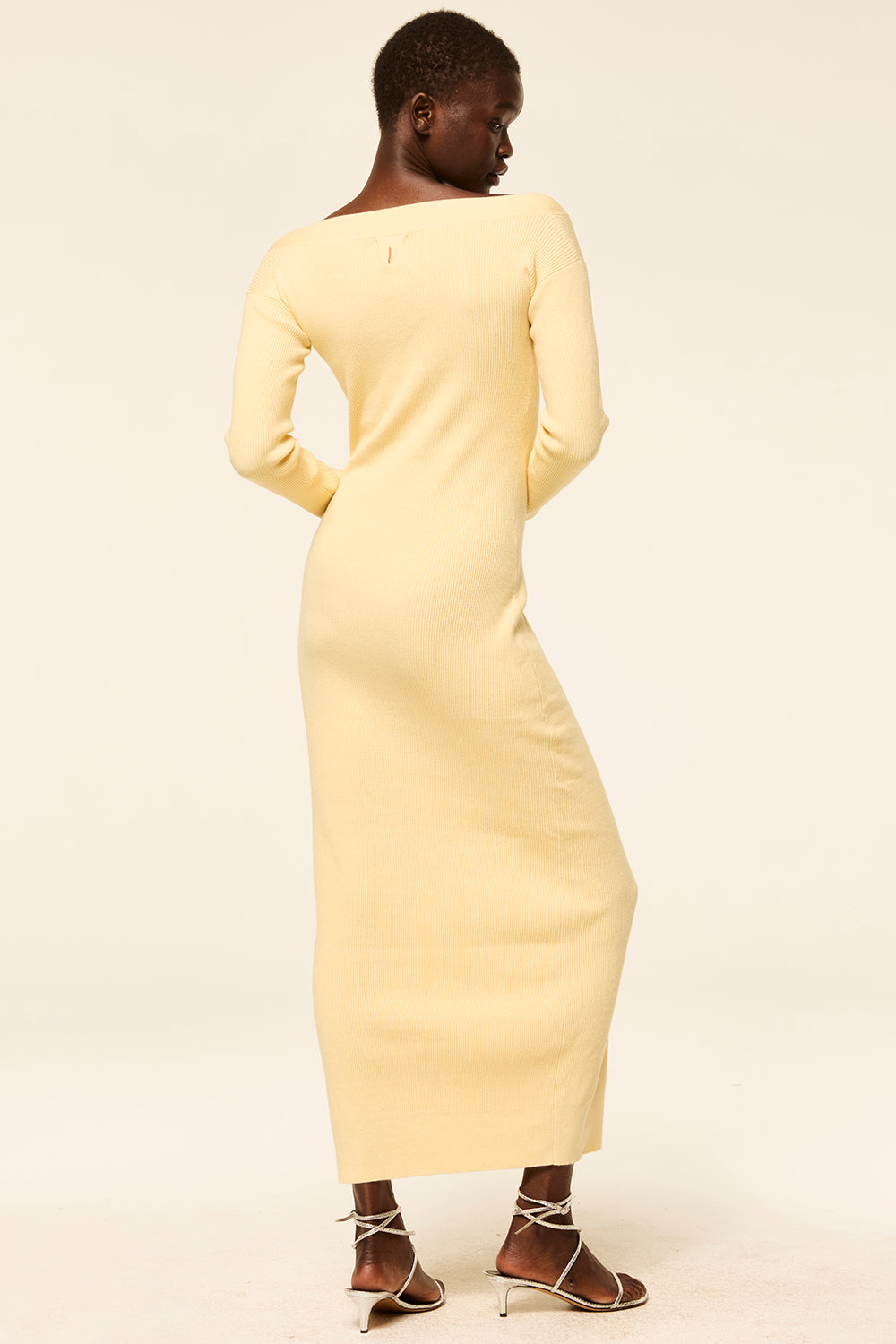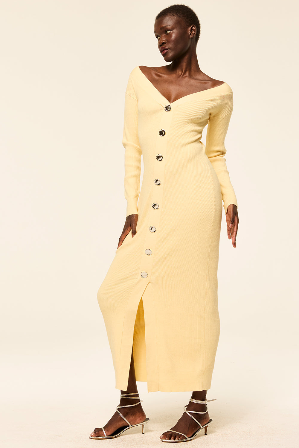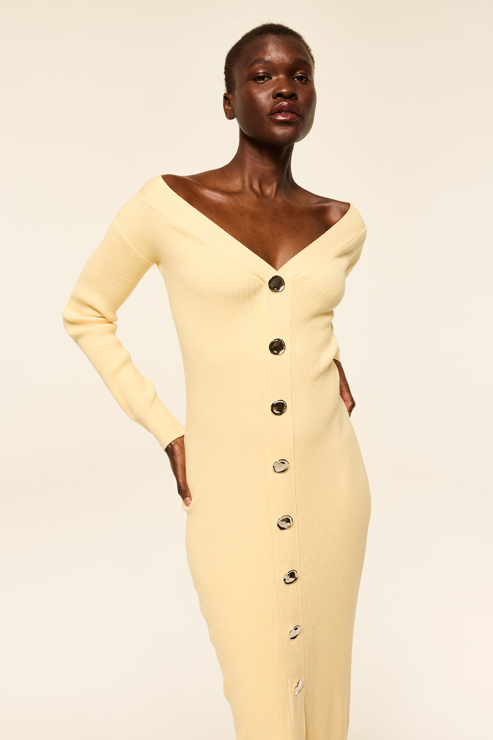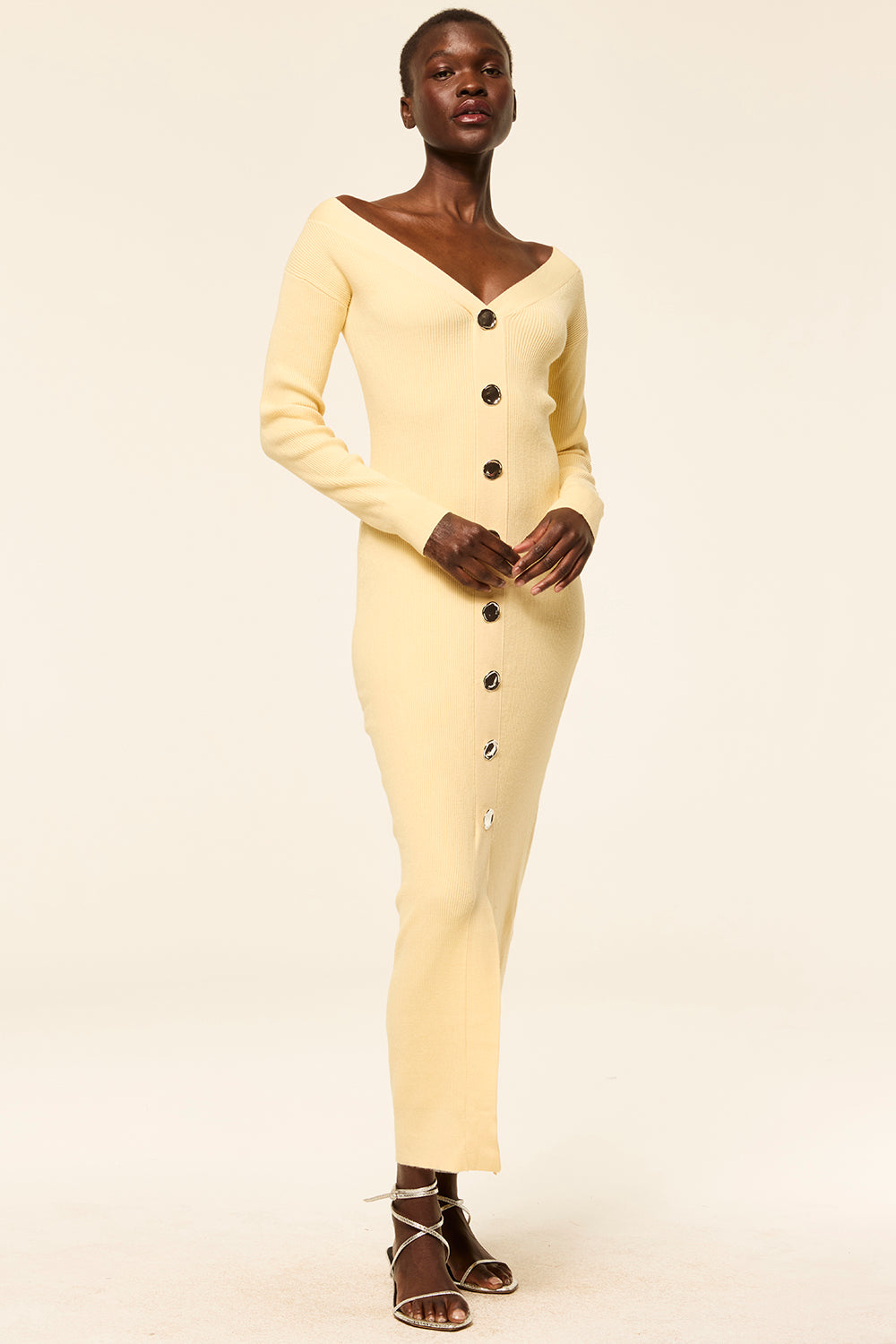 Cassia is an ankle-grazing fine rib-knit dress in this season's must-have butter yellow. This fitted silhouette features a v neckline and long, fitted sleeves that can be worn slightly off the shoulder. The front has a faux opening adorned with large silver buttons.