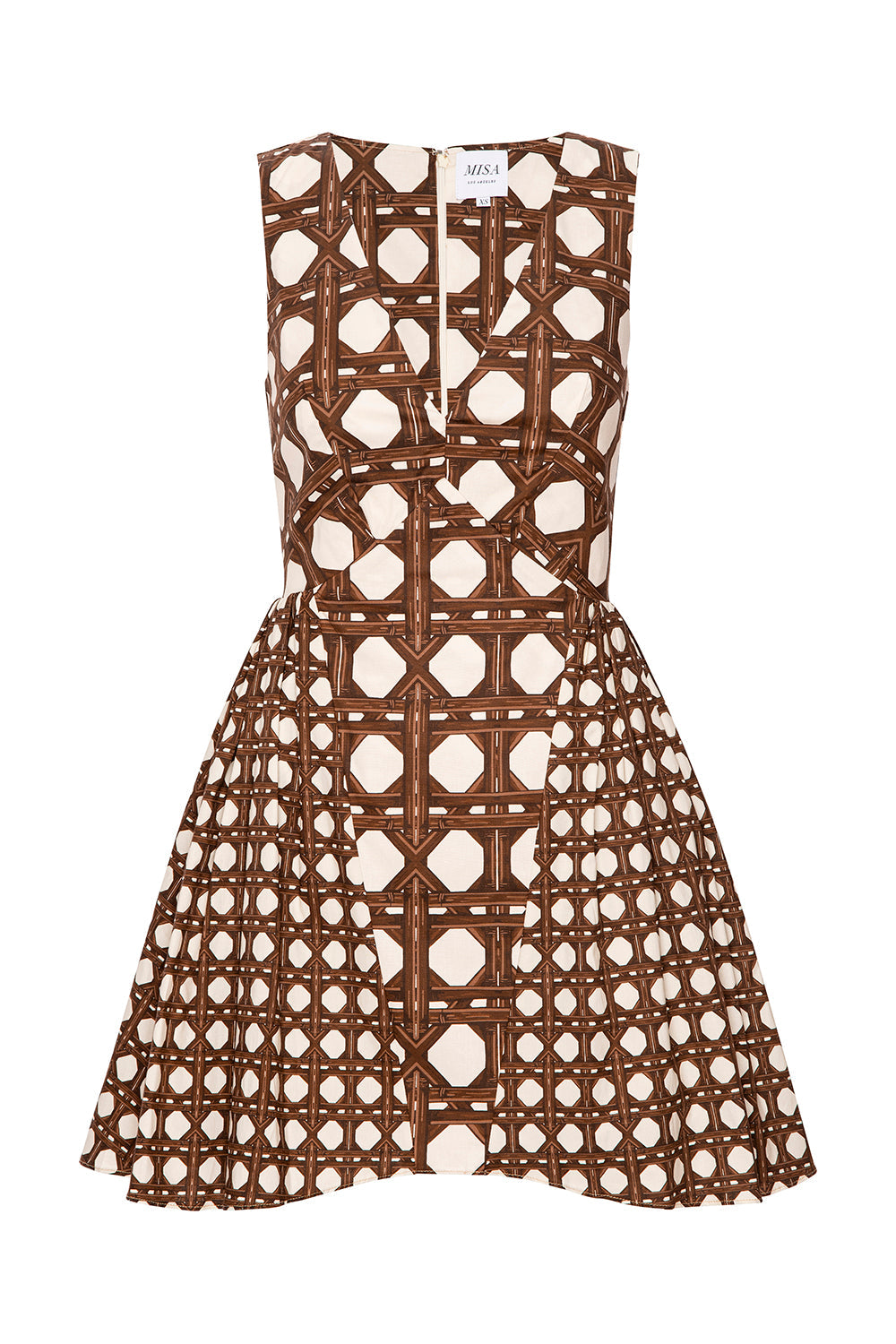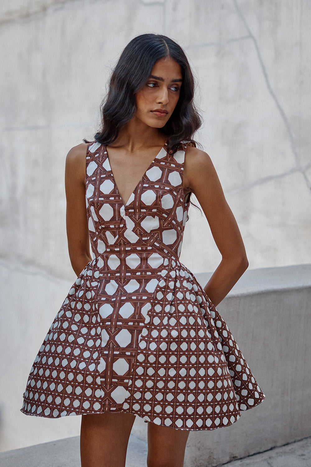 Introducing Cerise, a stylish mini dress crafted from chic Chocolate Rattan printed cotton poplin. The design features a striking contrast between a larger scale rattan pattern on the bodice and midsection, paired with a smaller-scale print at the skirt. This feminine A-line silhouette boasts a fitted bodice, a deep V neckline, and a flattering gathered waist. Finished with a hidden back zipper, Cerise is as versatile as it is elegant. Pair it with heels or flats for a fresh, effortless spring look.