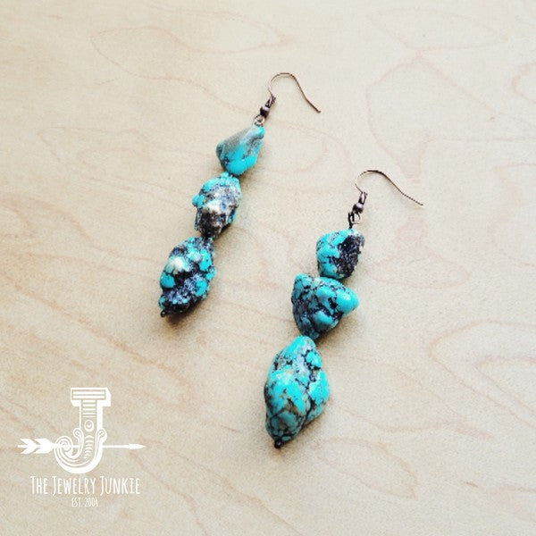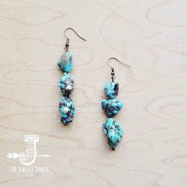 Handcrafted for a unique touch, these Stacked Turquoise and Copper Earrings are the perfect blend of boho and western style. Made from genuine blue dyed turquoise stones, each pair is one-of-a-kind. Elevate any outfit with these eye-catching earrings.