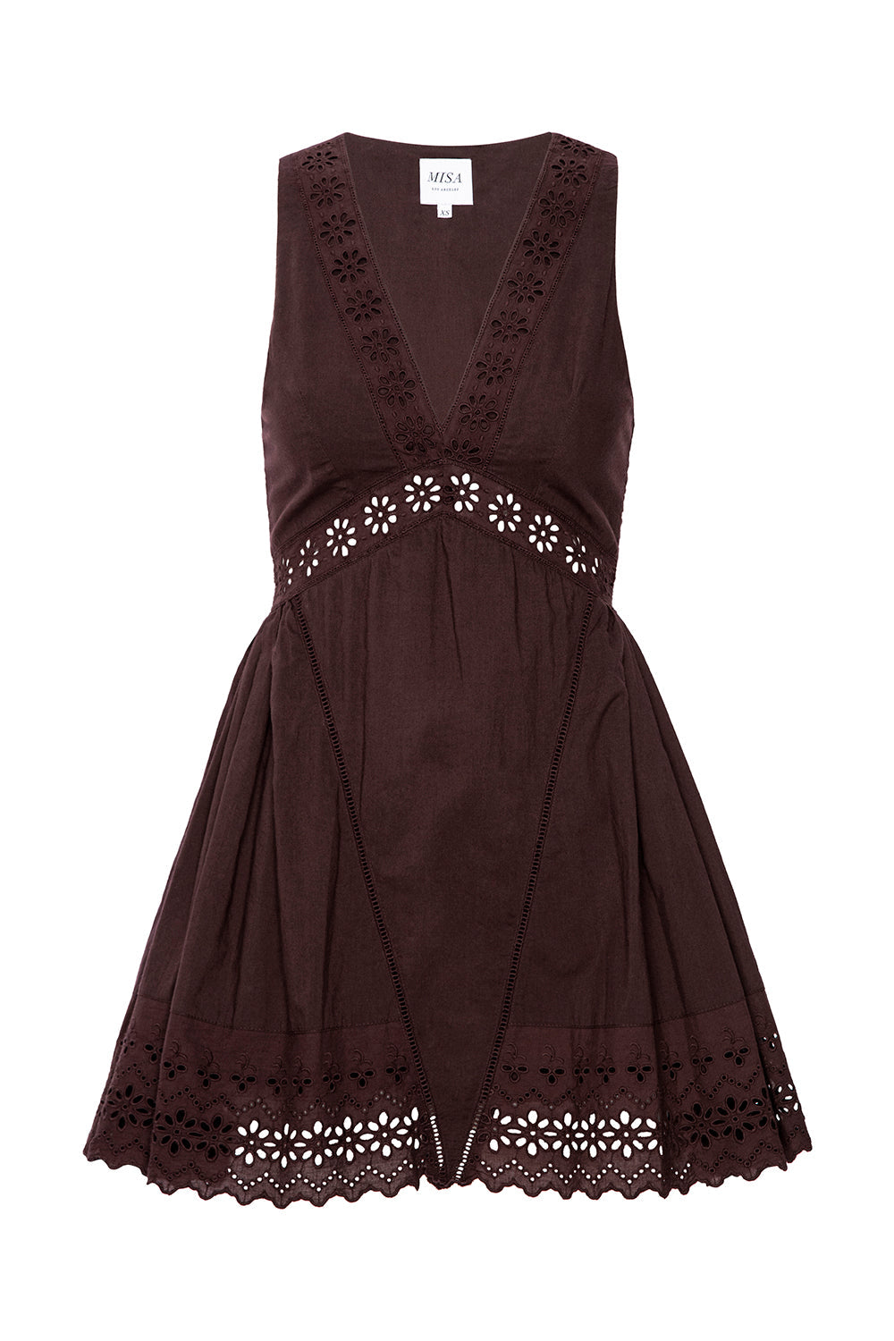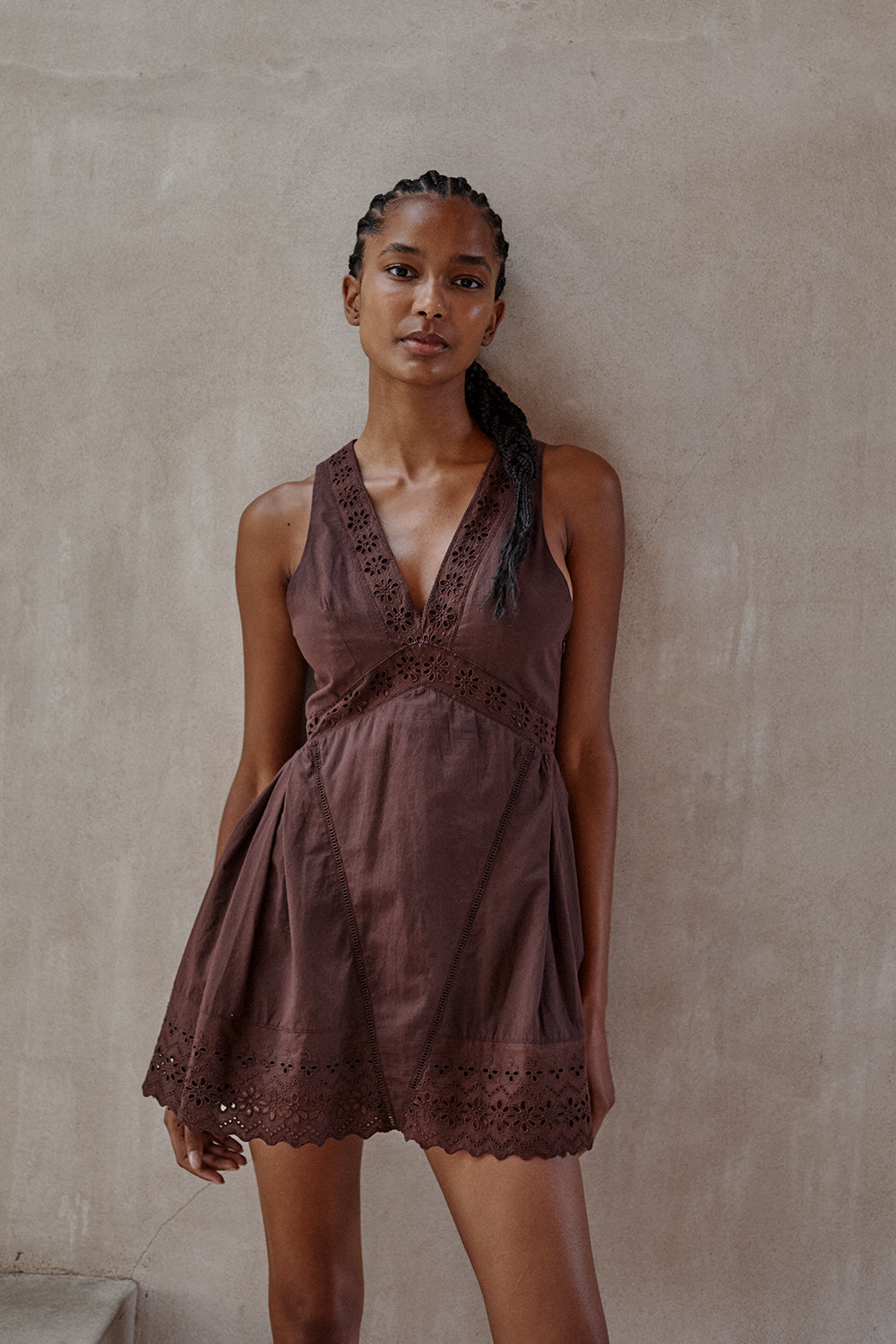 Cicely is a light and easy mini dress cut from brown cotton eyelet. A deep V neckline is framed with delicate embroidered eyelet, mirrored under the bust by a floral eyelet band. Pintuck detailing through the bodice adds subtle structure, while angled seams and inset lace lend definition through the skirt. Finished with a scalloped, eyelet-trimmed hem and a hidden back zipper, this style pairs effortlessly with flats or sandals for a look that moves easily from spring into summer.