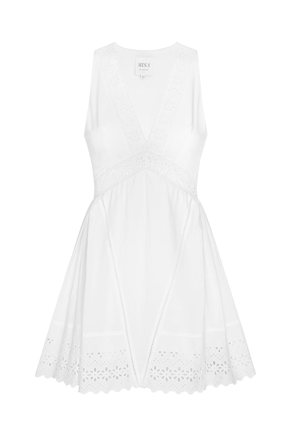 Cicely is a light and easy mini dress cut from cream cotton eyelet. A deep V neckline is framed with delicate embroidered eyelet, mirrored under the bust by a floral eyelet band. Pintuck detailing through the bodice adds subtle structure, while angled seams and inset lace lend definition through the skirt. Finished with a scalloped, eyelet-trimmed hem and a hidden back zipper, this style pairs effortlessly with flats or sandals for a look that moves easily from spring into summer.