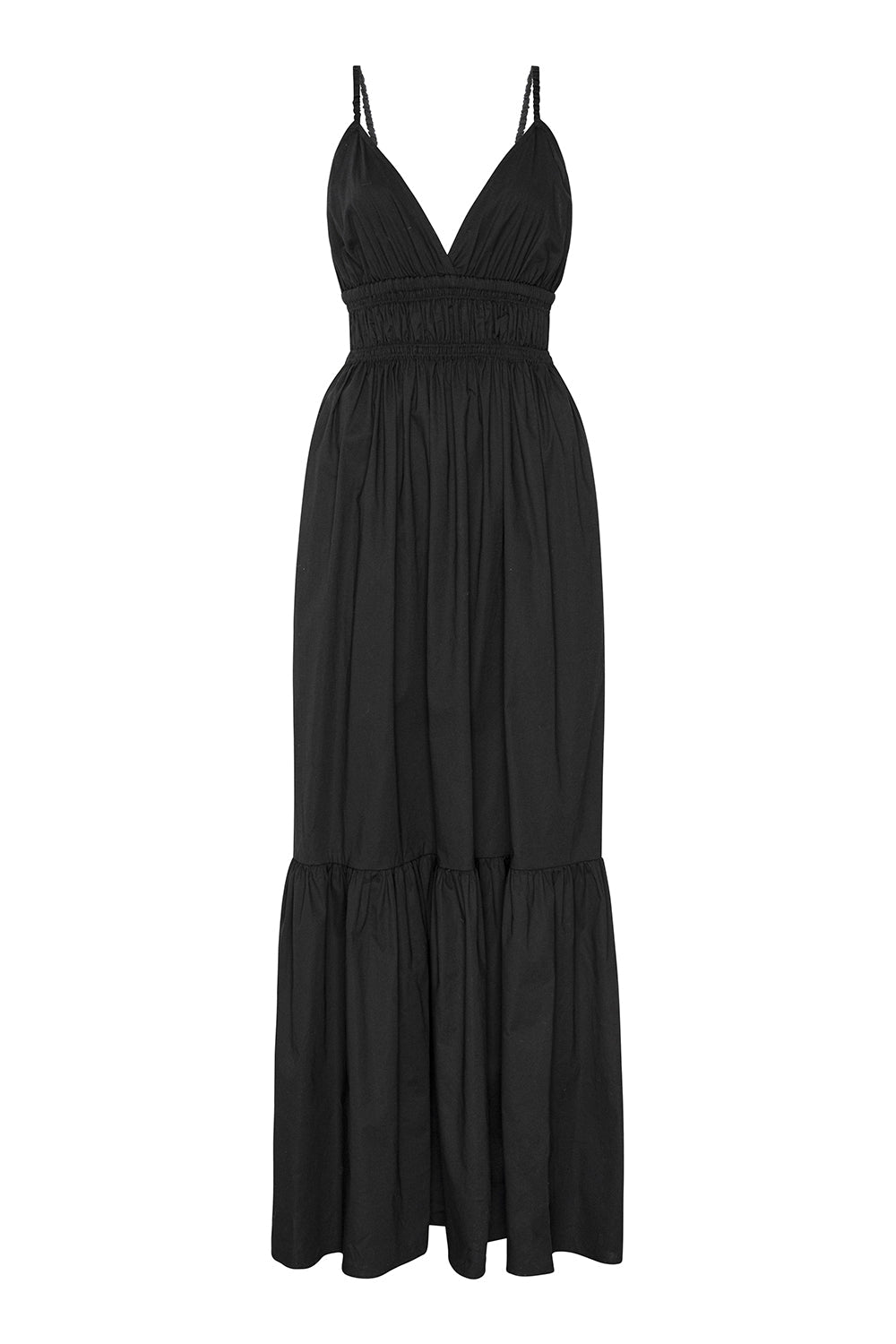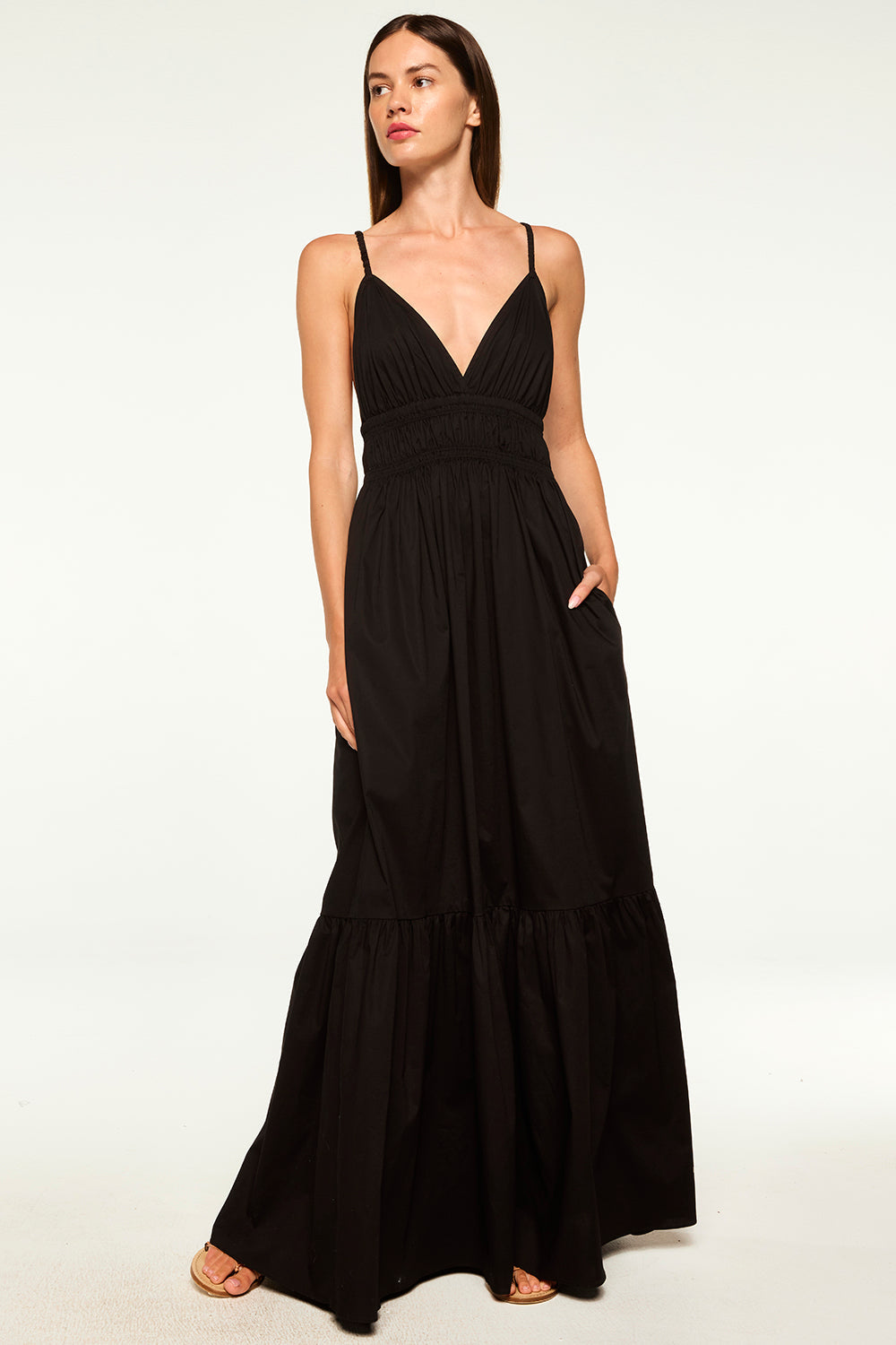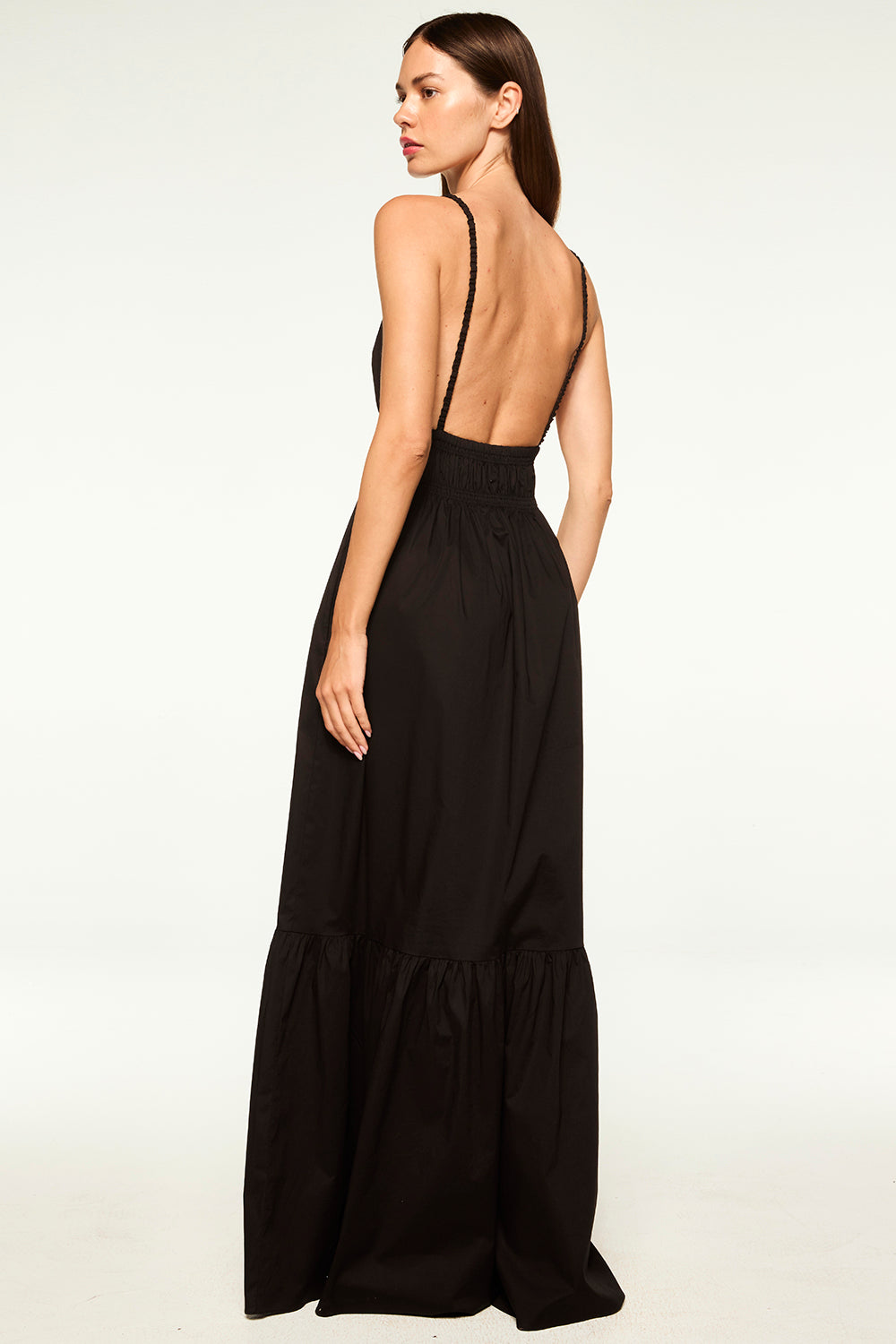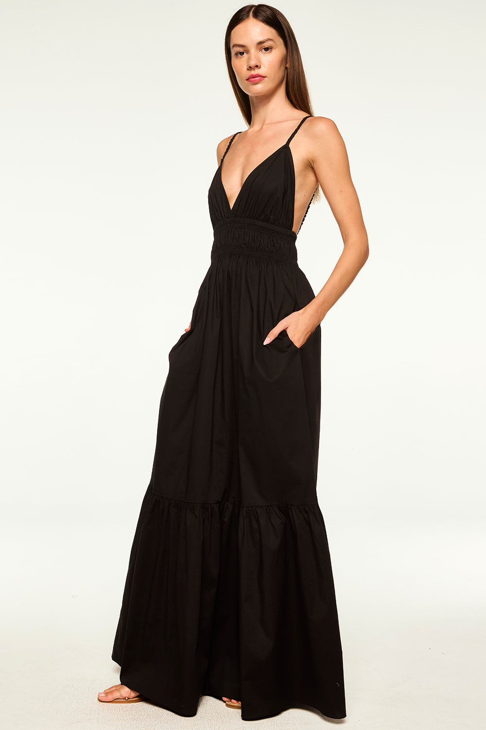 Our new Cintra dress is a versatile maxi silhouette cut from a breezy black cotton poplin. Scrunched spaghetti straps and deep back. A deep v neckline with a flattering elastic ruched band under the bust leads into an a-line skirt with side slit pockets and a wide ruffle hem.