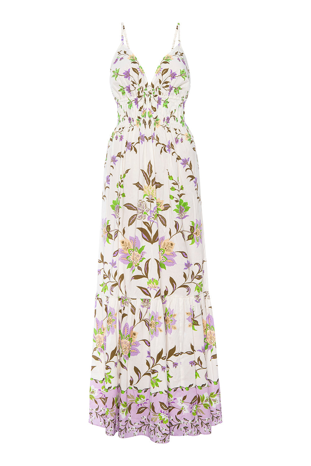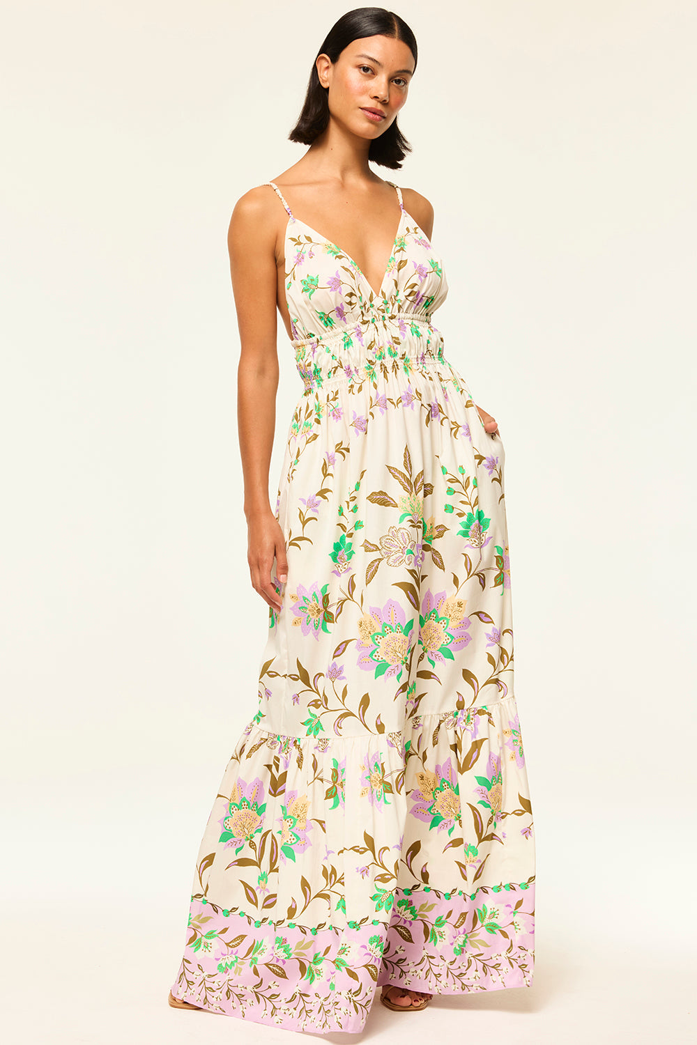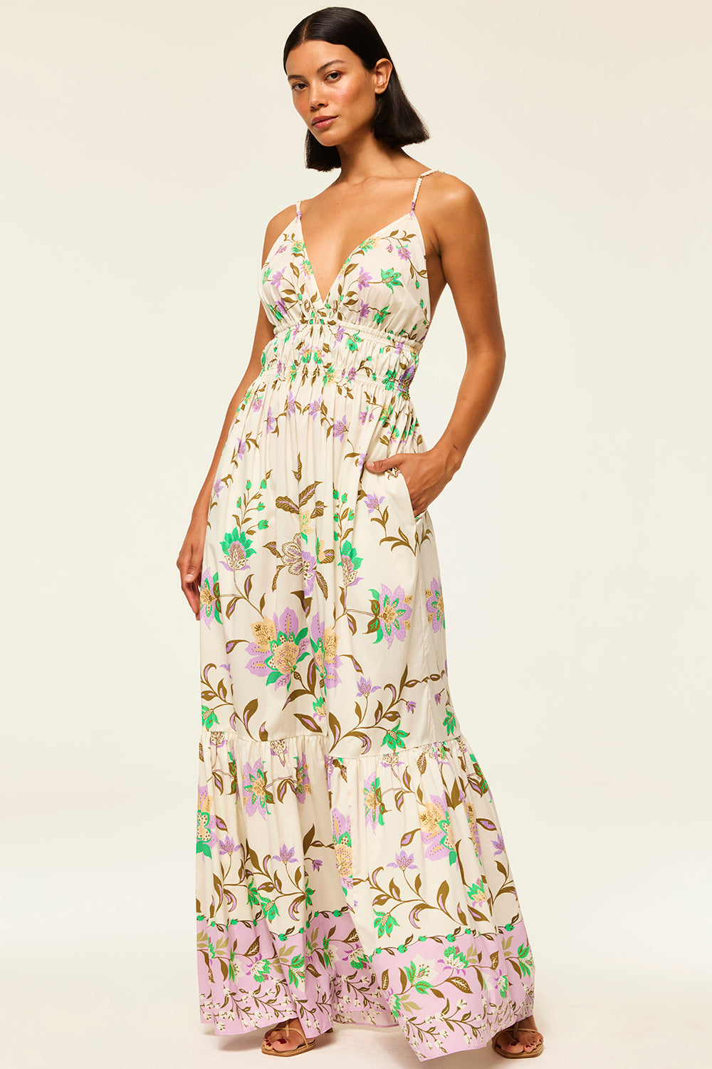 Our new Cintra dress is a versatile maxi silhouette cut from a breezy Secret Garden print cotton poplin. Scrunched spaghetti straps and deep back. A deep v neckline with a flattering elastic ruched band under the bust leads into an a-line skirt with side slit pockets and a wide ruffle hem.