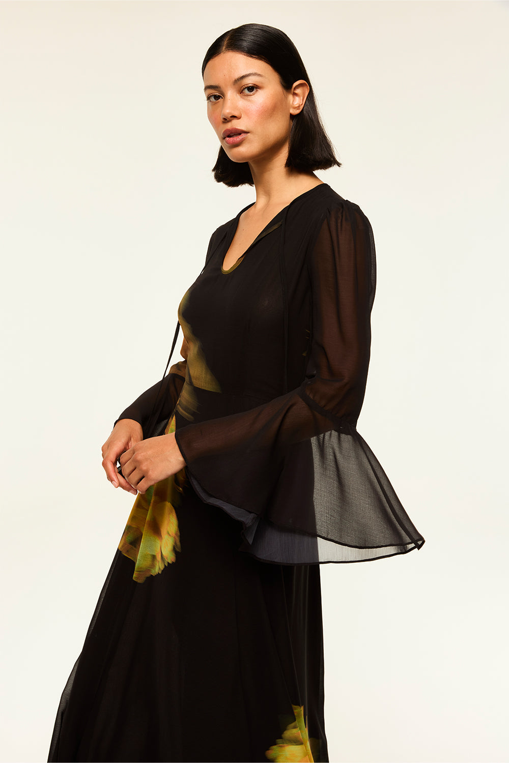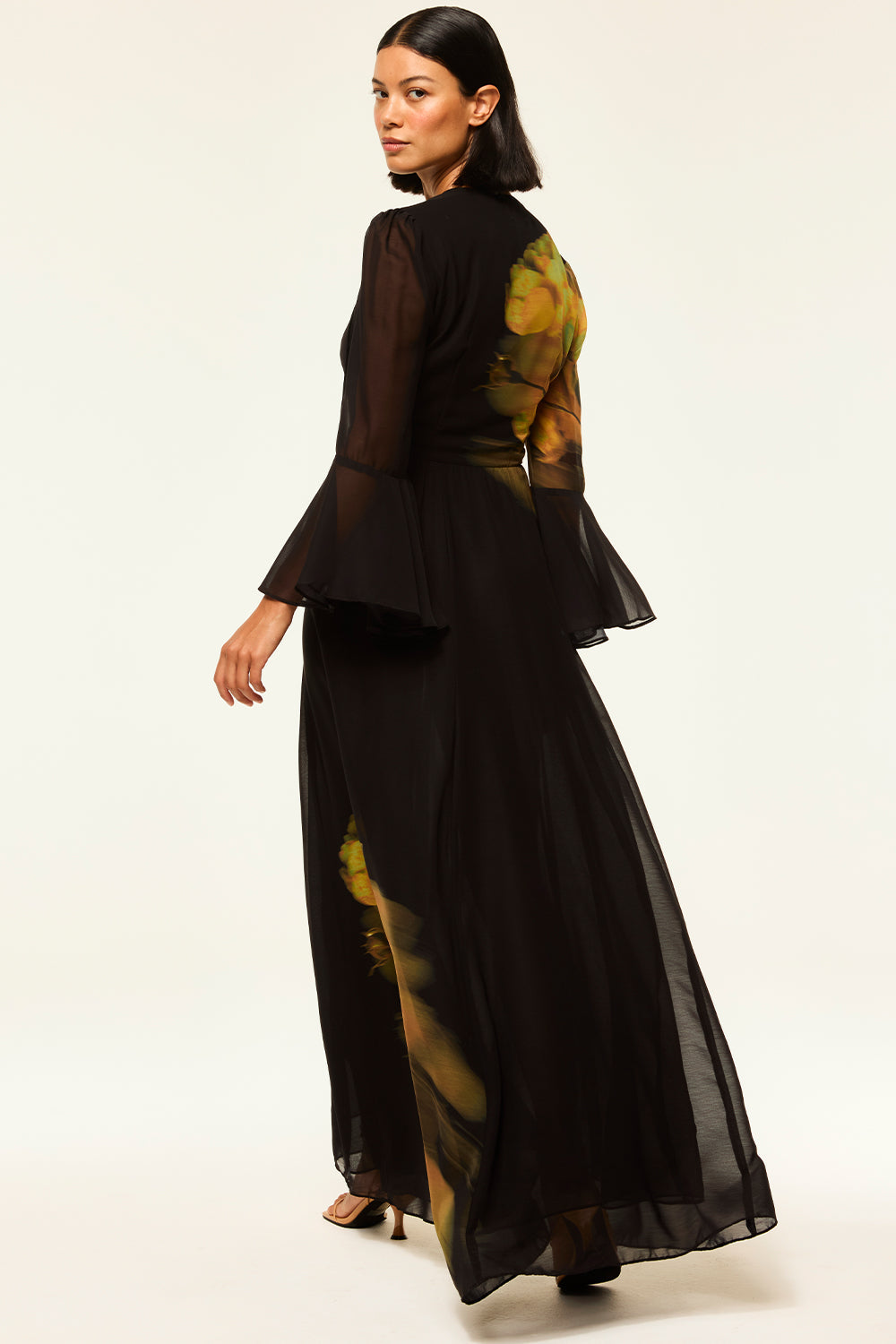 Our new Claire dress is a dreamy maxi silhouette cut from black chiffon printed with a yellow rose motif. A split v neckline with petal tassel ties and a fully lined bodice with three-quarter sheer sleeves featuring a wide ruffle cuff. The perfect dress for fall weddings and beyond.