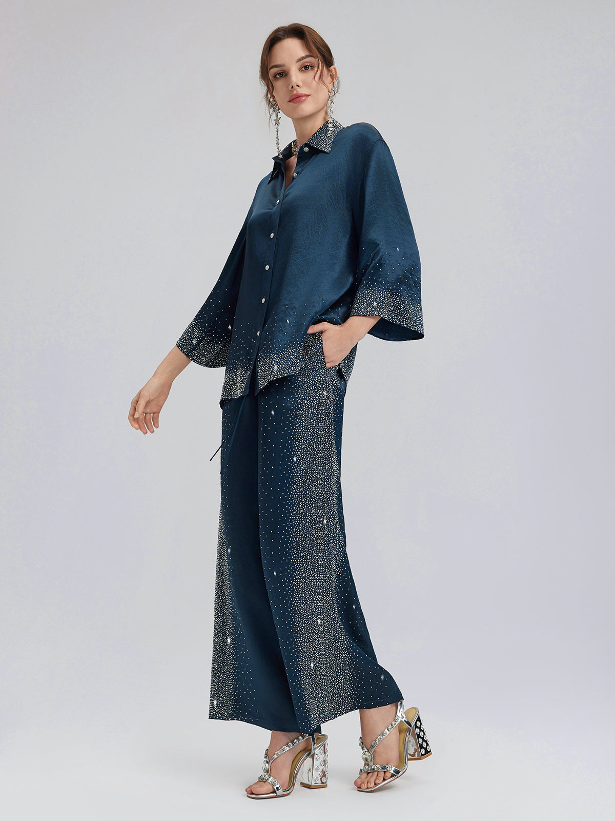 Crafted from premium acetate with a lustrous satin finish, this shirt offers a soft, fluid drape that’s breathable, wrinkle-resistant, and easy to care for. Hand-applied rhinestones shimmer like scattered stardust, adding a refined brilliance. The dropped shoulders and relaxed cut strike a balance between ease and elegance, while the three-quarter sleeve transitions effortlessly across seasons and settings.