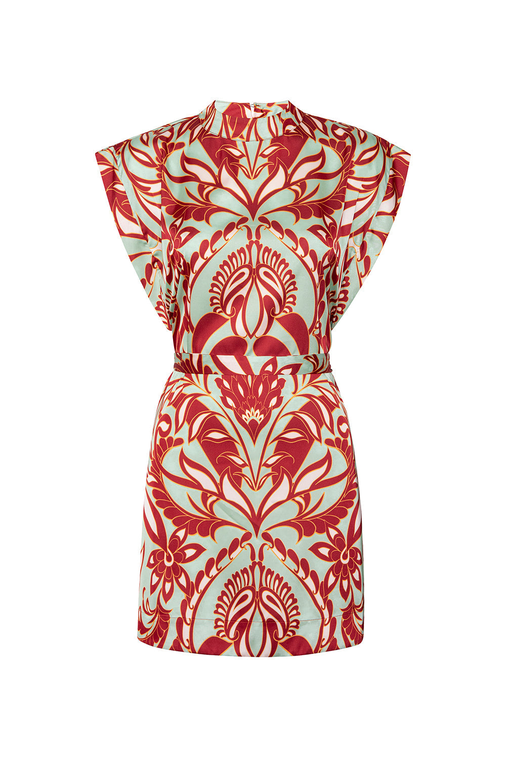 Cyrene is a modern mini shift cut from our stunning red and mint green Vintage Botanical–printed satin. Featuring a mock neckline and relaxed cap sleeves, this easy silhouette includes a removable self-tie belt to cinch the waist or wear loose for a more effortless shape. Pair with heels or flats for a bold, versatile look that transitions with ease.