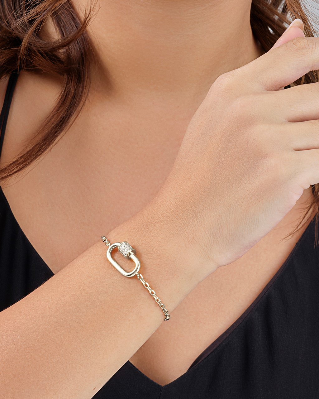 Turn heads with this sparkling and unique piece! The center carabiner charm is adorned with gleaming CZ stones, and the sliding bolo allows you to choose the perfect fit. Available in gold and silver tones.
