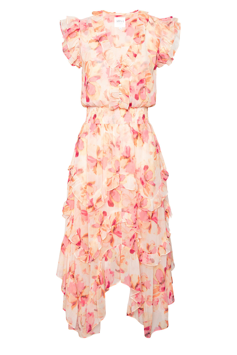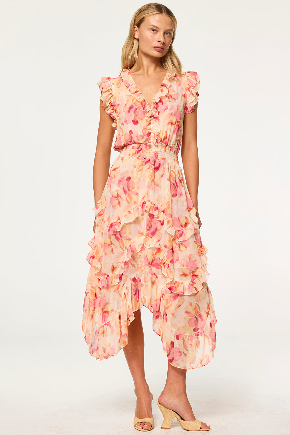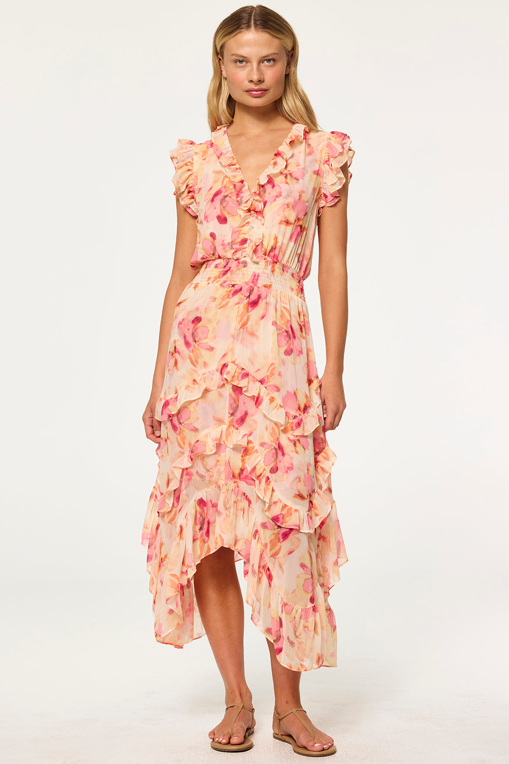Chic and universally flattering, the best-selling Dakota is a playful yet polished midi dress designed to take you seamlessly from desk to dinner. Cut from a flowing Watercolor Floral print chiffon, it features a buttoned V-neckline framed with soft ruffle trim and delicate ruffle accents at the shoulders. A smocked elastic waist cinches the silhouette, flowing into a tiered, ruffle-trimmed hem.