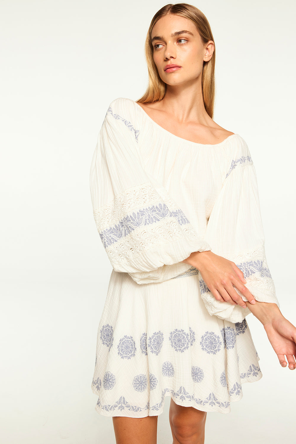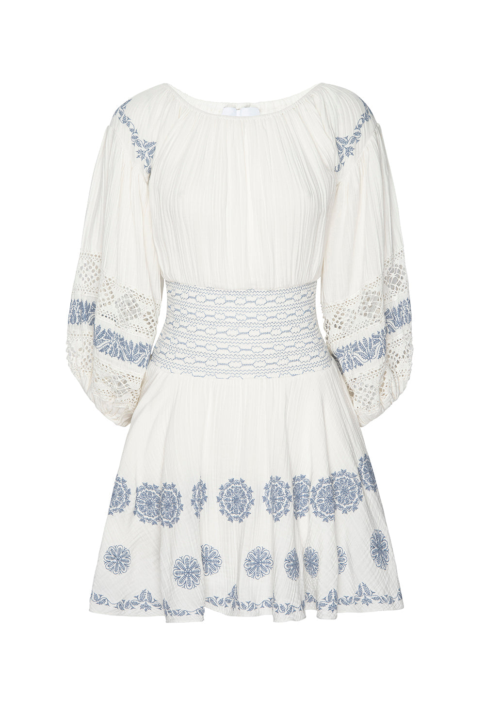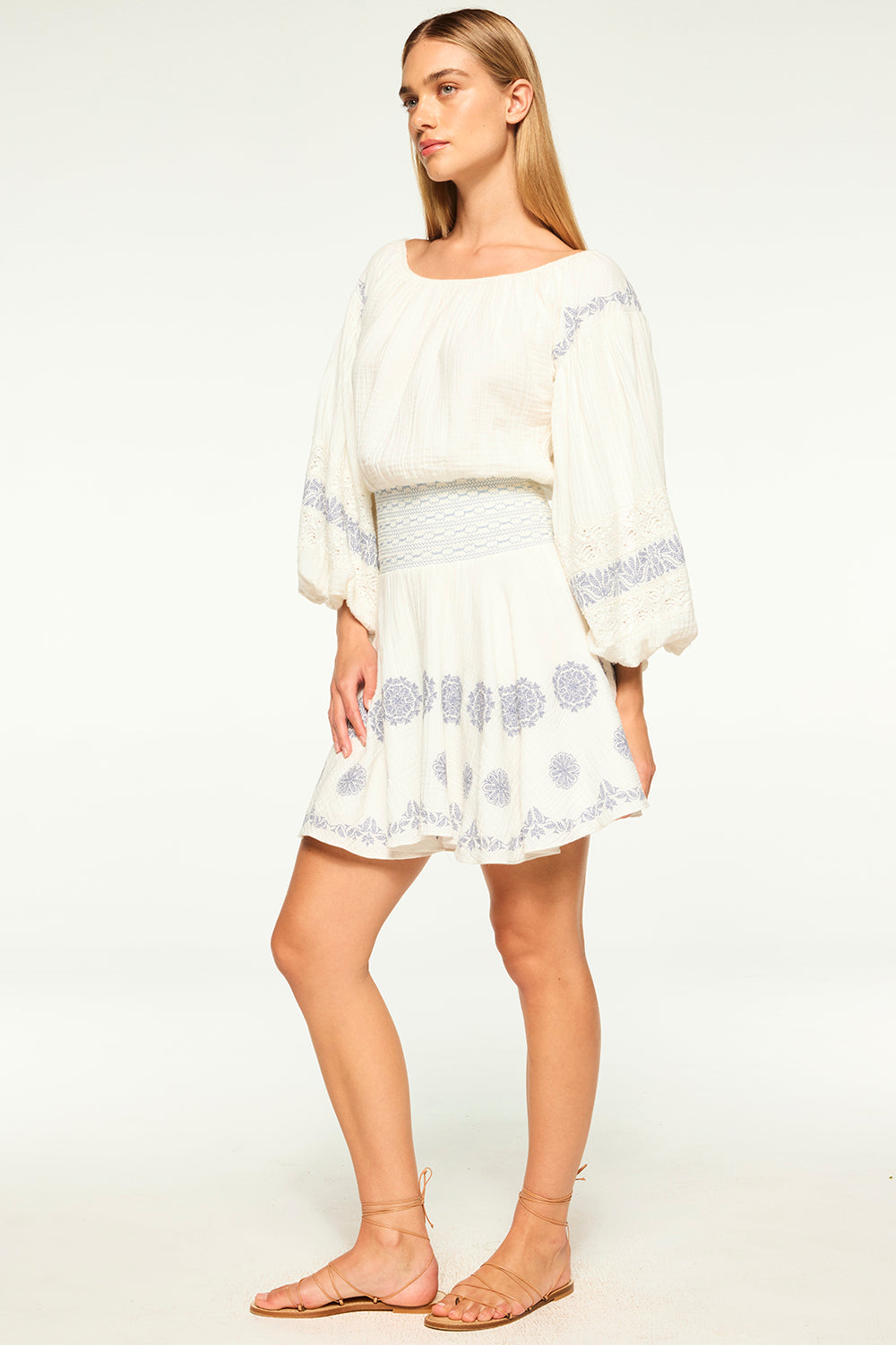 Daliya is an effortless getaway-ready mini dress to carry you into the warmer seasons. This off-the-shoulder style is cut from a breezy cotton gauze and features long voluminous sleeves with elastic cuffs trimmed in tonal lace with blue embroidered details. The blouson top is accentuated with a wide smocked embroidered waistline and leads into a flowing skirt with embroidered blue medallions. Fully lined. This pack-and-go style is a timeless addition to your warm-weather wardrobe.