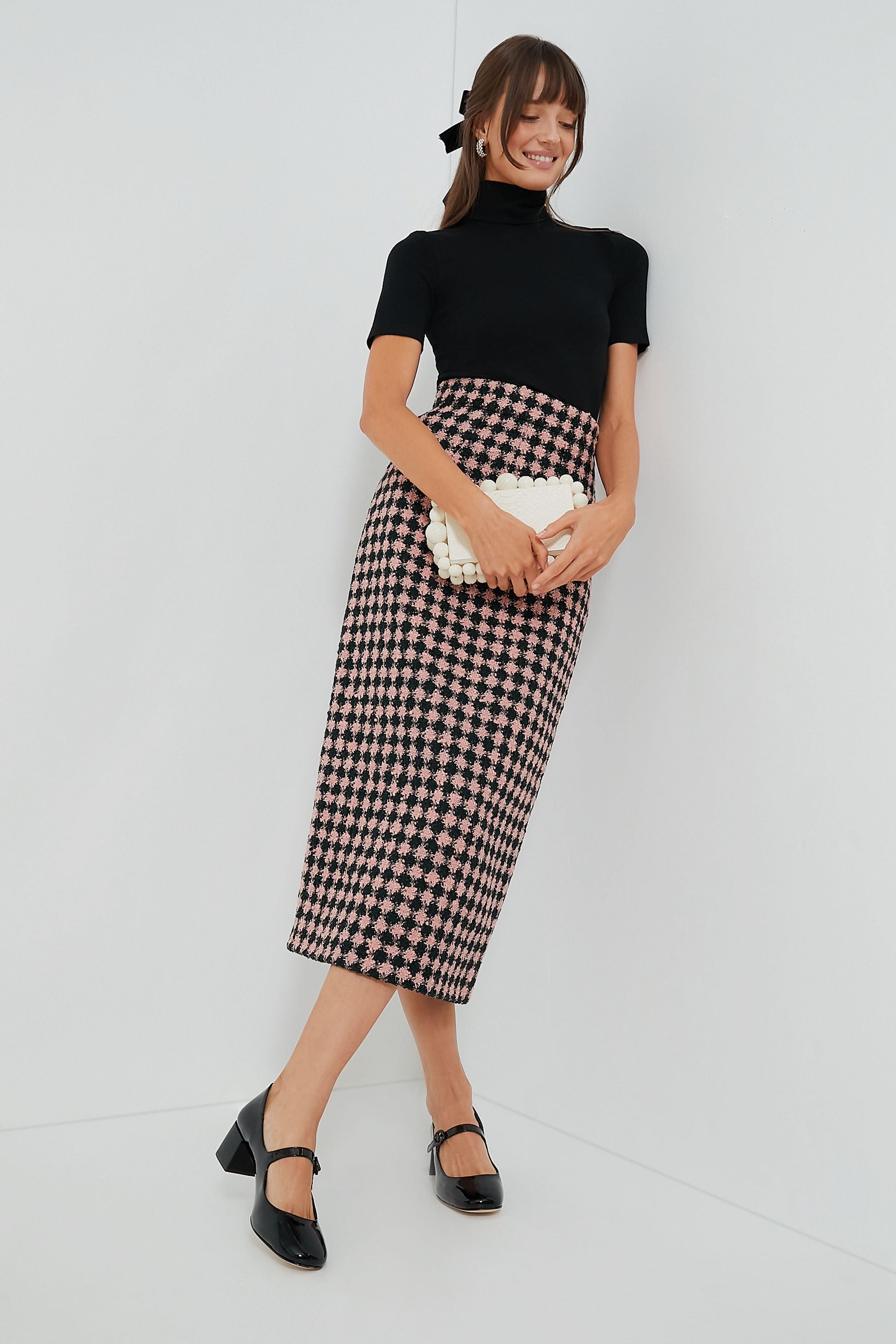 Power dressing is in this season, and there's no better way to try the trend than the Dark Green and Pink Lorinda Heritage Wool Skirt. Cut to a slim pencil silhouette that skims the body and hits mid-calf, this houndstooth-patterned style has a flattering high rise and a back vent for ease of movement. Pair it with a turtleneck and Mary Janes for a feminine and fun office look, or try it with a silk blouse or a boxy blazer for a more contemporary styling.