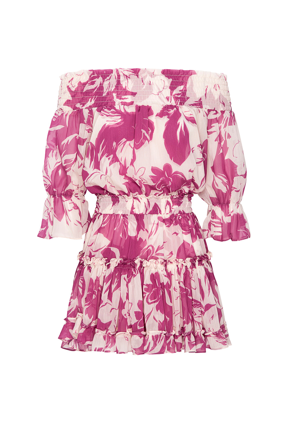 Darla is a classic off-the-shoulder mini dress crafter from a Fuchsia Flora printed chiffon. The smocked neckline and elastic waist provide a comfortable, flattering fit, while the three-quarter sleeves with ruffle accents add a playful touch. The tiered skirt with a slightly asymmetric hem is adorned with delicate ruffles, creating a breezy, feminine silhouette that's perfect for spring and summer days.