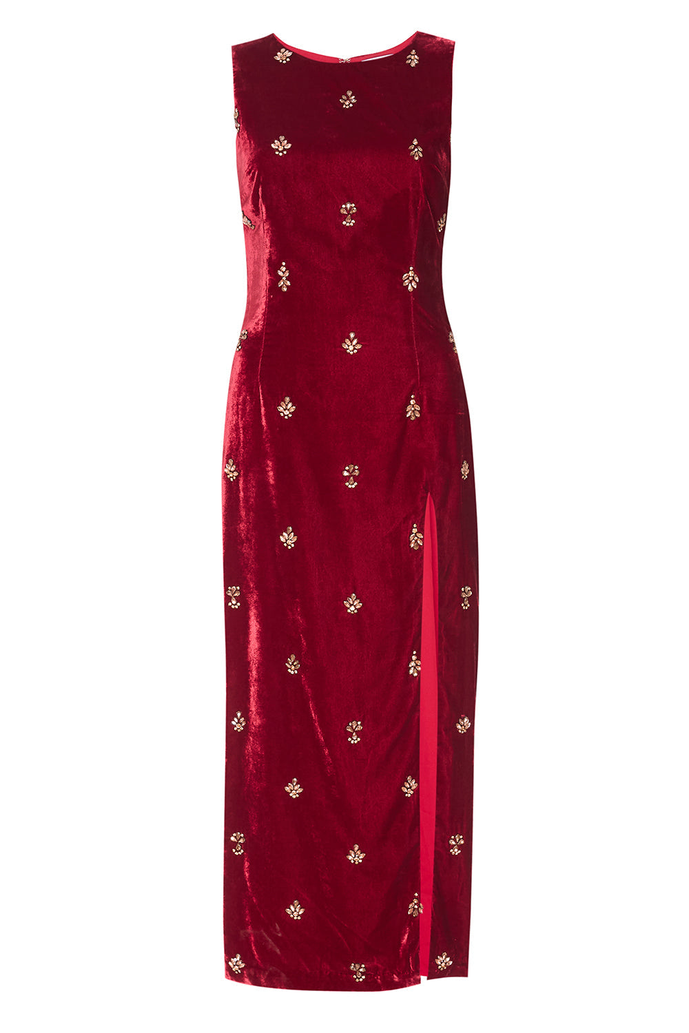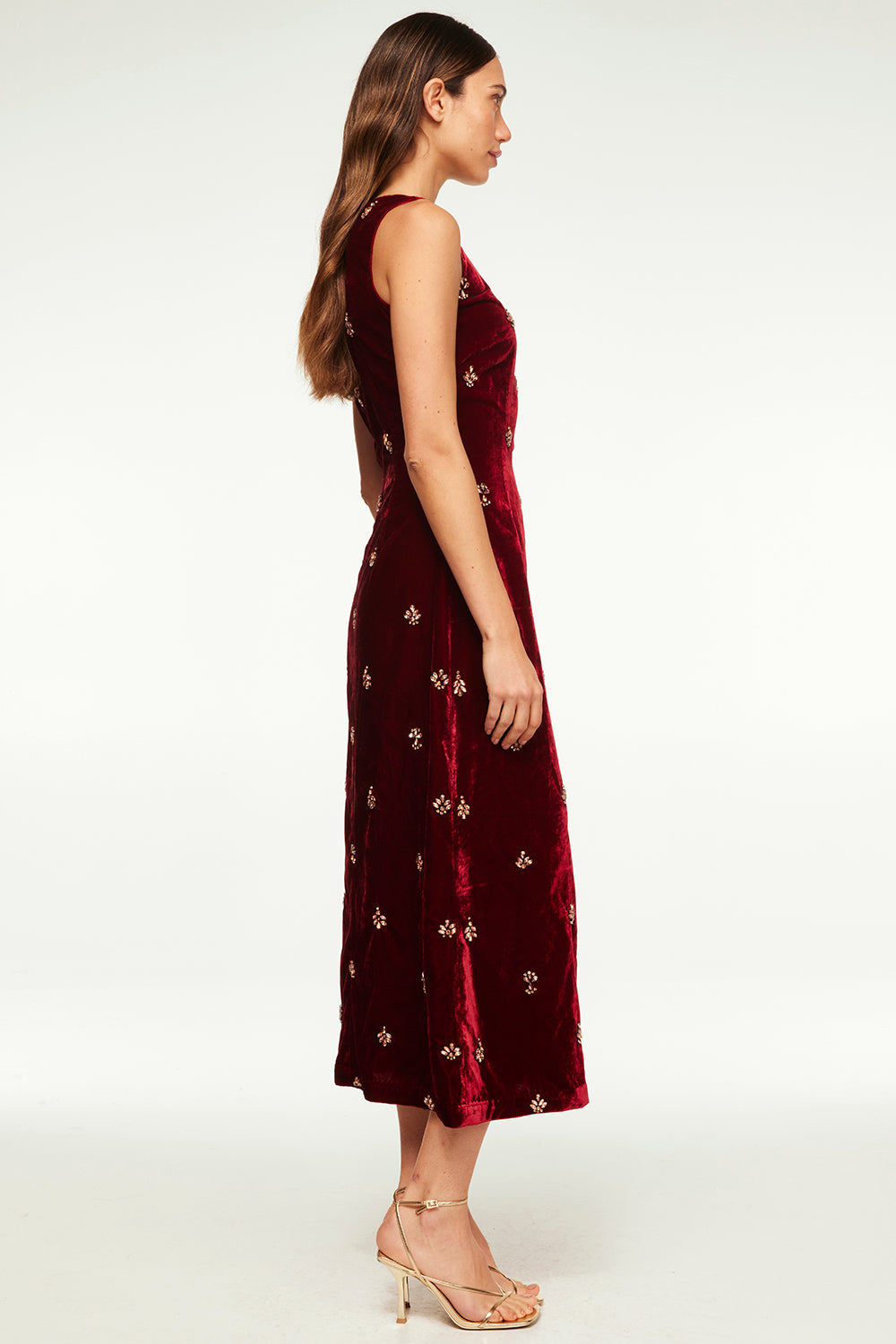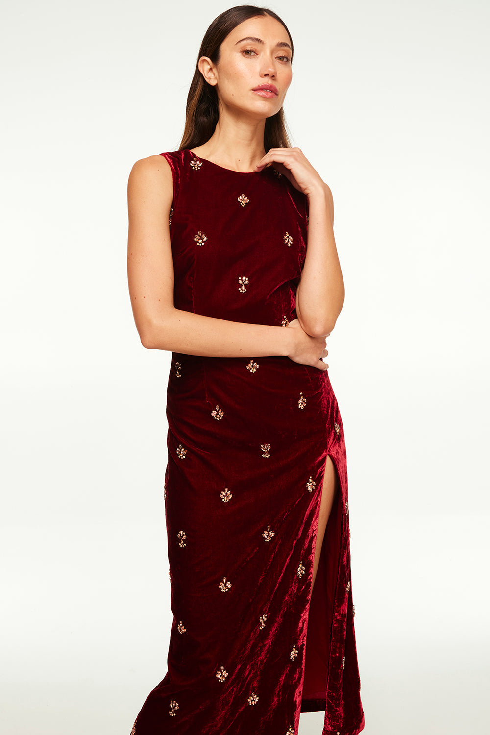 Stun at your next soirée in our luxe velvet Delaney dress. This sleeveless, high-neck, midi silhouette features a daring front slit and hidden back zip closure. Lined. Adorned with hand embroidered rhinestone clusters allover. Pair with gold strappy heels for a look that will carry you through the new year.