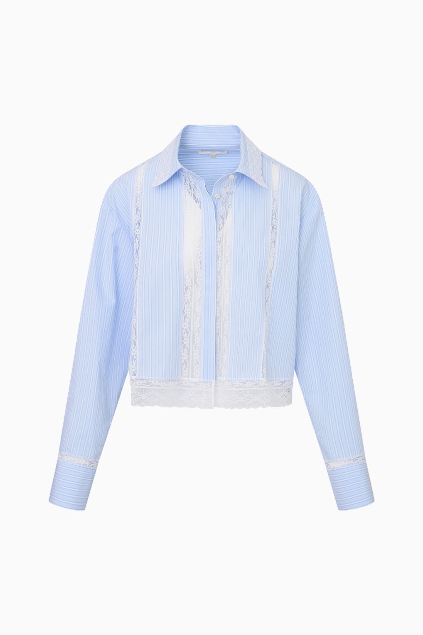 Introducing the Delano Top. This summer top debuts with a crisp poplin fabric with little contrasting strips of vintage-inspired laces. The feminine blouse hits at the natural waist and features the pretty laces on the body and sleeves. This piece is finished with buttons down the center front. Pair with the Portman Skirt for a full set.