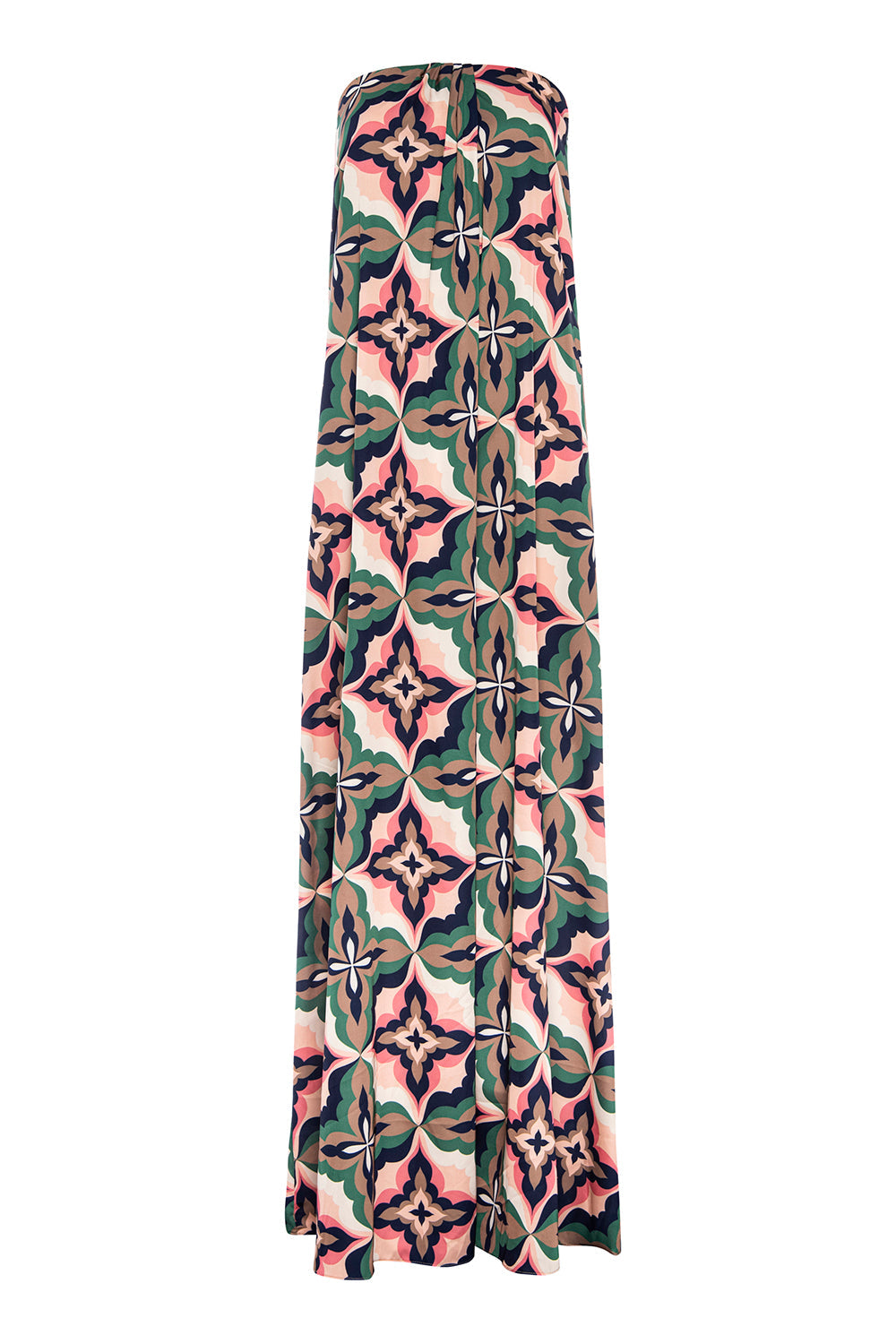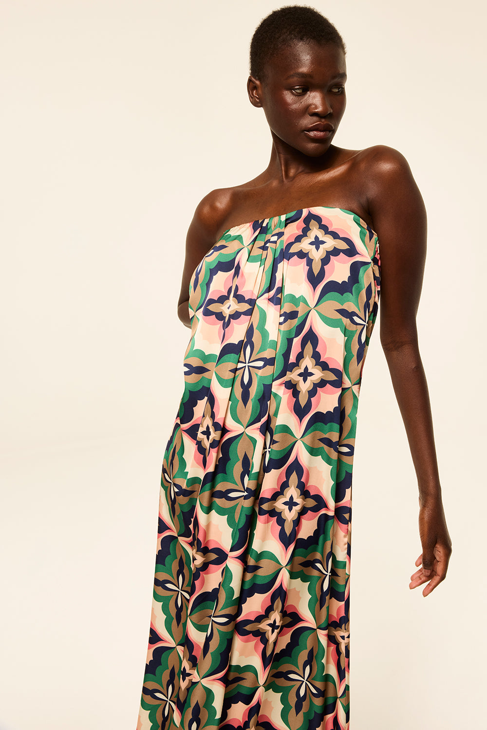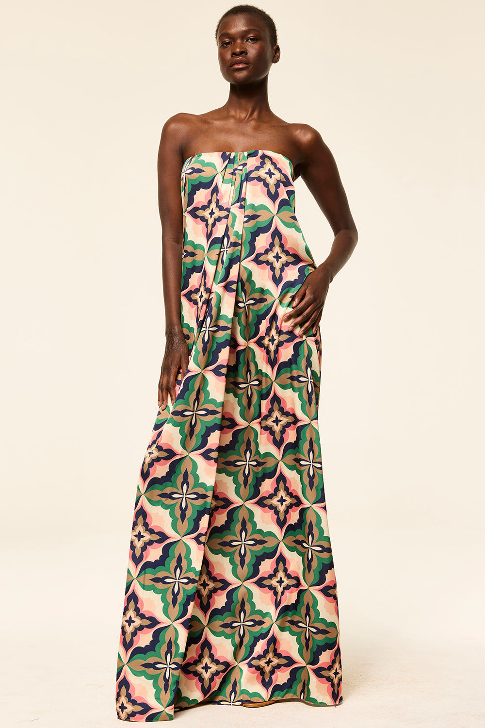 Divina is an effortlessly striking strapless maxi cut from our vibrant Prismatic Tile Coral–printed satin. Featuring soft front pleating and a clean, flowing silhouette, this style is finished with a hidden side zip closure for a seamless fit. Dress it up with heels or style it with flats for an easy, standout look.