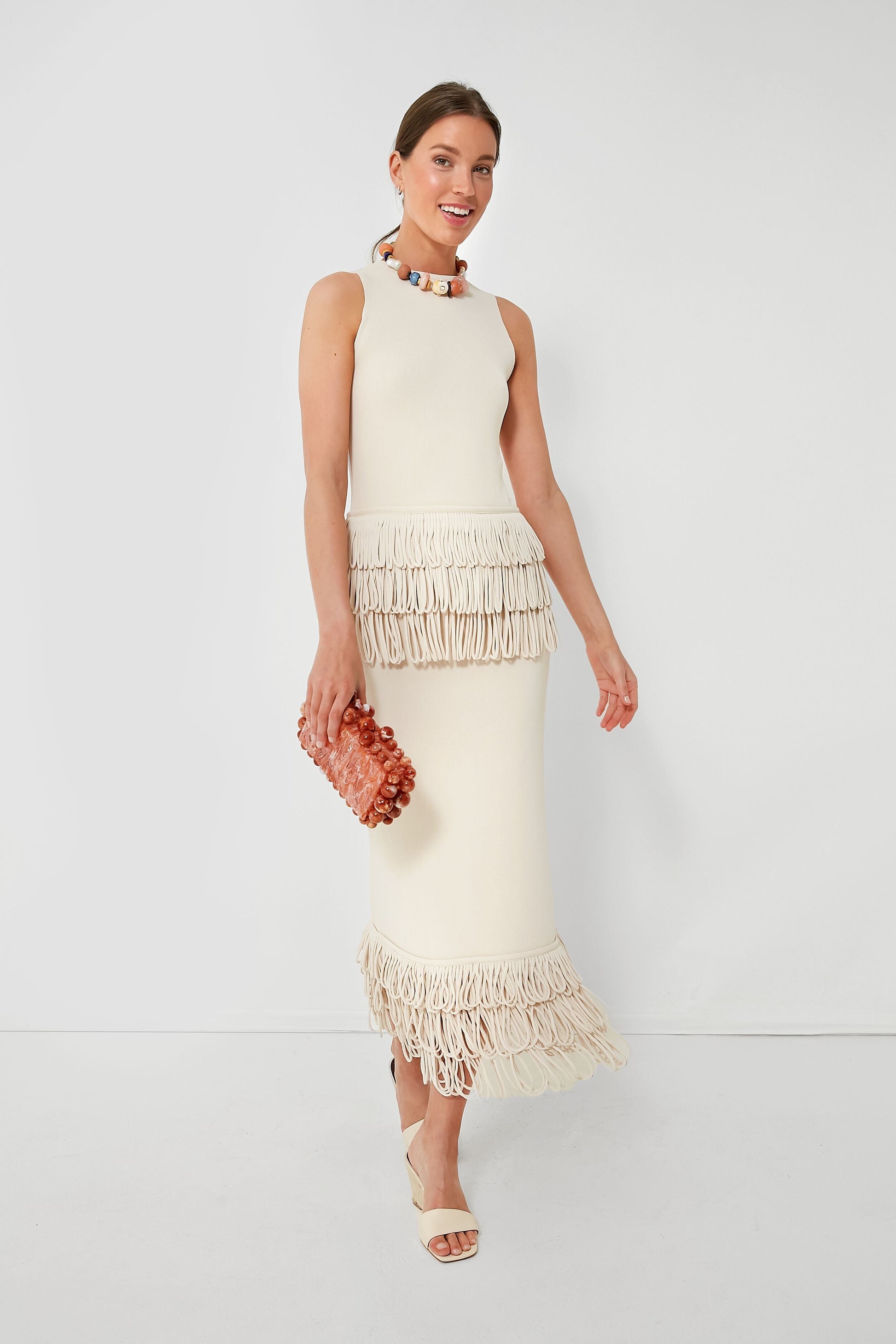 Combining a luxurious neutral colorway with intriguing texture, we love the versatility of the Ecru Sol Skirt. With an on-trend midi length, as well as a layered loop fringed hem that provides some swishy movement and plenty of drama, this silhouette is super cool while feeling effortless. Style this fun and funky number with the matching top and chunky jewelry for a showstopping date night look, or dress it down for everyday wear with an easy tank and sandals.