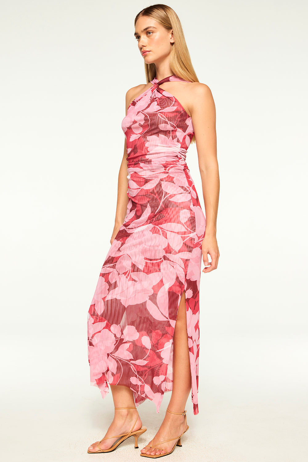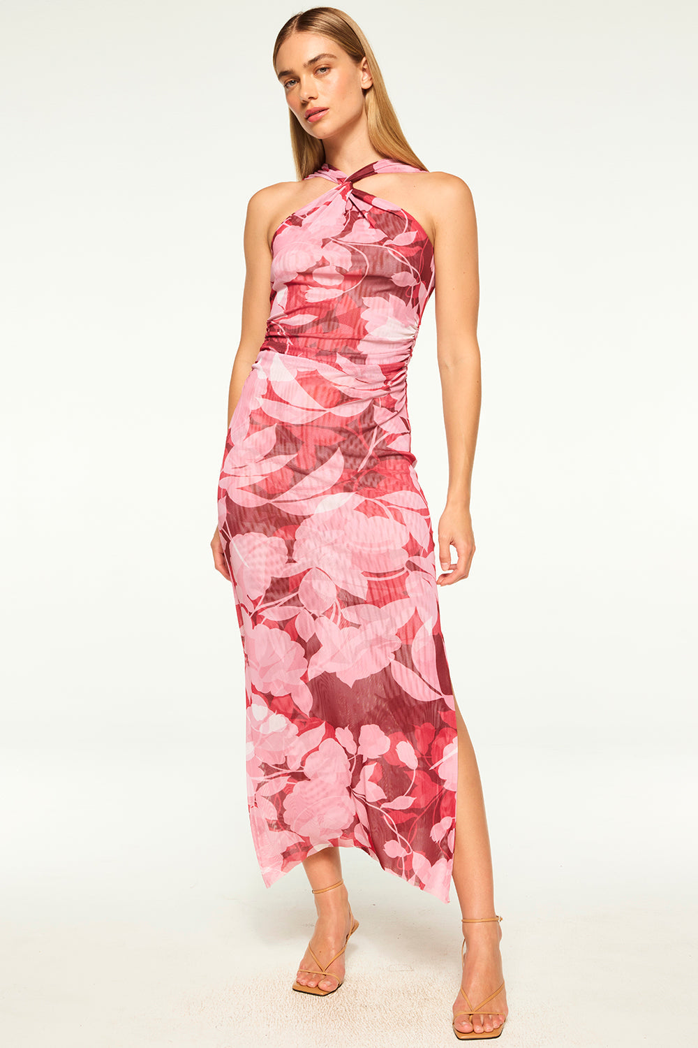 Elaine is an all new silhouette crafted from our Flora Rosada mesh. This bodycon maxi features a twist halter neckline and ruching at the waist for a flattering fit. Double side slits and double lined. Pair with your favorite strappy heels for the perfect event dress.