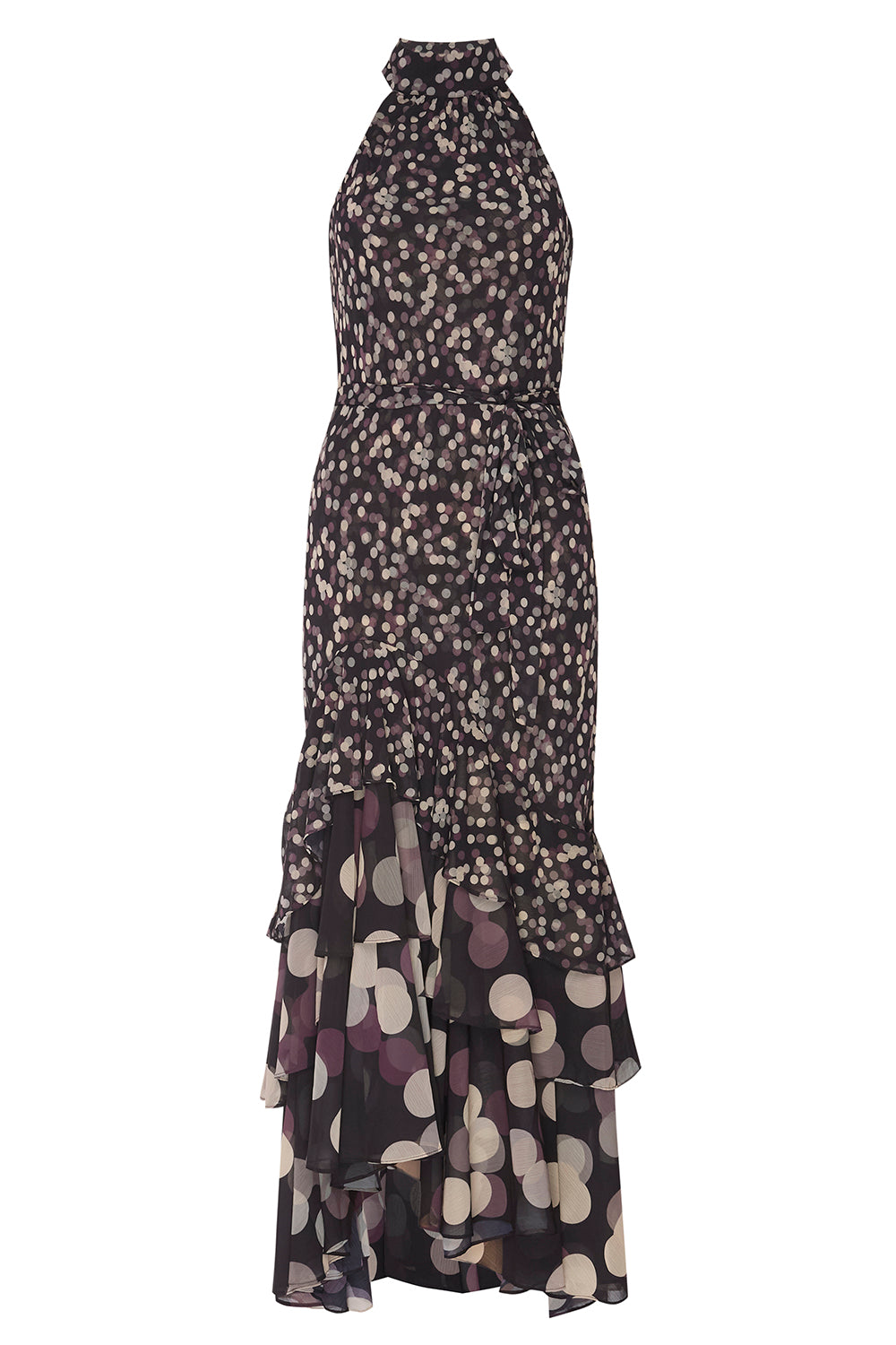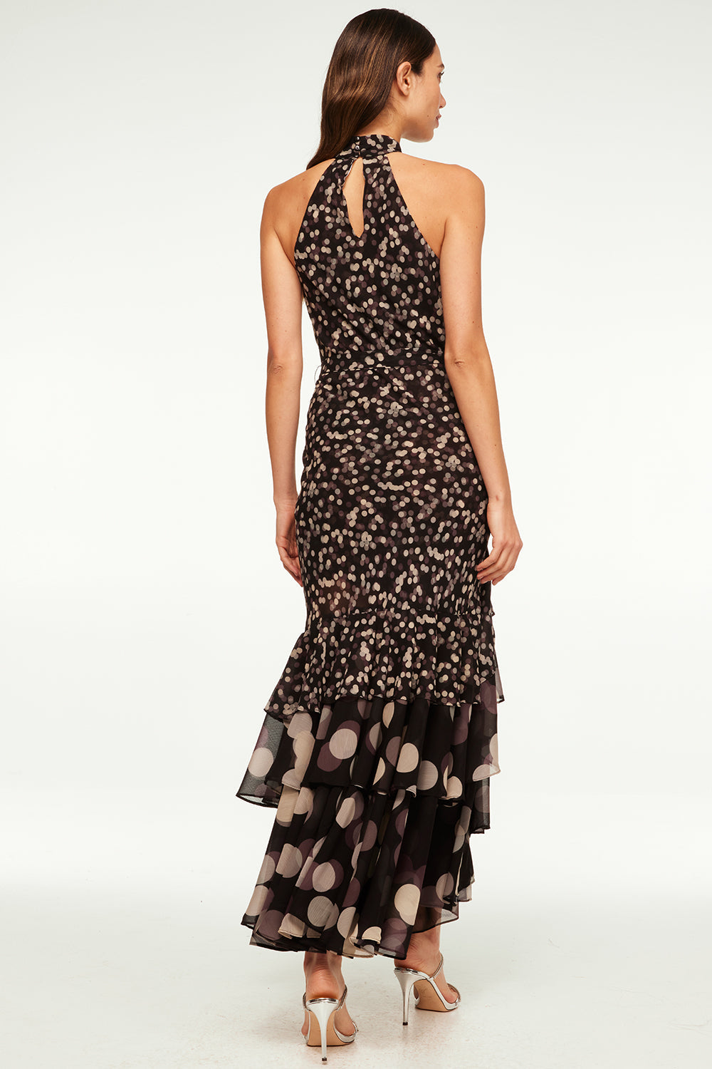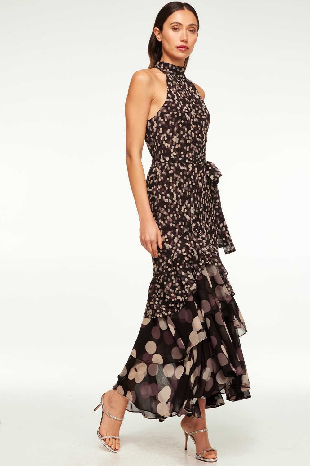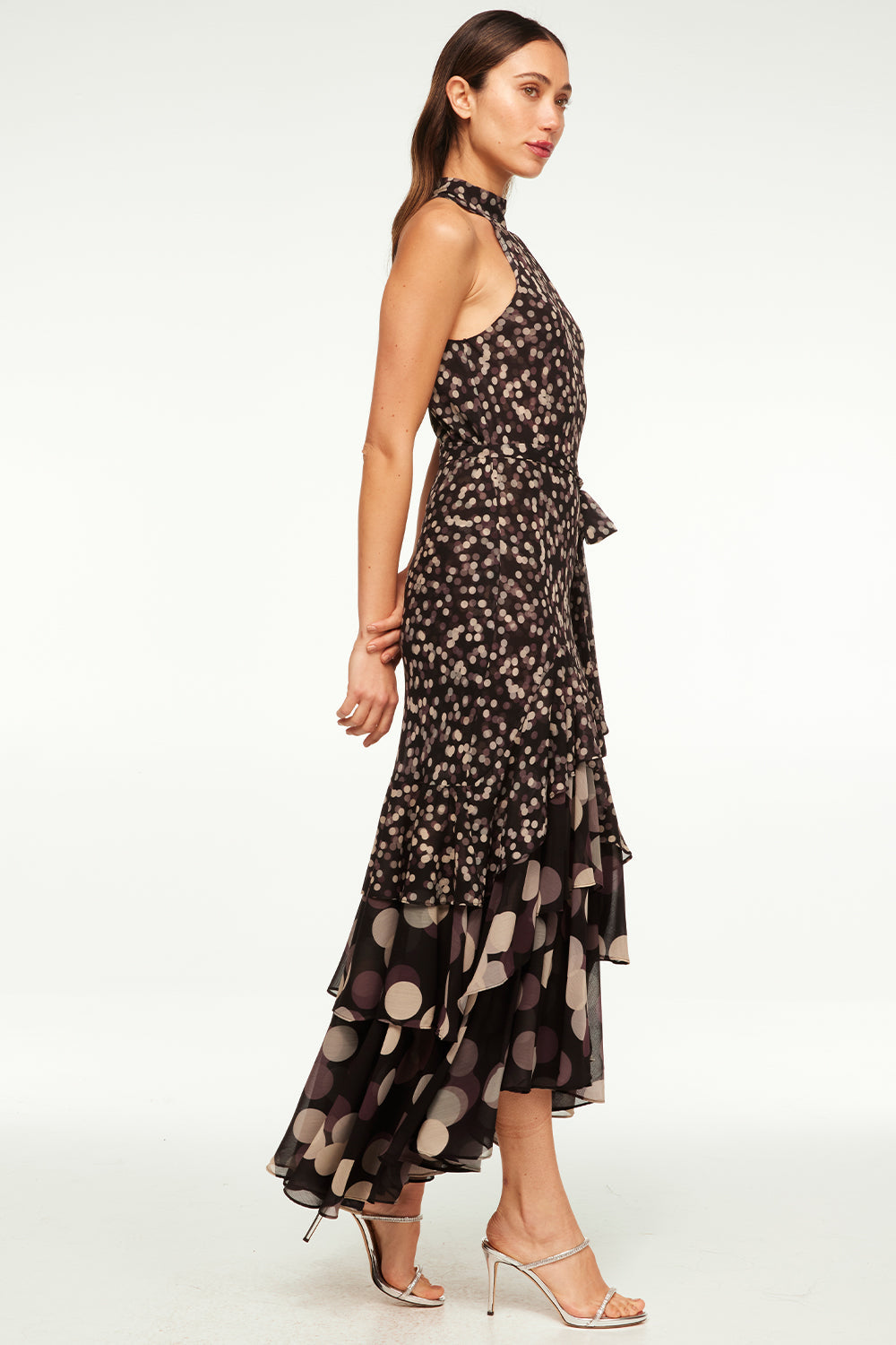 Our Eliana dress is cut from a mixed polka dot printed chiffon and features a sleeveless, halter neckline with back-button keyhole closure. This high-low midi silhouette features a tiered ruffle hem in larger scale polka dots. An optional self-tie belt. Slipover style. Dress up with glittering heels and a matching clutch or with this season's must-have knee high boots.
