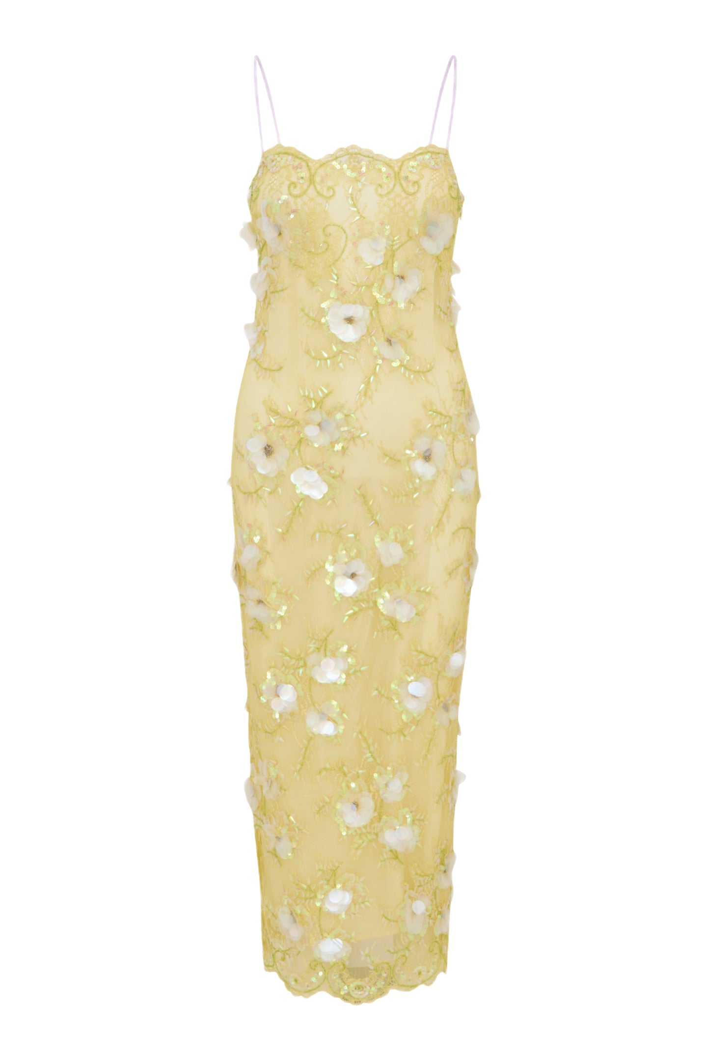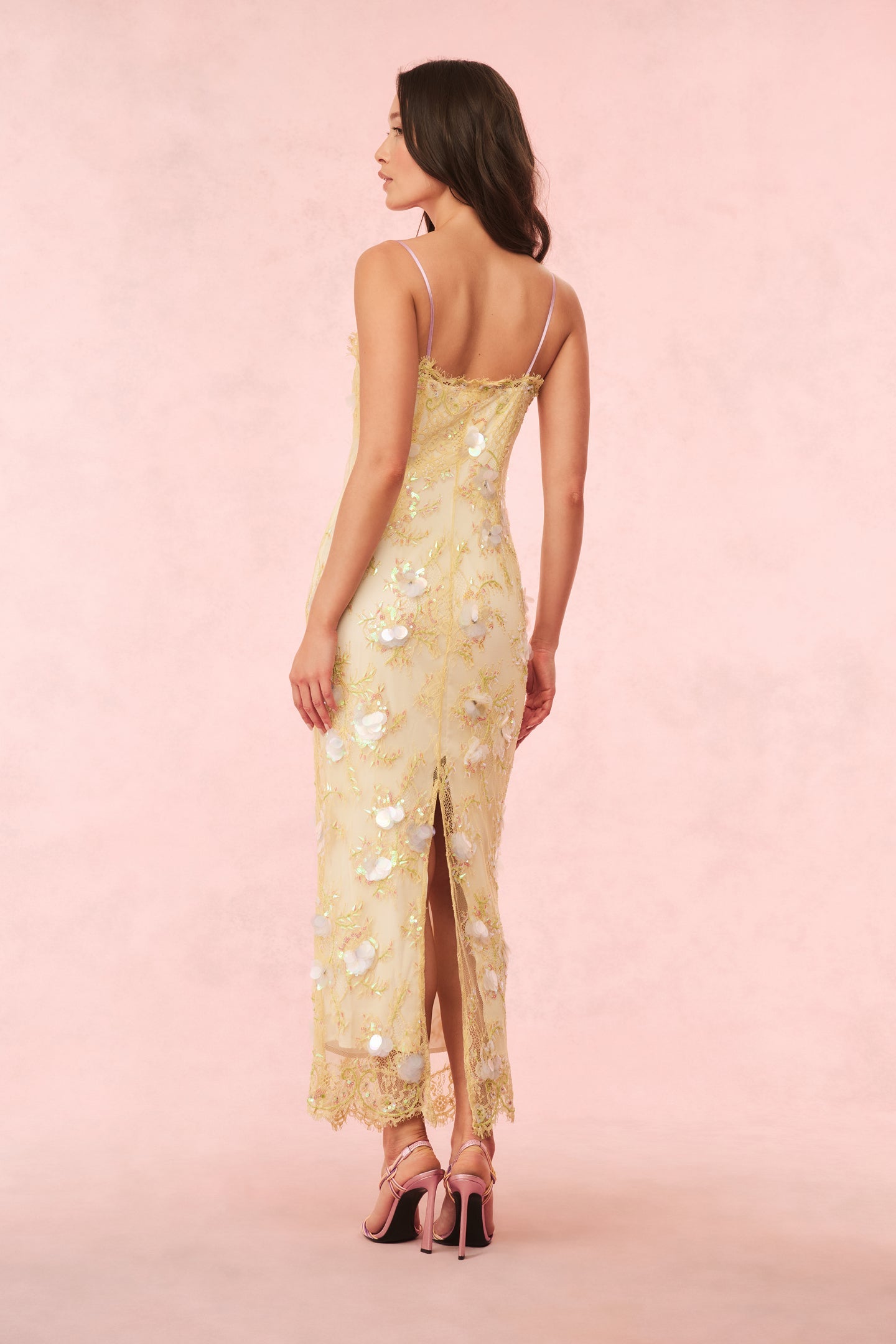 Dressed for sunshine in the Emalia Dress. This gorgeous dress is a piece of art in itself hand-embellished with a beautiful, springtime medley of delicate, chantilly lace, stunning, three-dimensional payette flowers, and sequin vines all over. The maxi, column dress features spaghetti straps and a center back slit. This piece is finished with a zipper and is lined with chiffon.