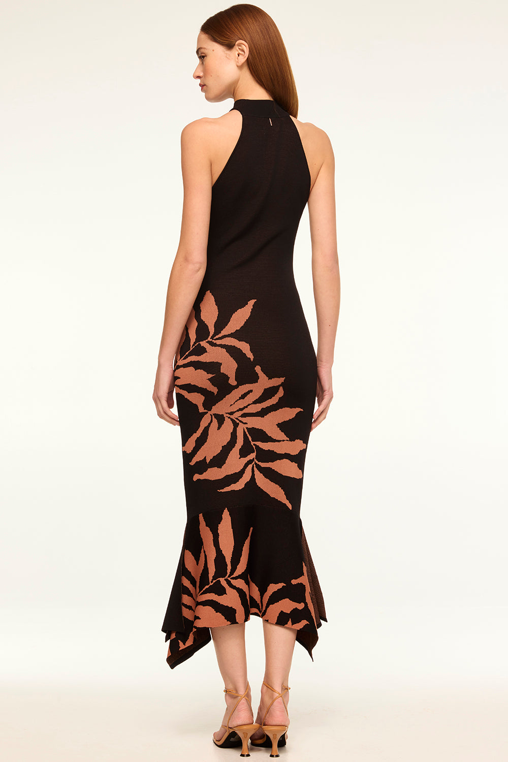 Our figure-hugging knit Ember midi dress features a botanical fern motif and halter neckline. This sleeveless silhouette is pullover style with a modern handkerchief hem. The perfect dress for any occasion on your social calendar.