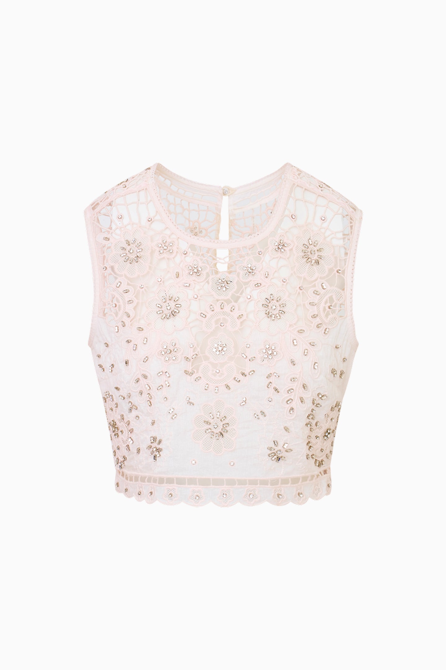 Introducing the Emerson Top. This elevated event piece stuns with a structured cotton, organdy fabric embellished with beautiful, artisanal rhinestones, beading, and floral eyelet details. Romantic and lightweight, the top is slightly sheer and delicate with cropped sleeves, a crewneck, a straight shape, and a keyhole detail at the back. Hitting at the natural waist, the top is finished with a side seam zipper. Wear with the Reeves Skirt for a full set.