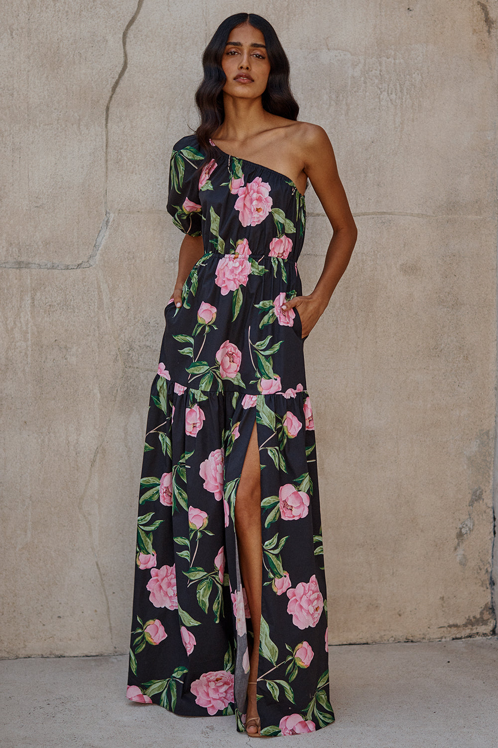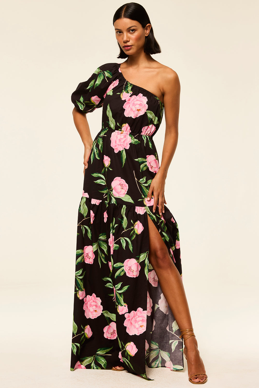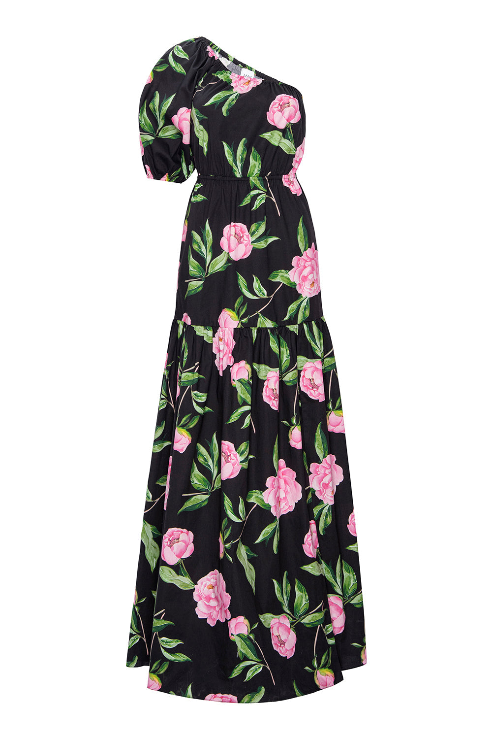 Our new floor-length Eve gown is crafted from Pink Peony printed cotton poplin on a black ground. This one-shoulder silhouette features an elasticated bust, a puffed short sleeve, and a flattering elastic waist. The fitted skirt flows into a wide ruffle hem with a leg-baring slit — perfect for this season's warm-weather formal events.