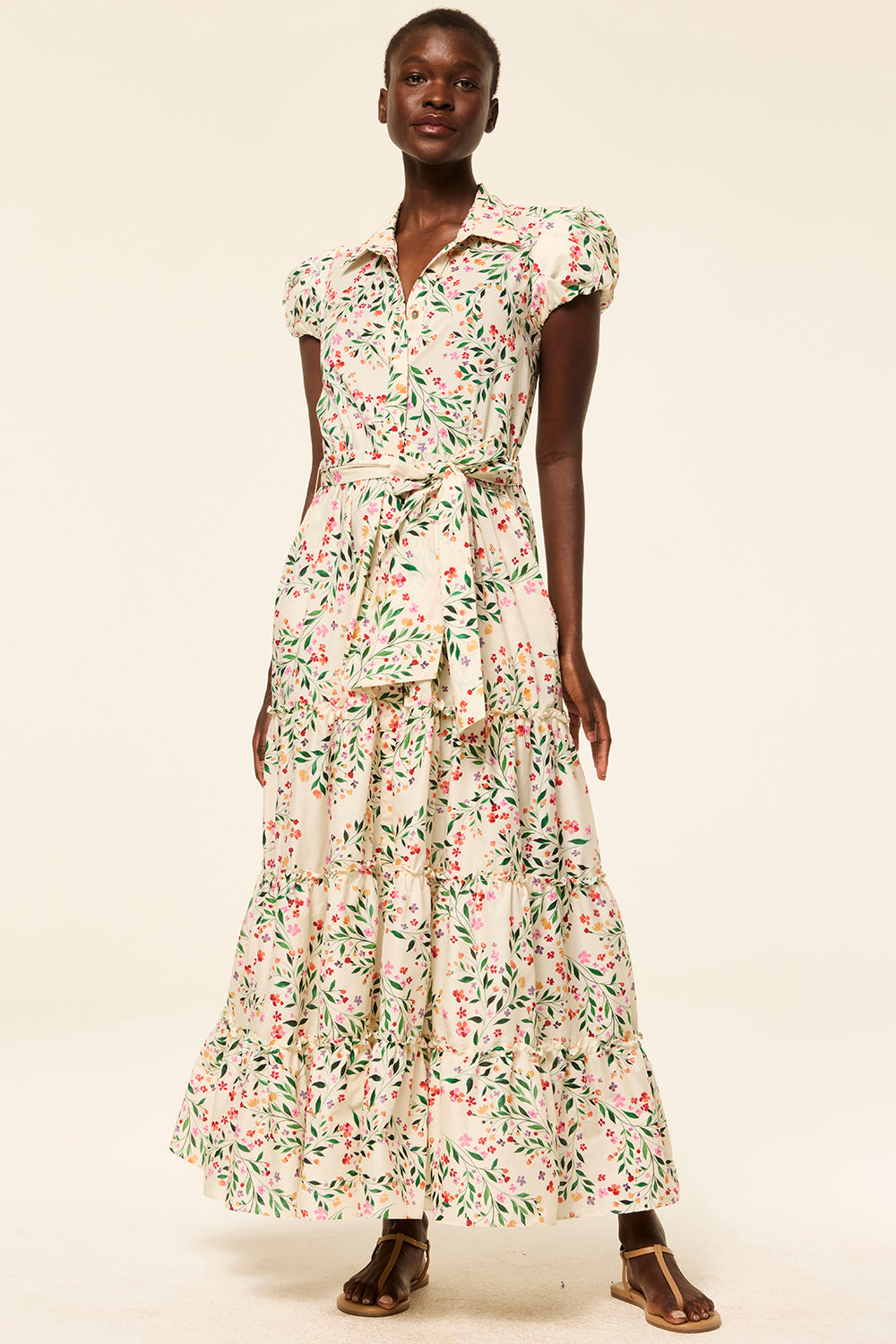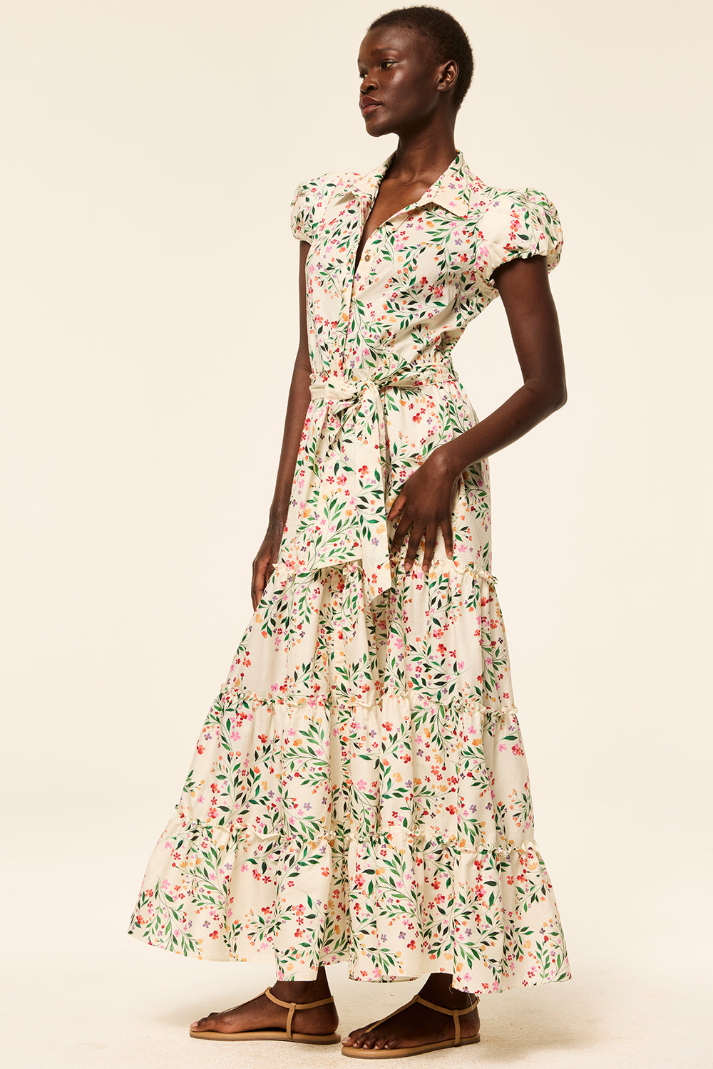 Effortless and feminine, our classic Eveleigh dress is handcrafted from a soft cotton in a timeless Spring Ditsy print. The button-front closure runs from the neck down the length of this maxi silhouette, while a self-tie waist cinches for a flattering fit. Short puff sleeves and a fold-over collar complete this comfortable yet chic style.