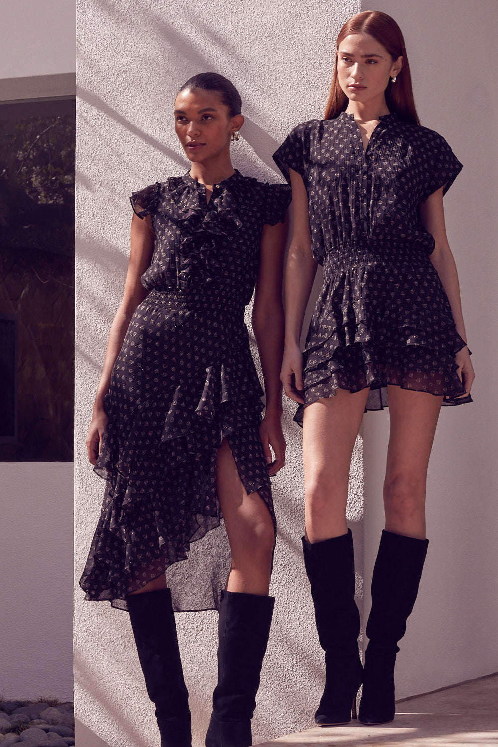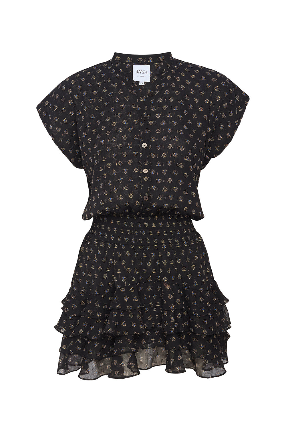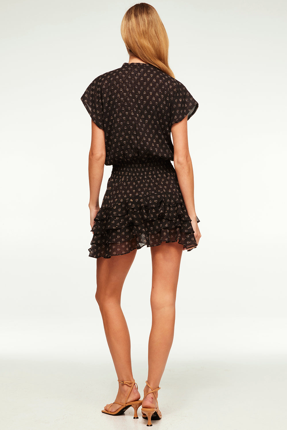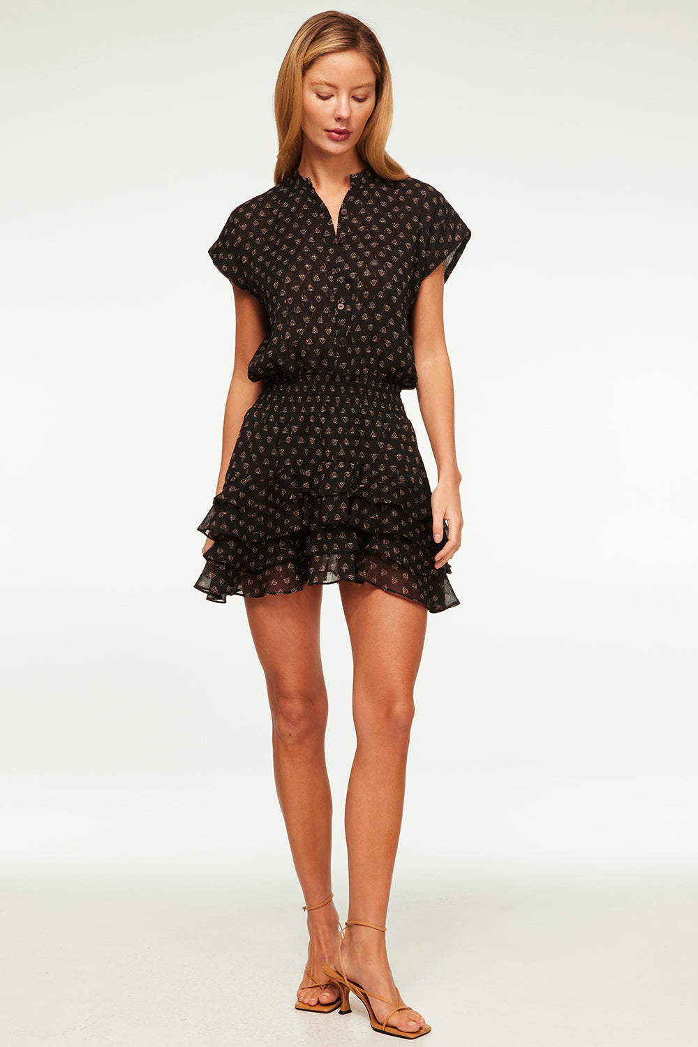 An effortless and versatile mini silhouette cut from a Black Lapis Eye printed crinkle chiffon with lurex clip dots. Featuring a double-lined self-covered button-down bodice, smocked elastic waistband and layers of asymmetric tiered ruffles to finish the skirt. This best-selling style is flattering and versatile.